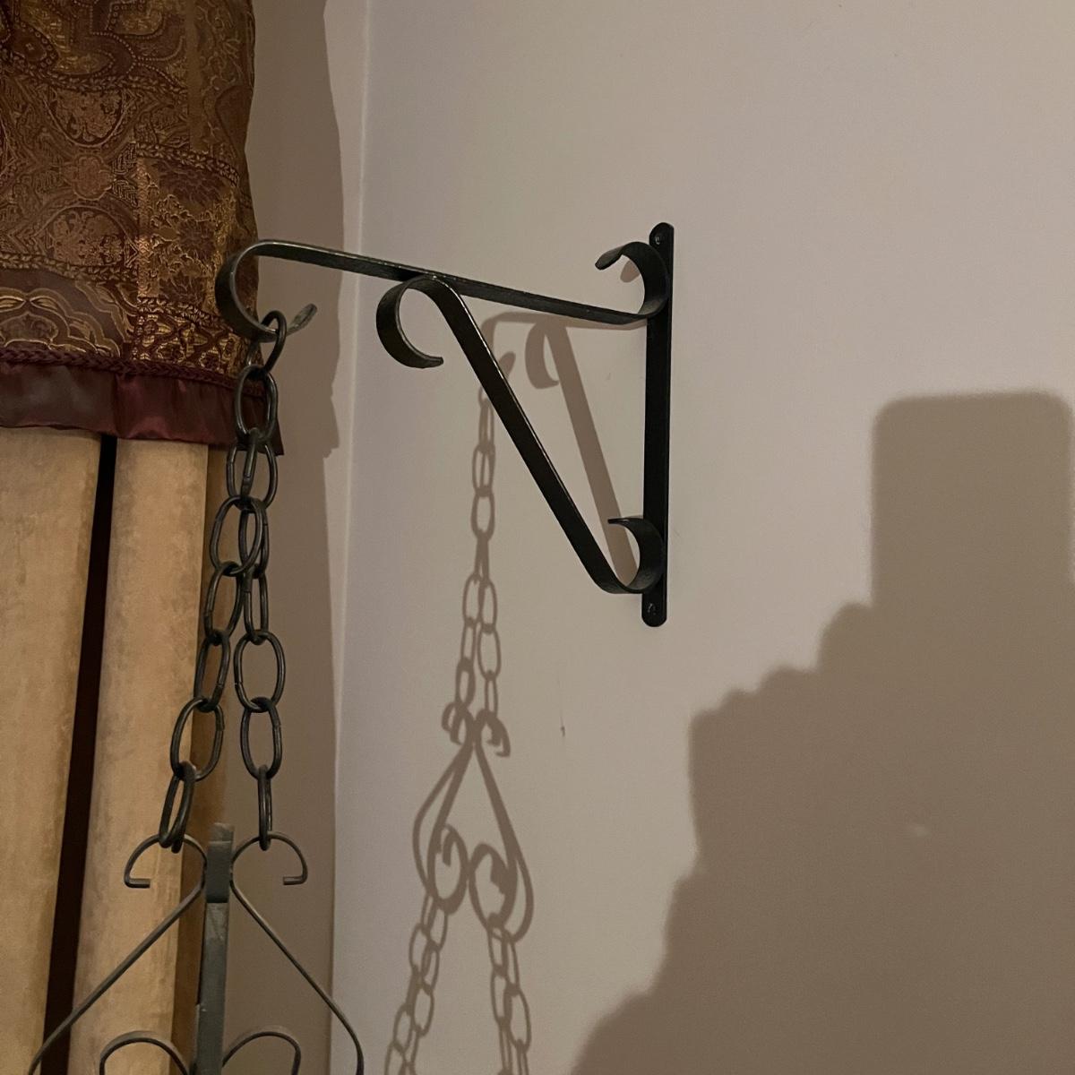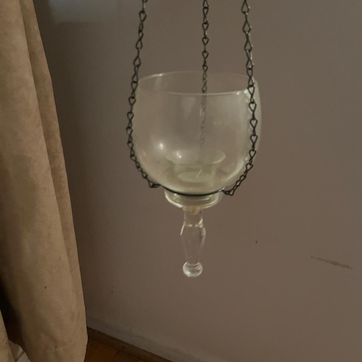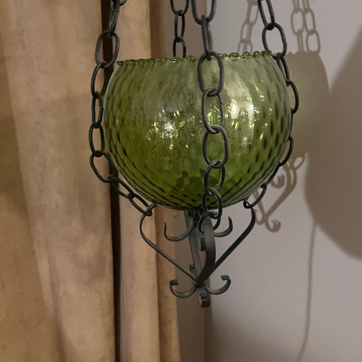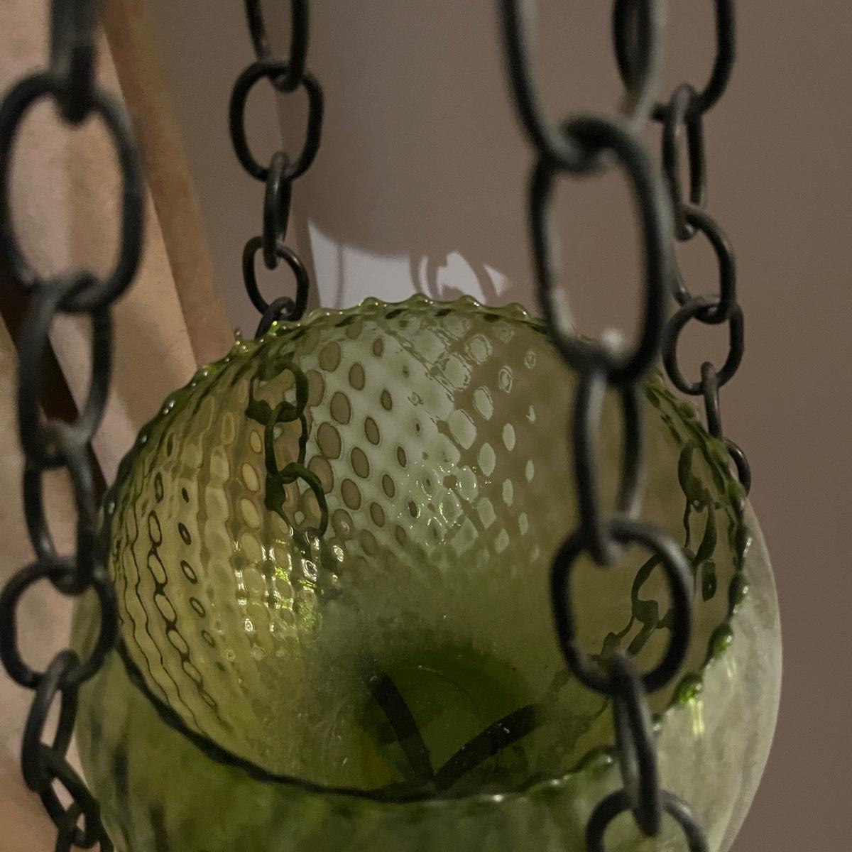 Lot includes one green glass bowl with chain and metal hanger. Also includes a clear glass bowl with chain hanger, as well as the wall bracket. Largest piece measures 8”D x 31”H. Winning bidder will need to take down the bracket, flat head screwdriver is needed.