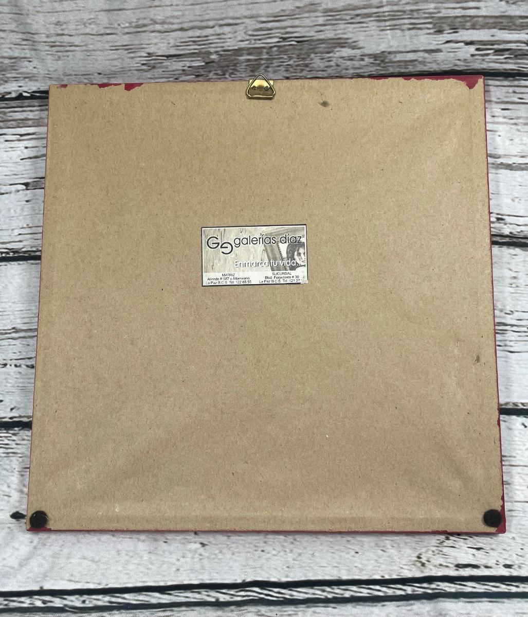 This item is in great condition. The red frame does have discoloration in some areas. The front of the picture reads: “two hearts in sink with each other.” This frame is an 11x11”. On the back, there is a metal piece included to help hang the frame.