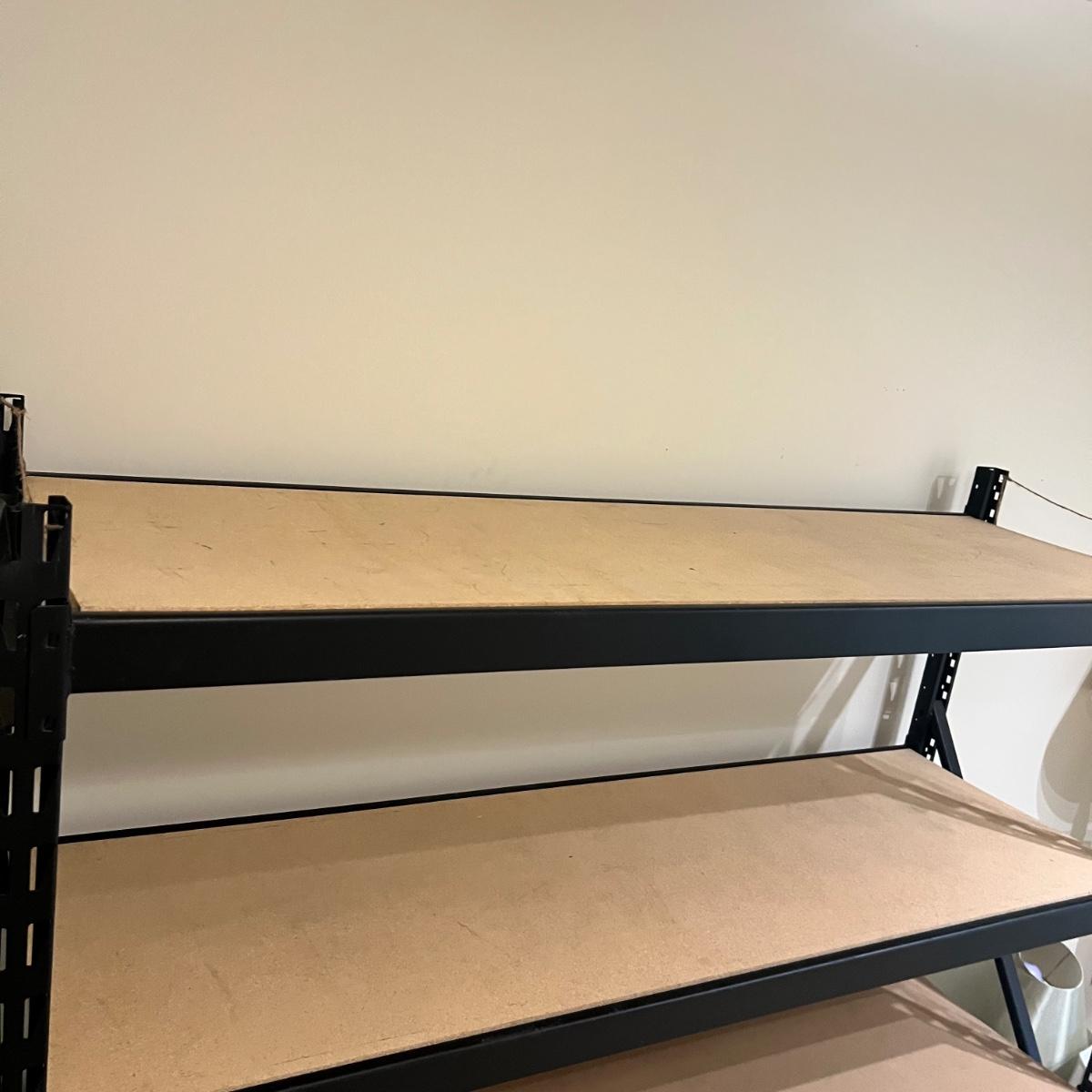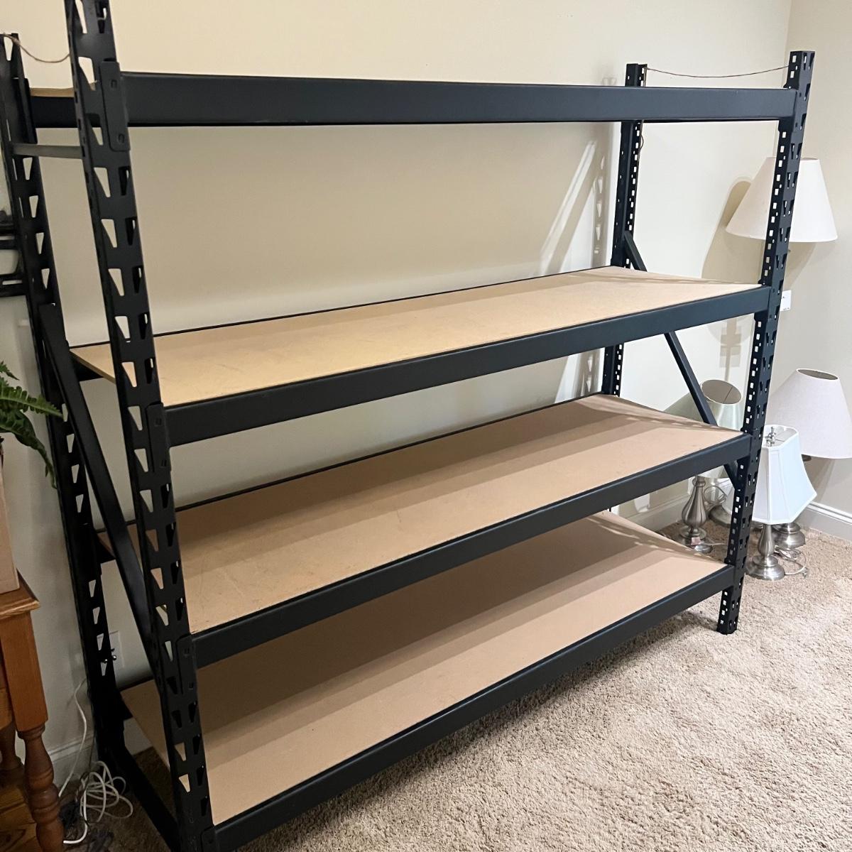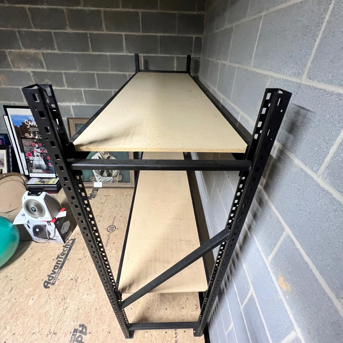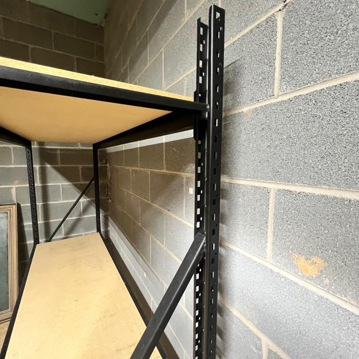 Two almost identical units with the only difference being one unit has more shelves, see pics. Both units are very sturdy powder coated black steel. They are fairly lightweight and have removable particleboard shelves. Shelves are adjustable and interchangeable. Winning bidder will need to dismantle shelves to bring upstairs. No tools are required; winner may want to bring a mallet to help dislodge shelves.
