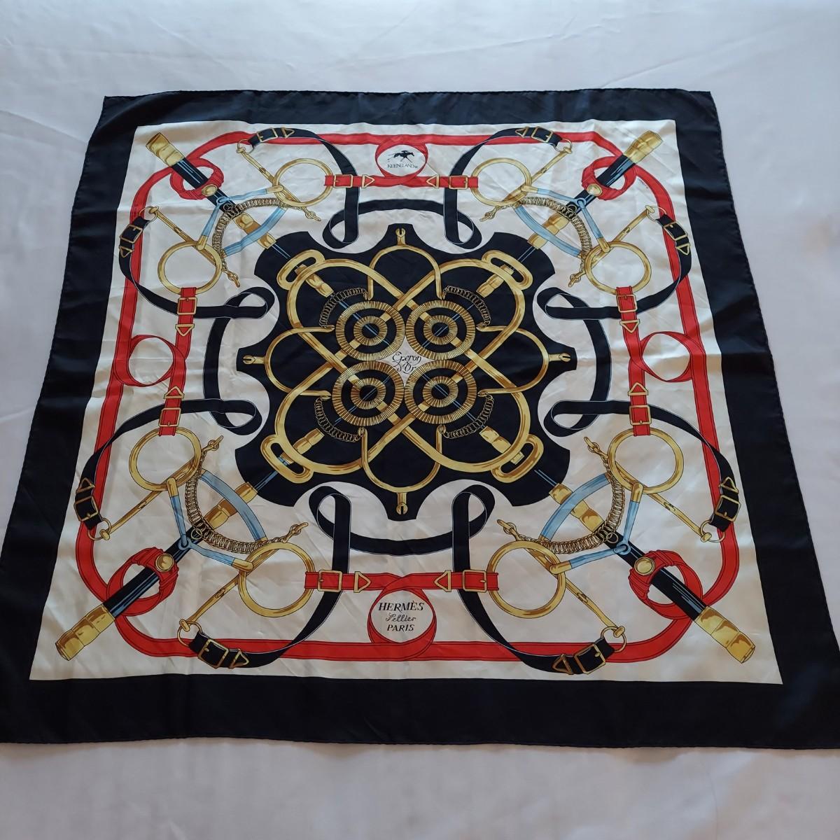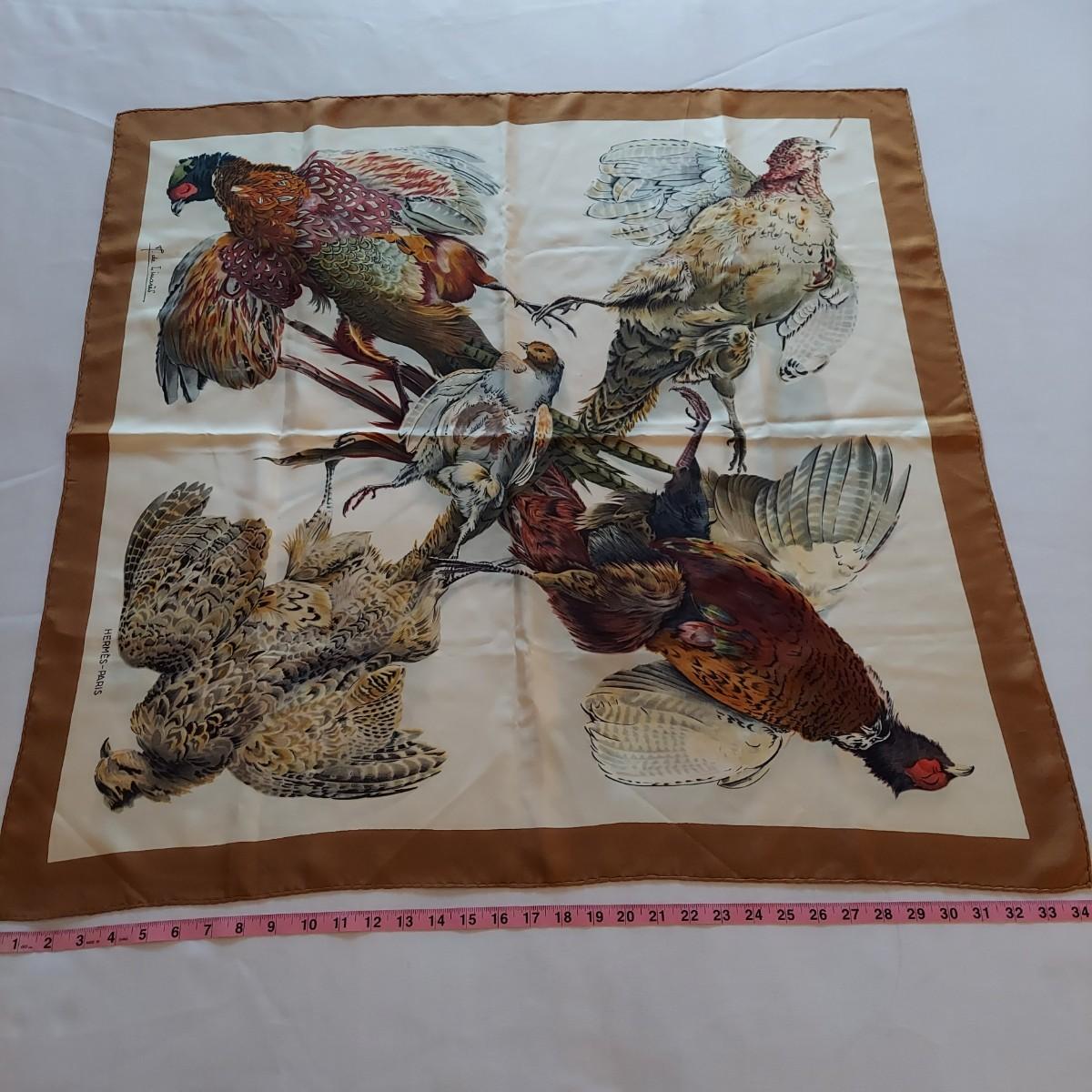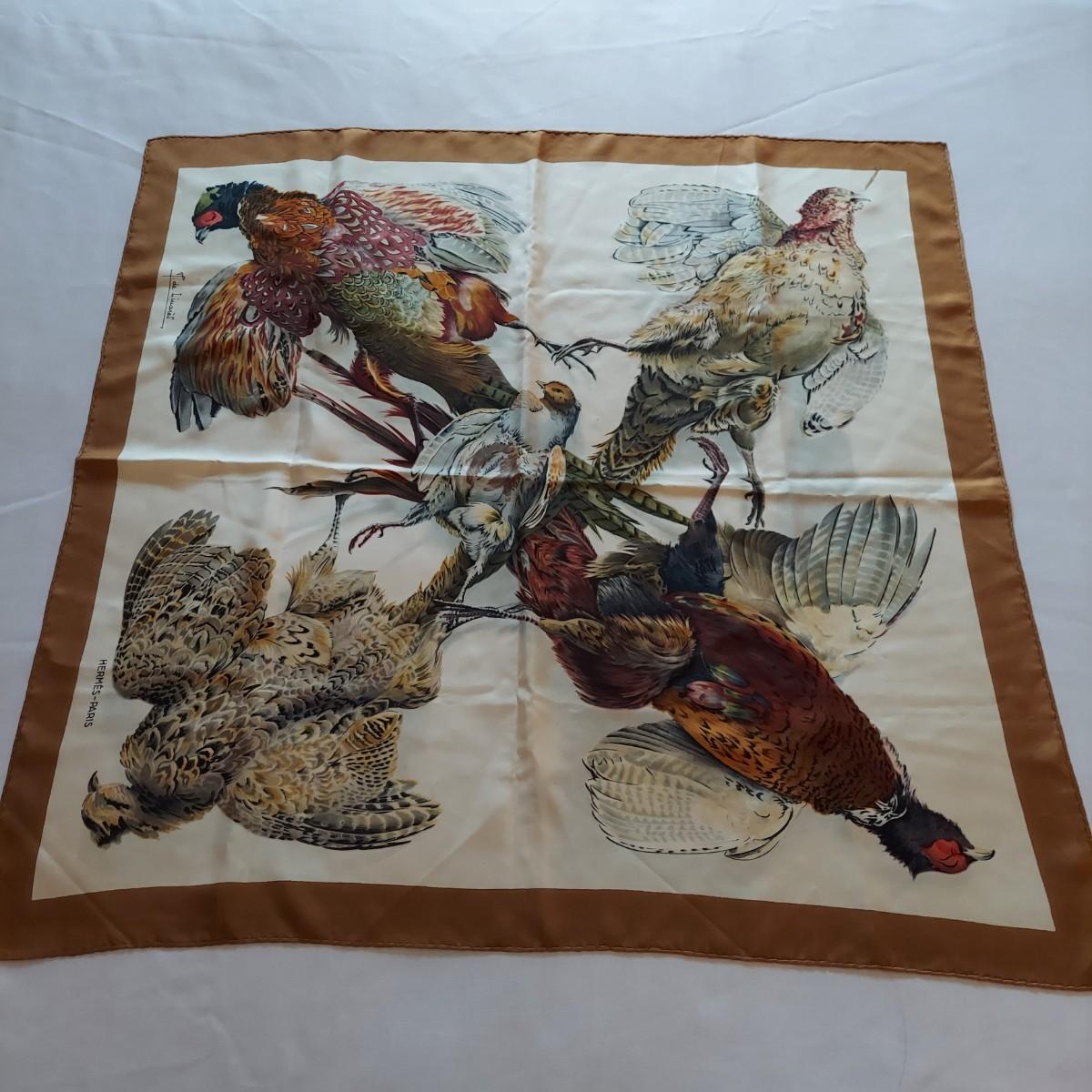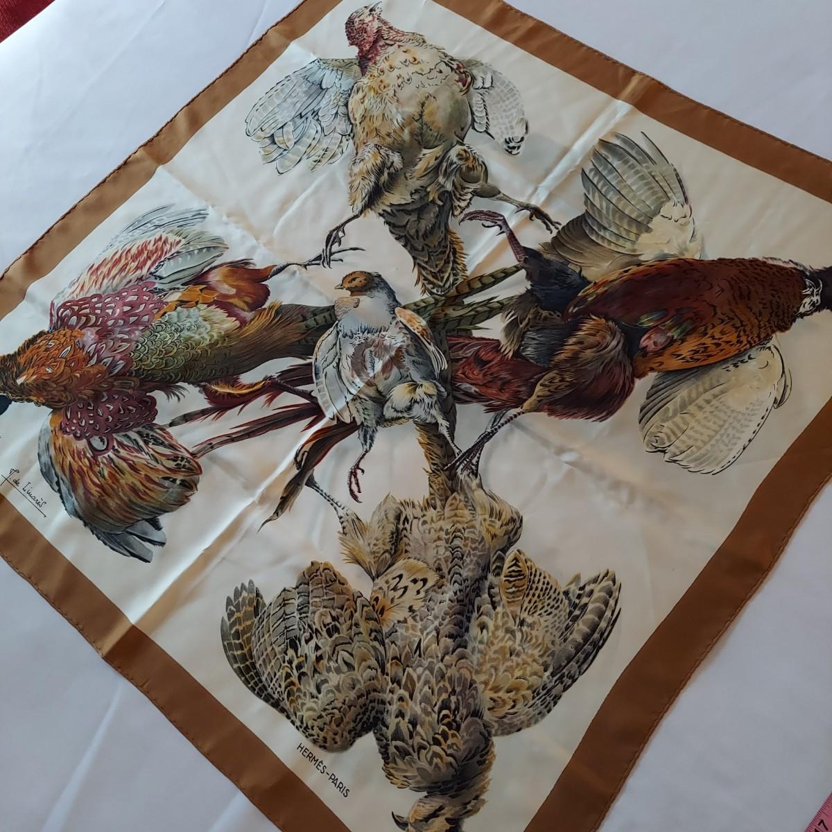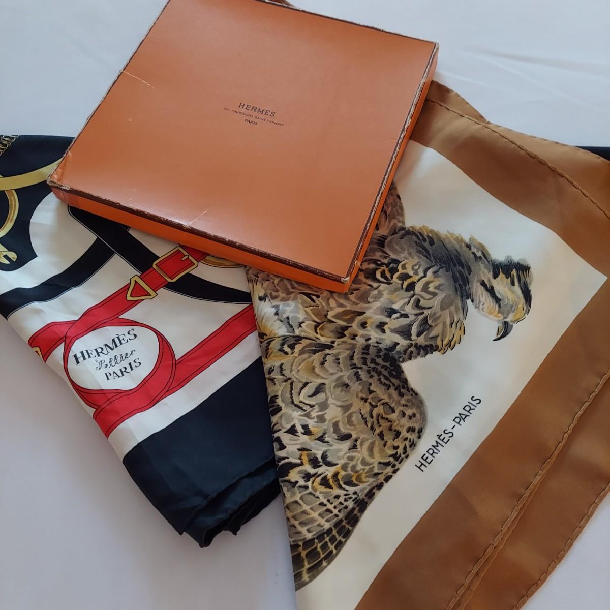 Two square scarves that appear to be silk and made by Hermès. The black, red and gold 'Eperons D'or' and the tan and cream 'Belle Chasse' prints. Each is approximately 35"SQ and has a rolled edge. One has a sewn in tag, the other does not. The 'Belle Chasse' scarf with bird print has some condition issues. Please see photos. Shipping available