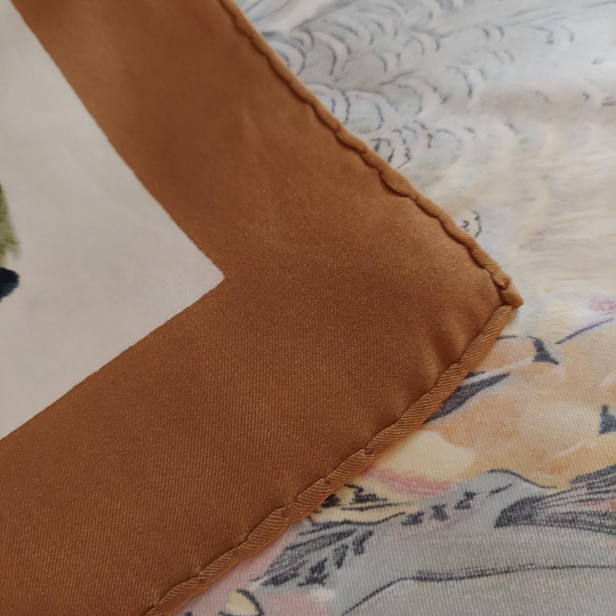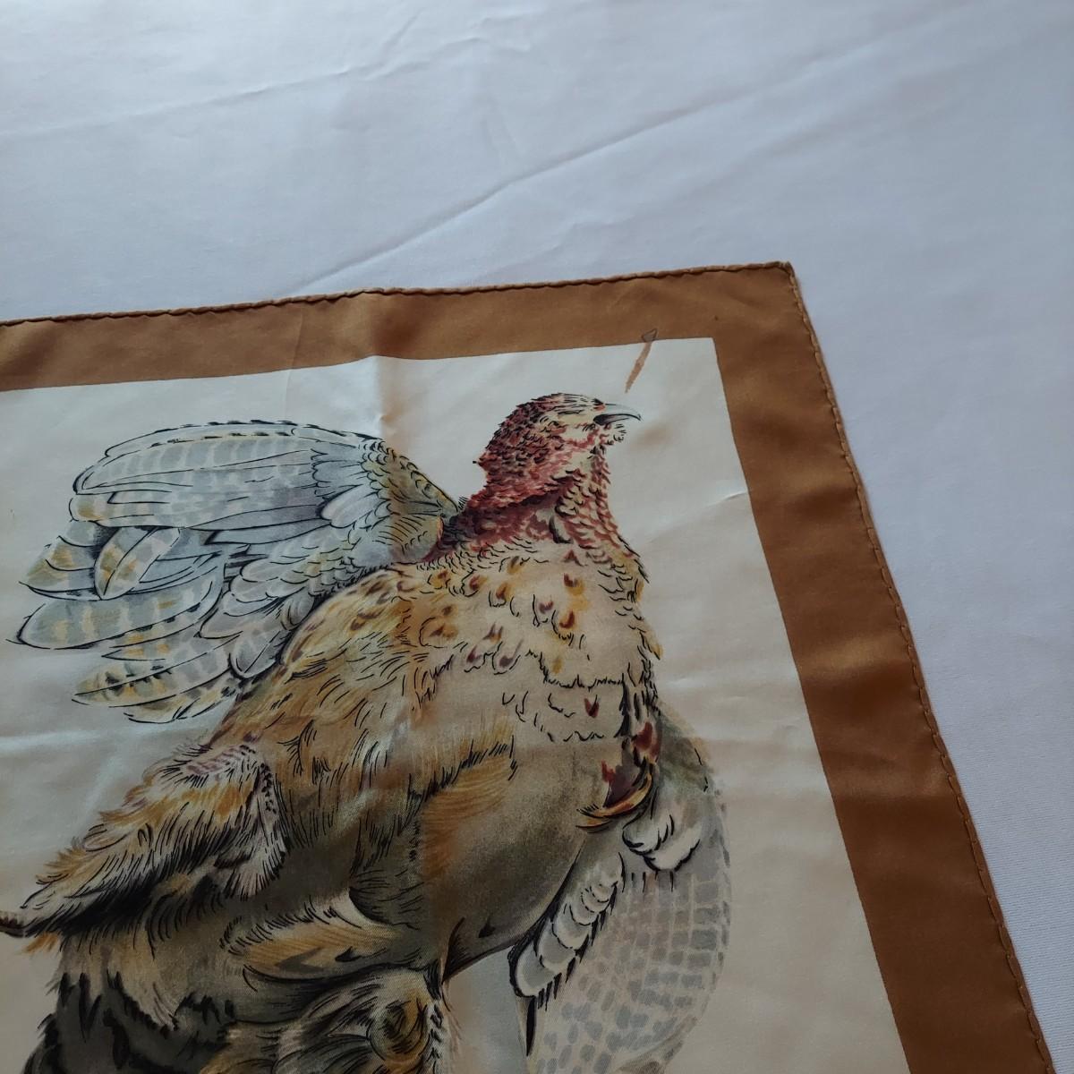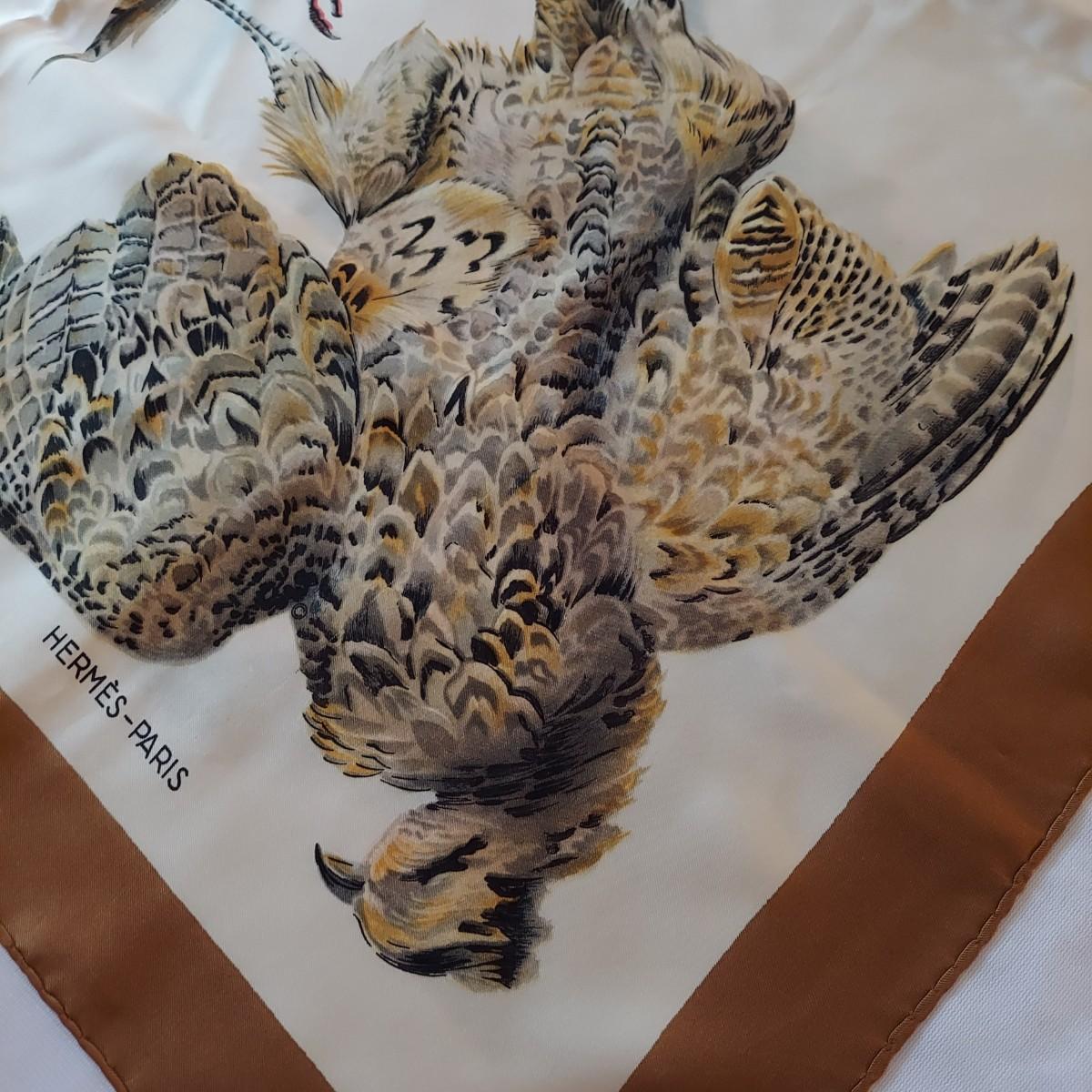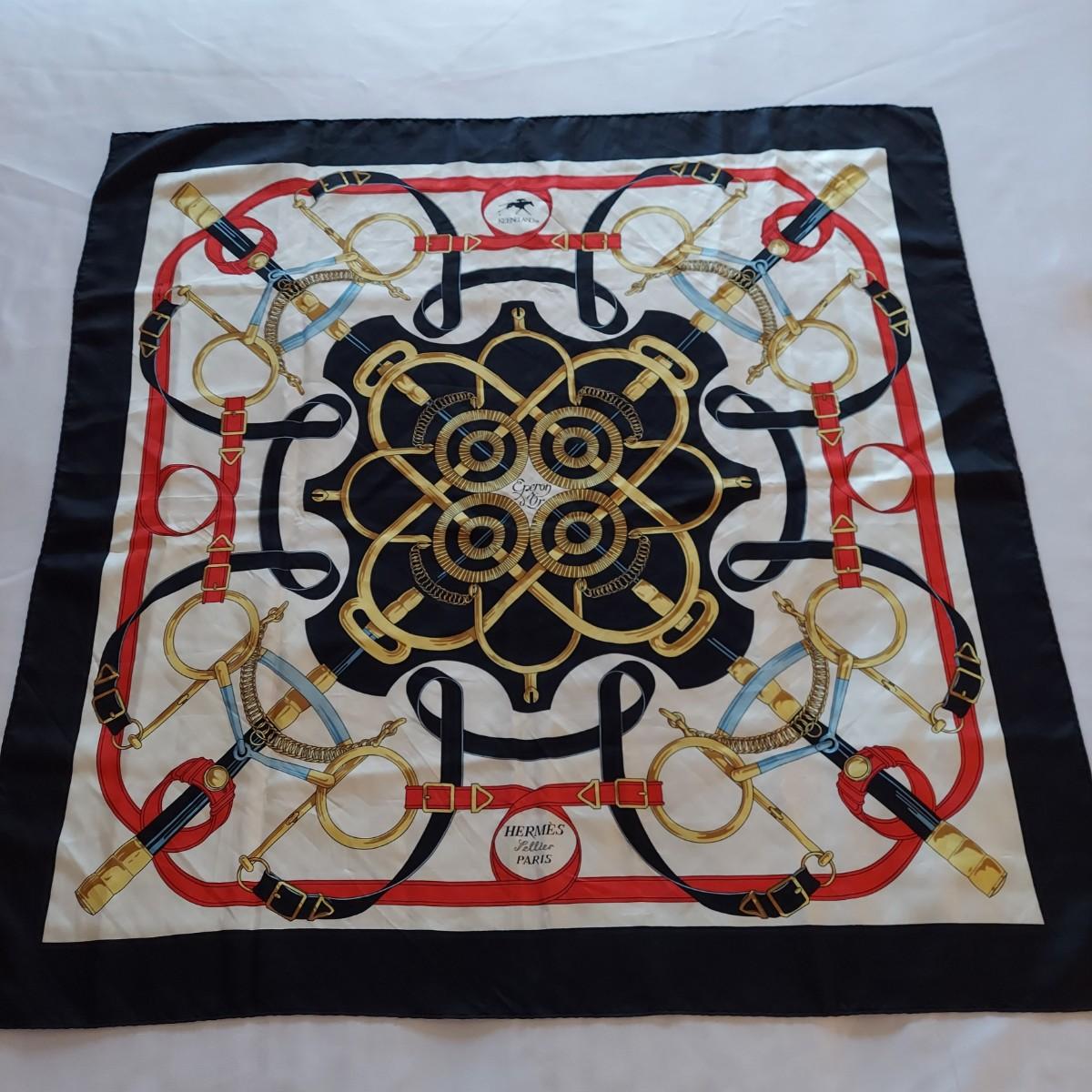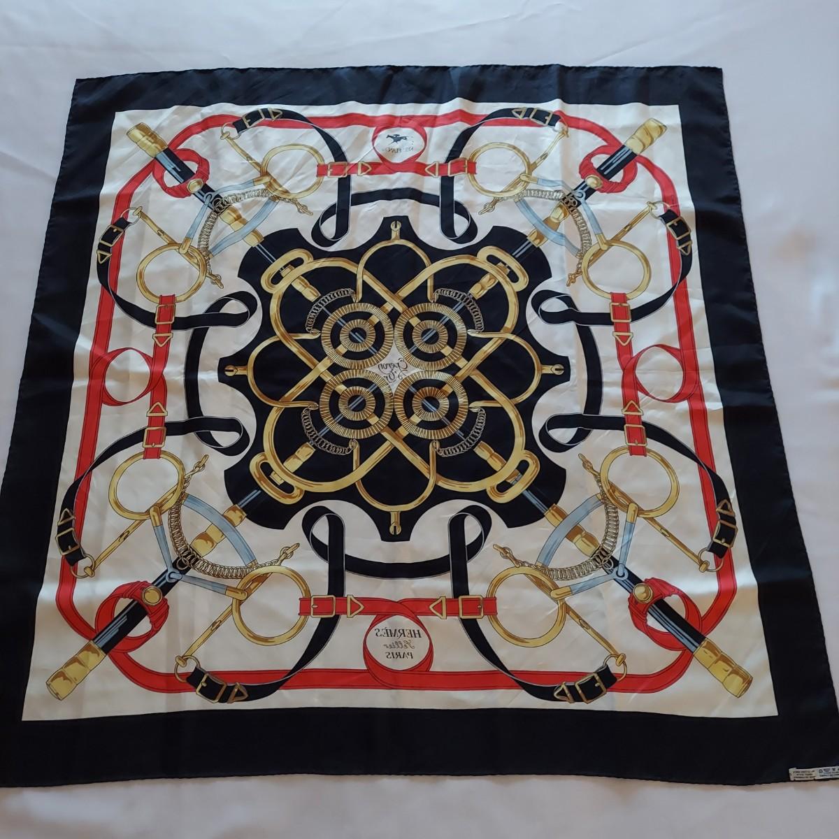 Two square scarves that appear to be silk and made by Hermès. The black, red and gold 'Eperons D'or' and the tan and cream 'Belle Chasse' prints. Each is approximately 35"SQ and has a rolled edge. One has a sewn in tag, the other does not. The 'Belle Chasse' scarf with bird print has some condition issues. Please see photos. Shipping available
