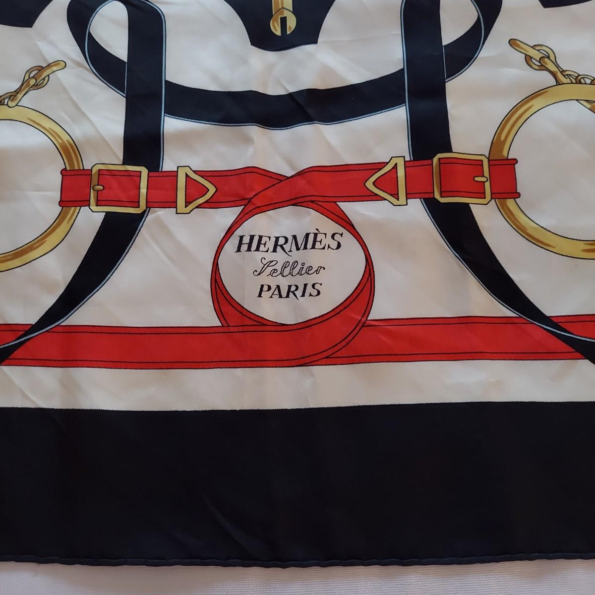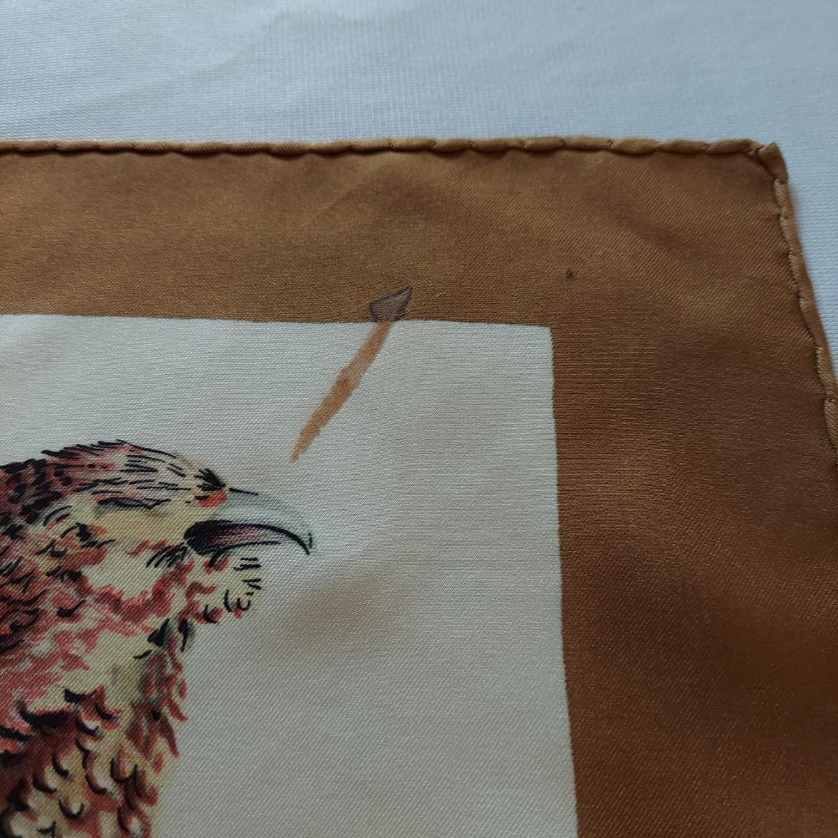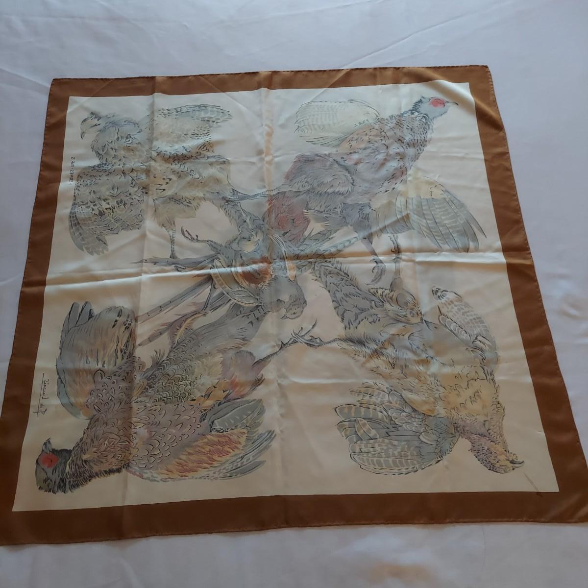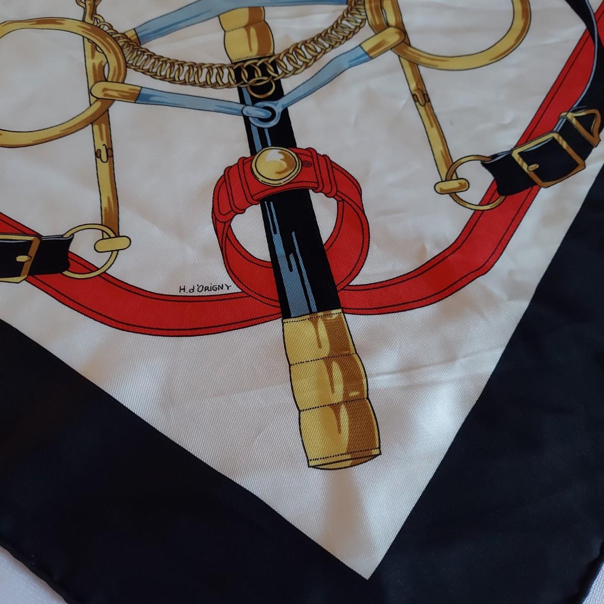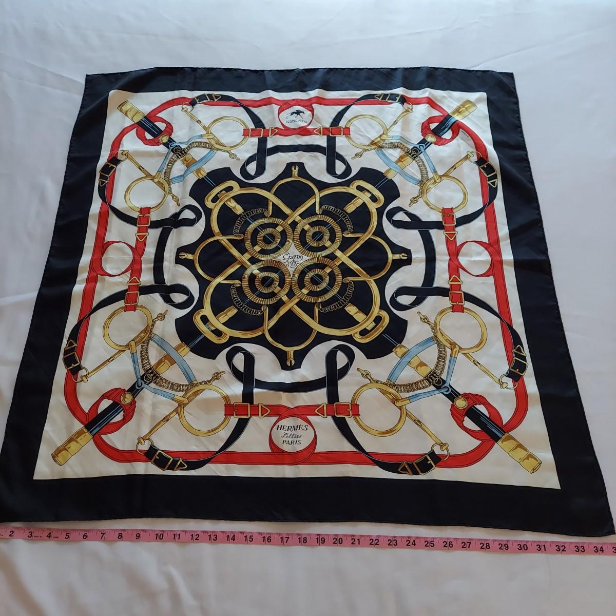 Two square scarves that appear to be silk and made by Hermès. The black, red and gold 'Eperons D'or' and the tan and cream 'Belle Chasse' prints. Each is approximately 35"SQ and has a rolled edge. One has a sewn in tag, the other does not. The 'Belle Chasse' scarf with bird print has some condition issues. Please see photos. Shipping available