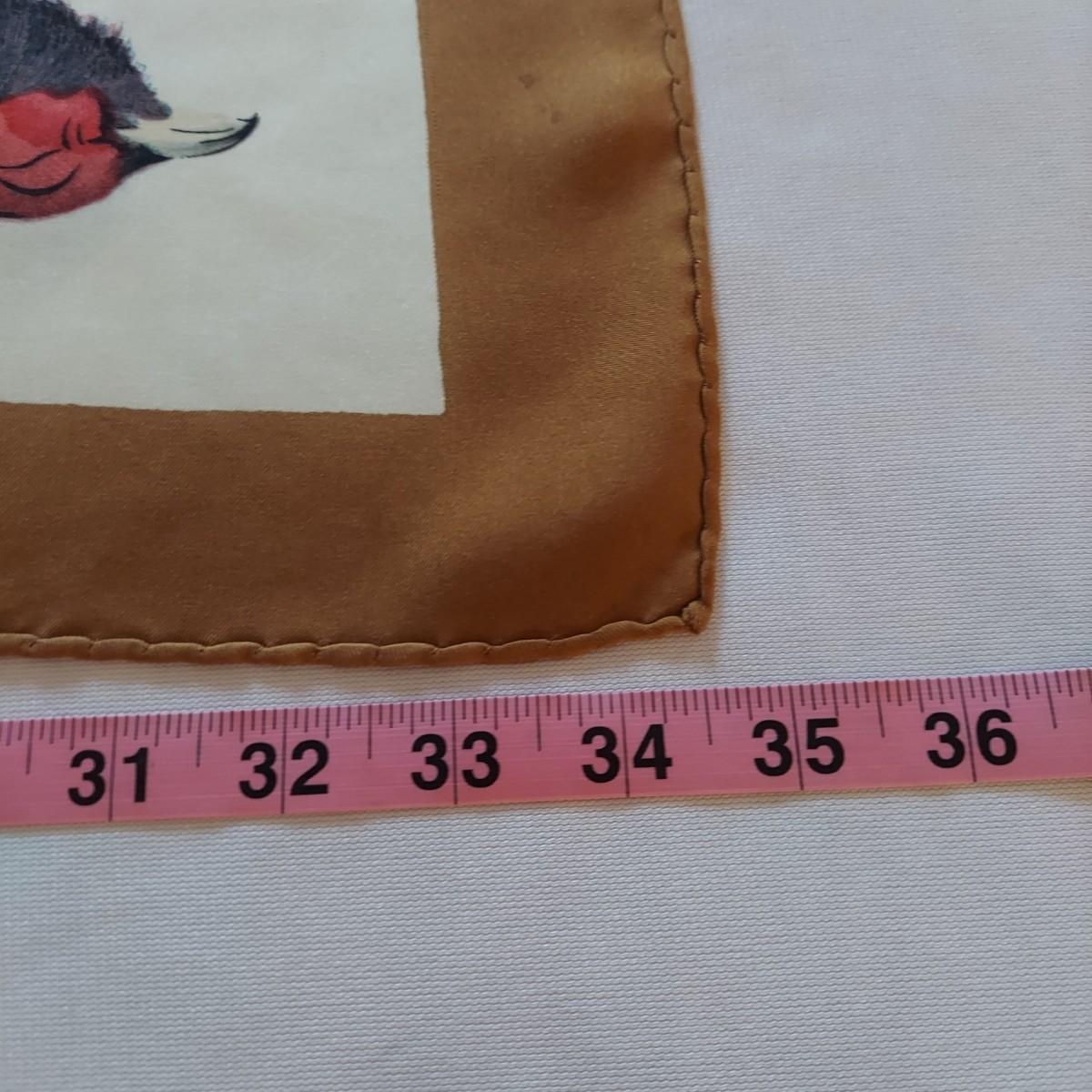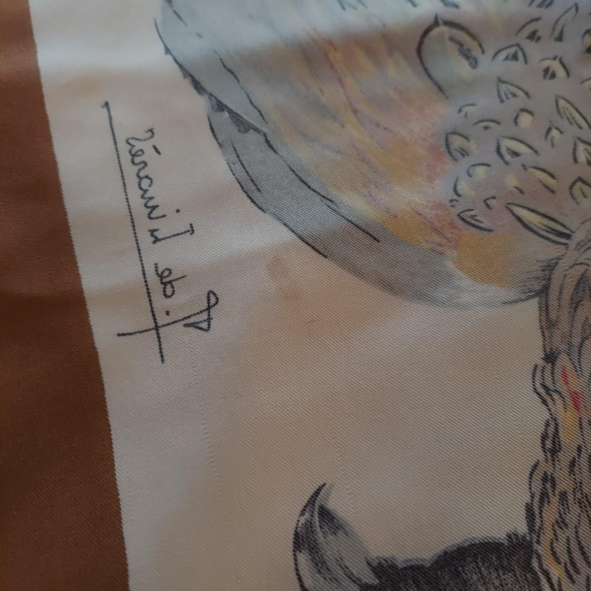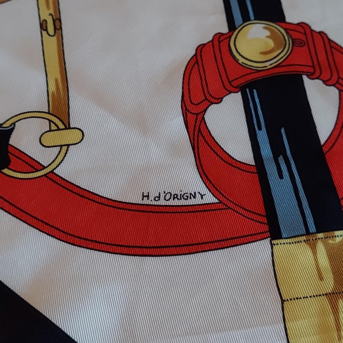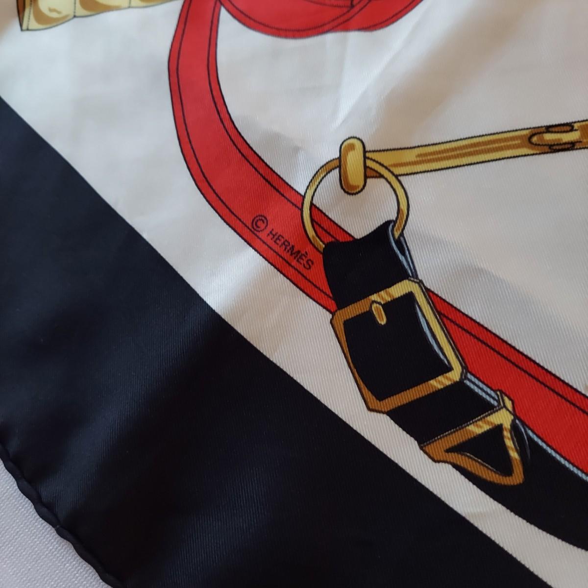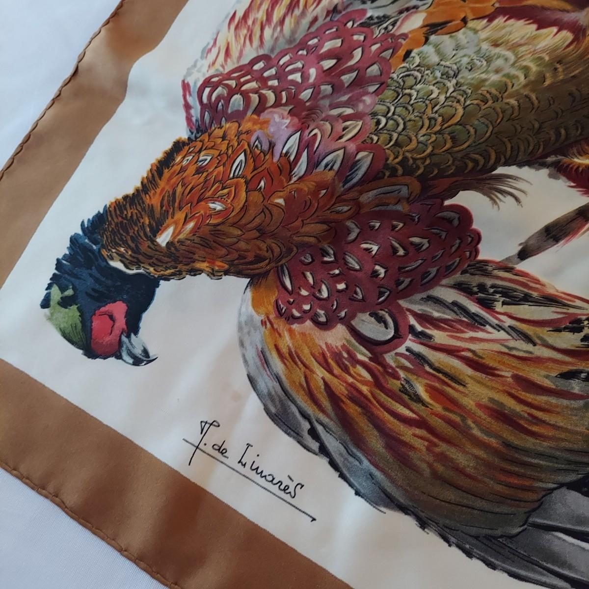 Two square scarves that appear to be silk and made by Hermès. The black, red and gold 'Eperons D'or' and the tan and cream 'Belle Chasse' prints. Each is approximately 35"SQ and has a rolled edge. One has a sewn in tag, the other does not. The 'Belle Chasse' scarf with bird print has some condition issues. Please see photos. Shipping available