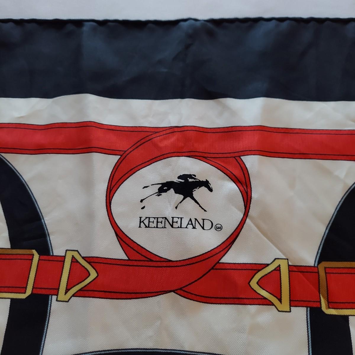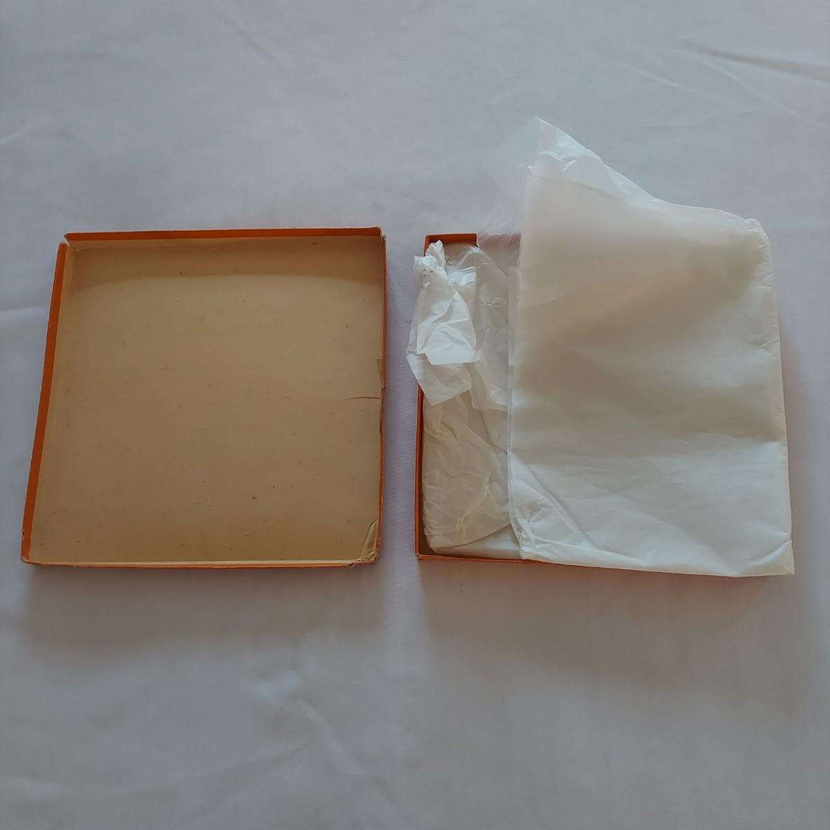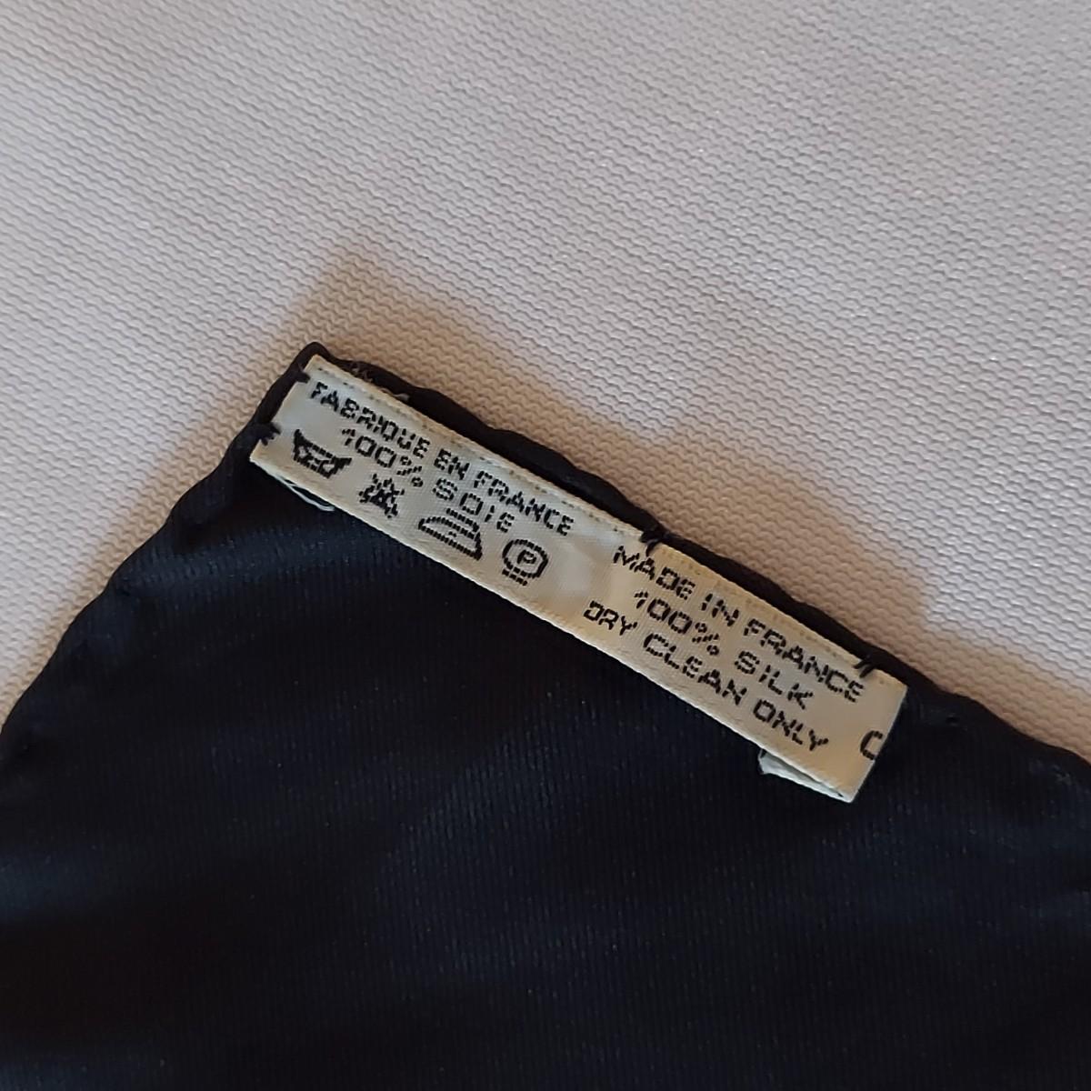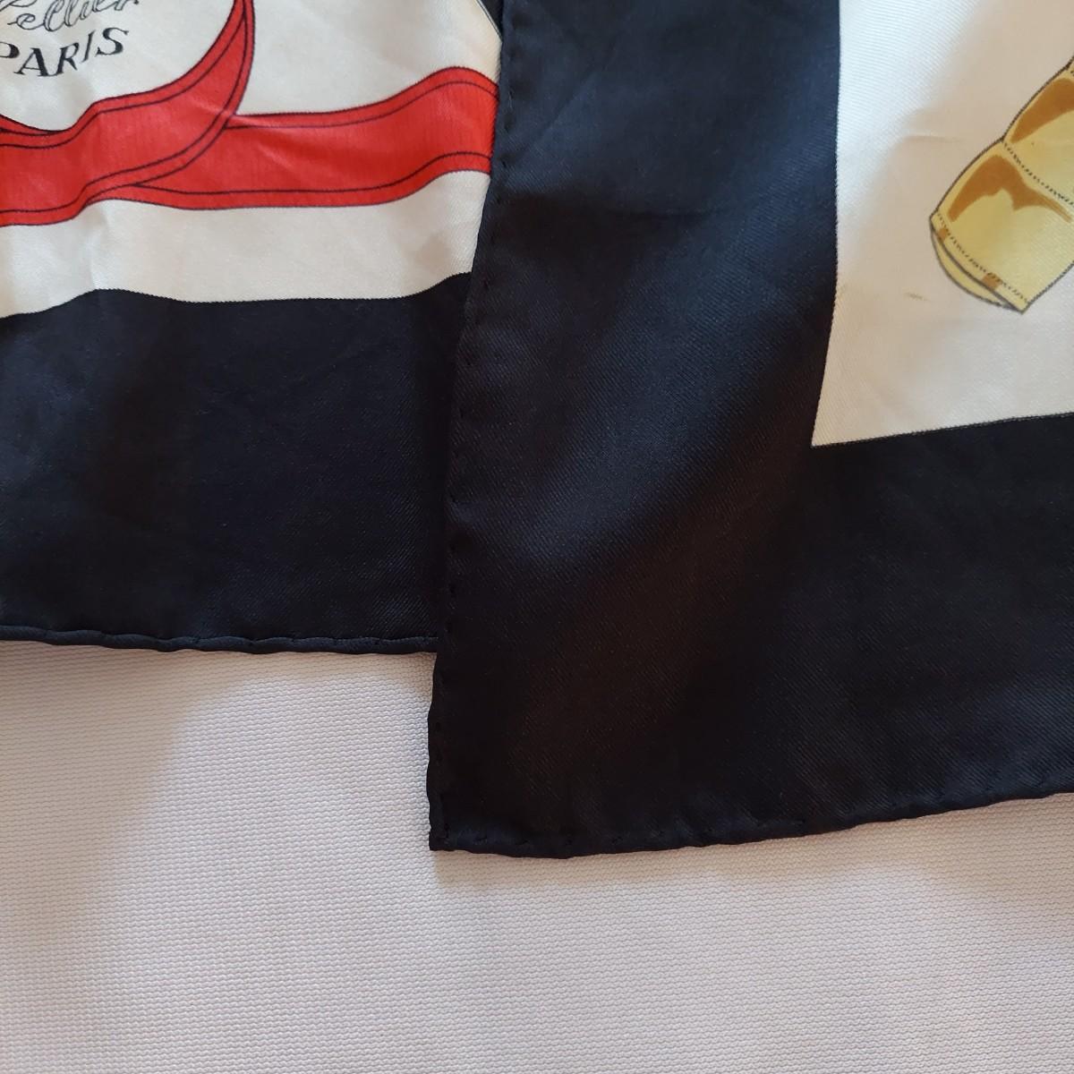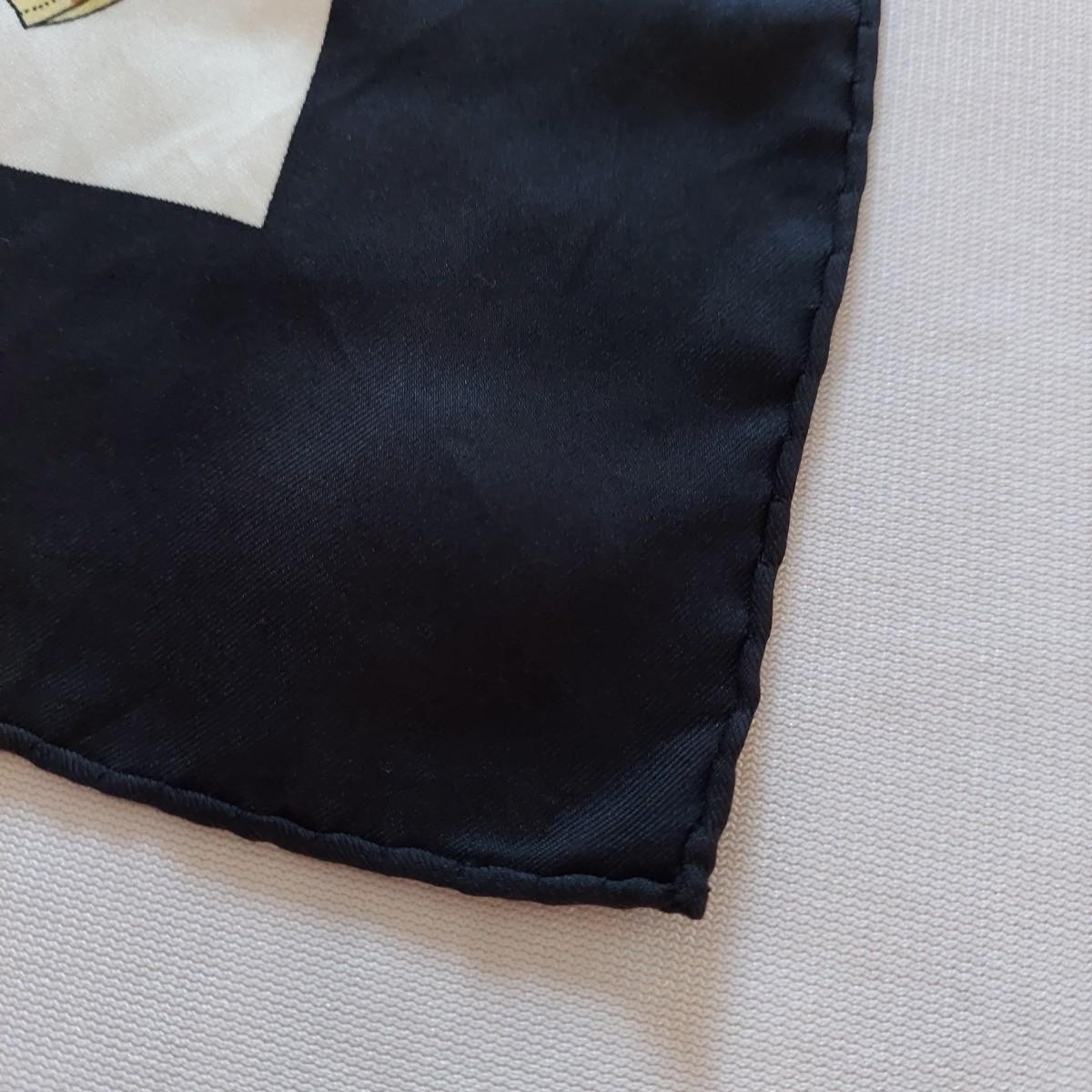 Two square scarves that appear to be silk and made by Hermès. The black, red and gold 'Eperons D'or' and the tan and cream 'Belle Chasse' prints. Each is approximately 35"SQ and has a rolled edge. One has a sewn in tag, the other does not. The 'Belle Chasse' scarf with bird print has some condition issues. Please see photos. Shipping available