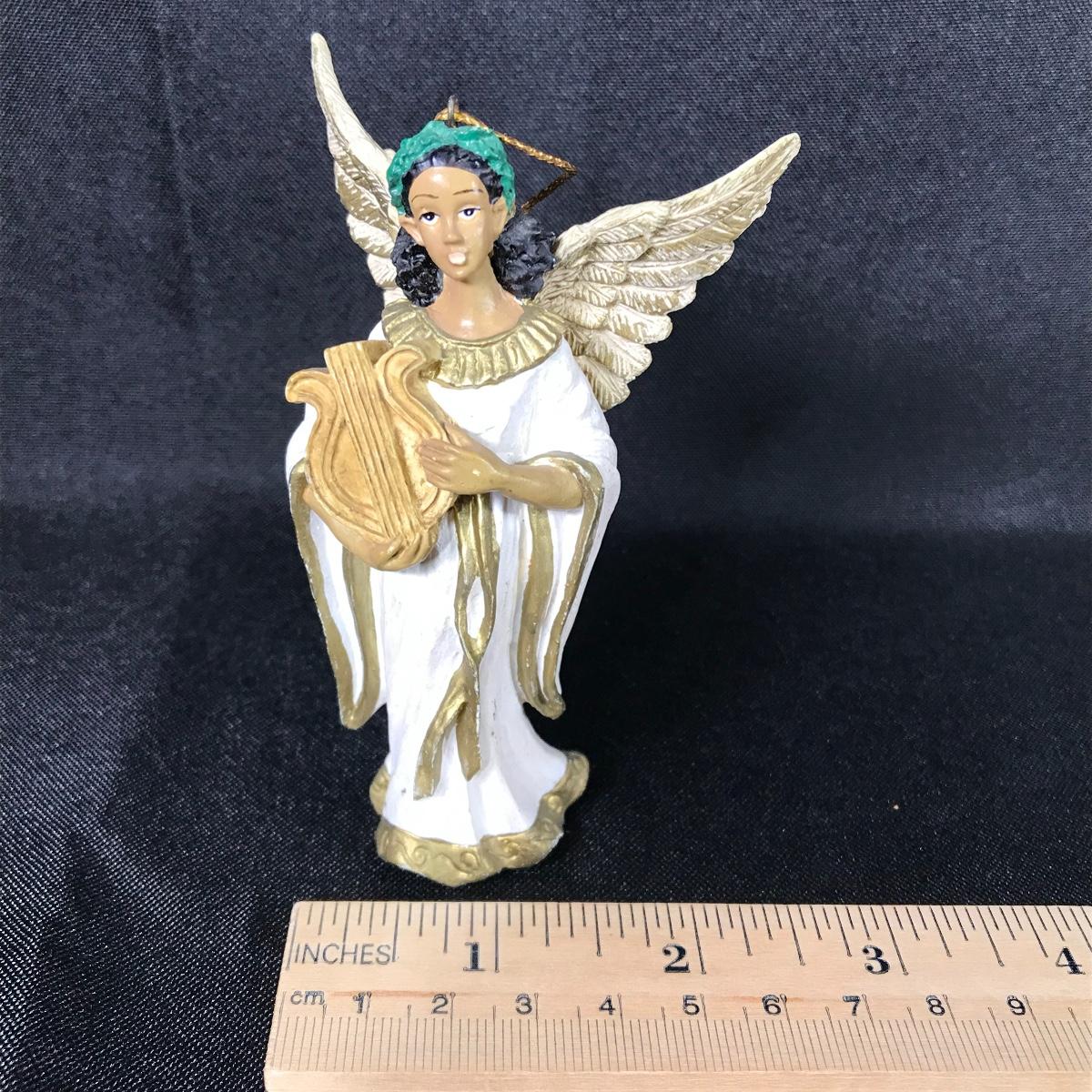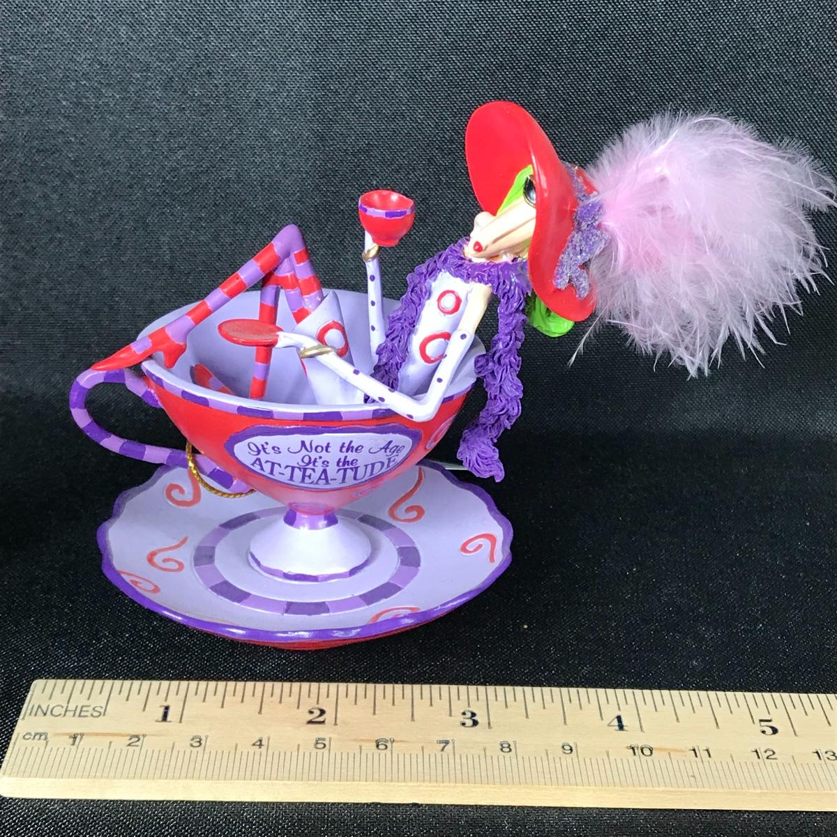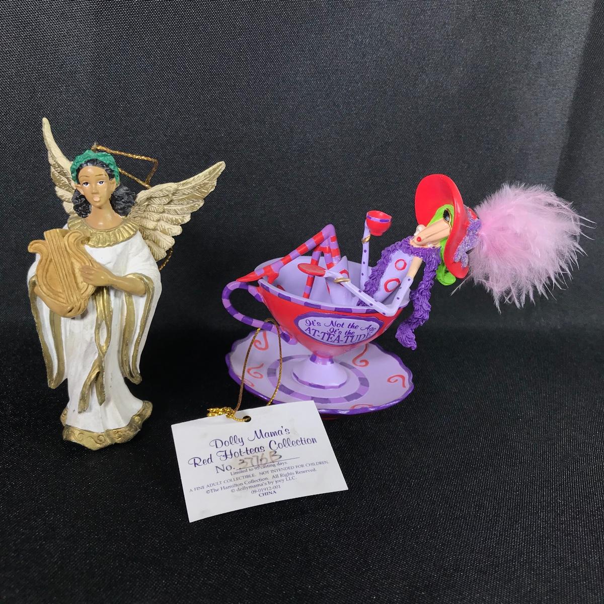 Lot of two holiday ornaments. When did pics an angel playing a harp, the other is a whimsical elderly woman lounging in a tea cup; see pictures.