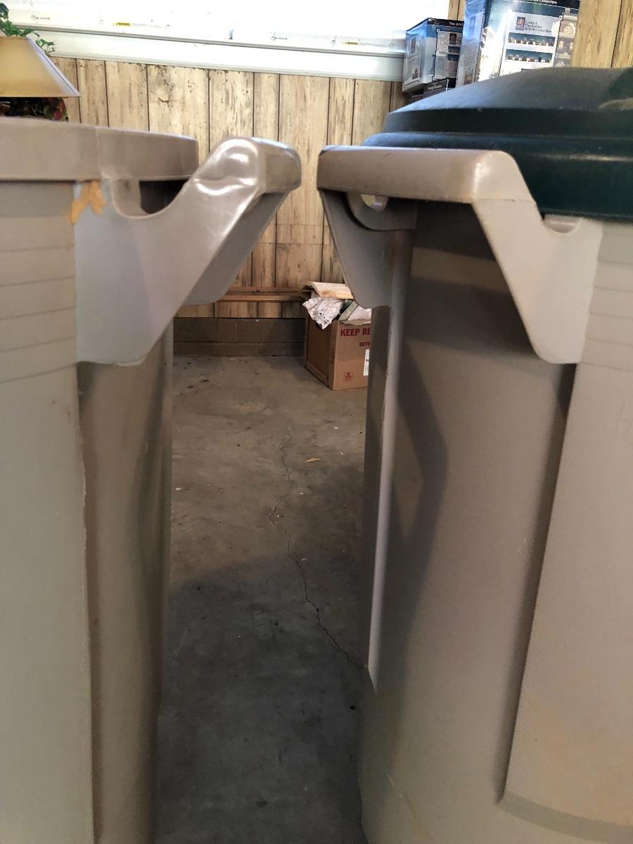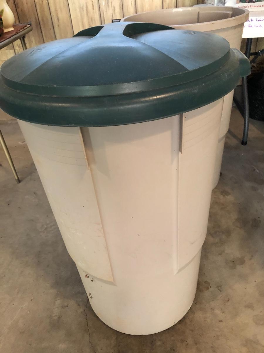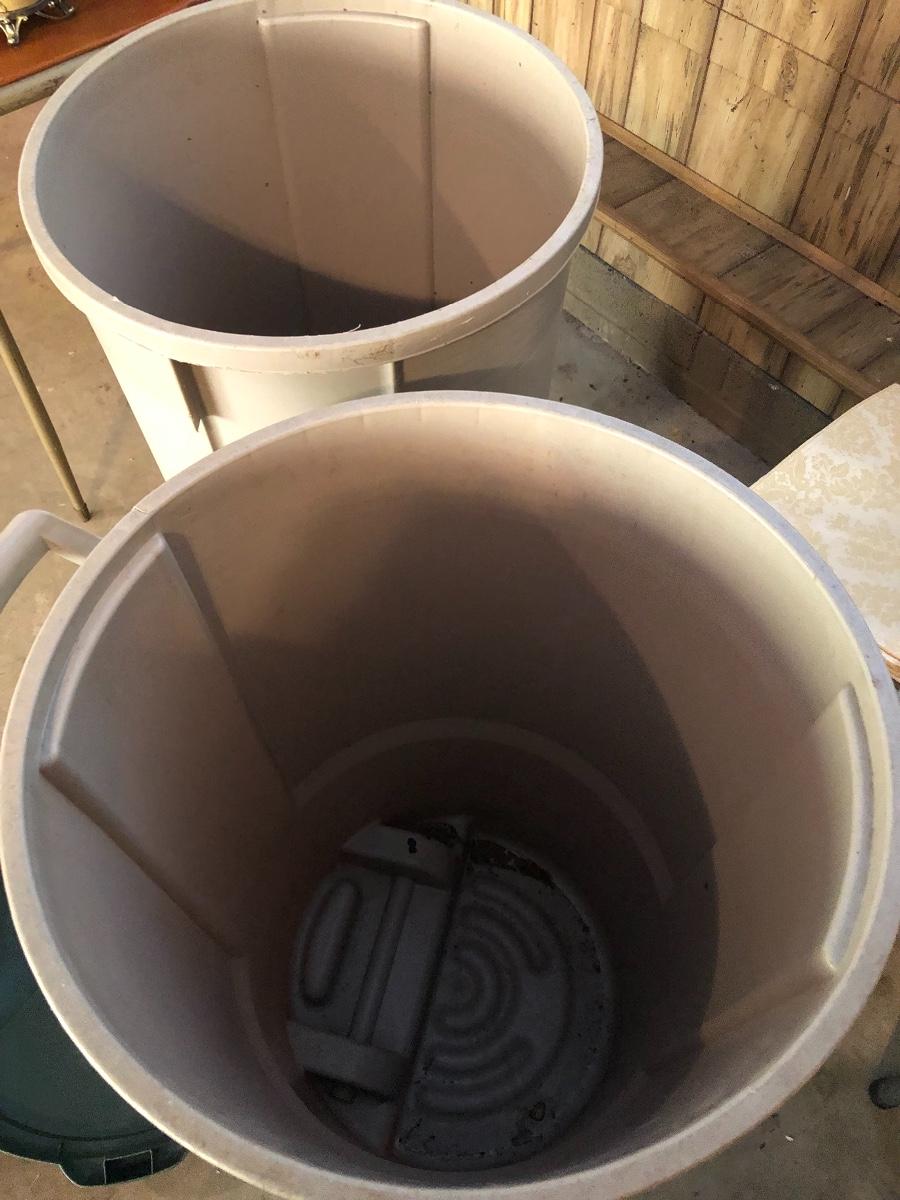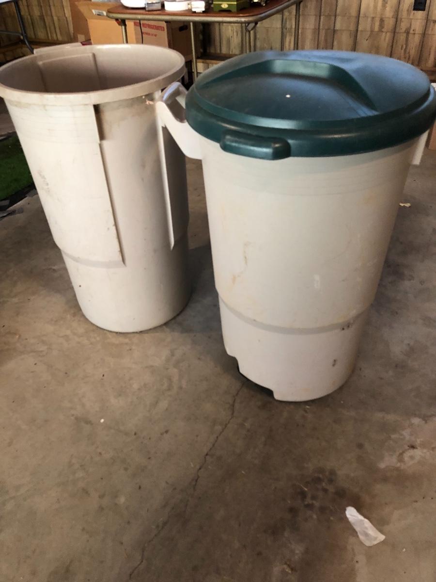 Both trash cans have wheels yet only one has a lid. They measure 20” in diameter and are 32” tall. Local pick up only.