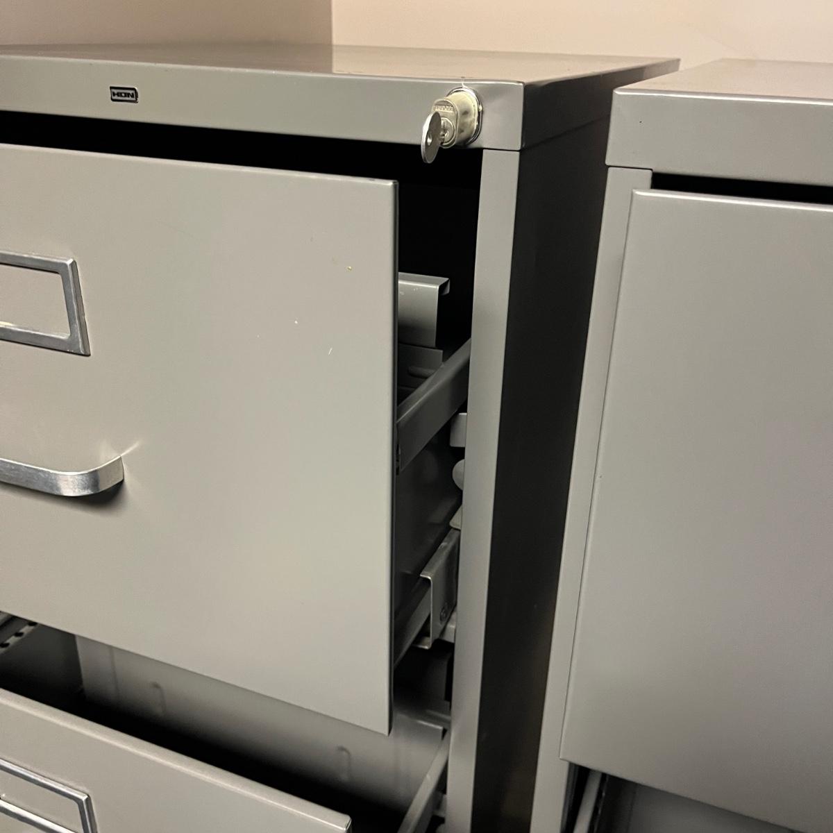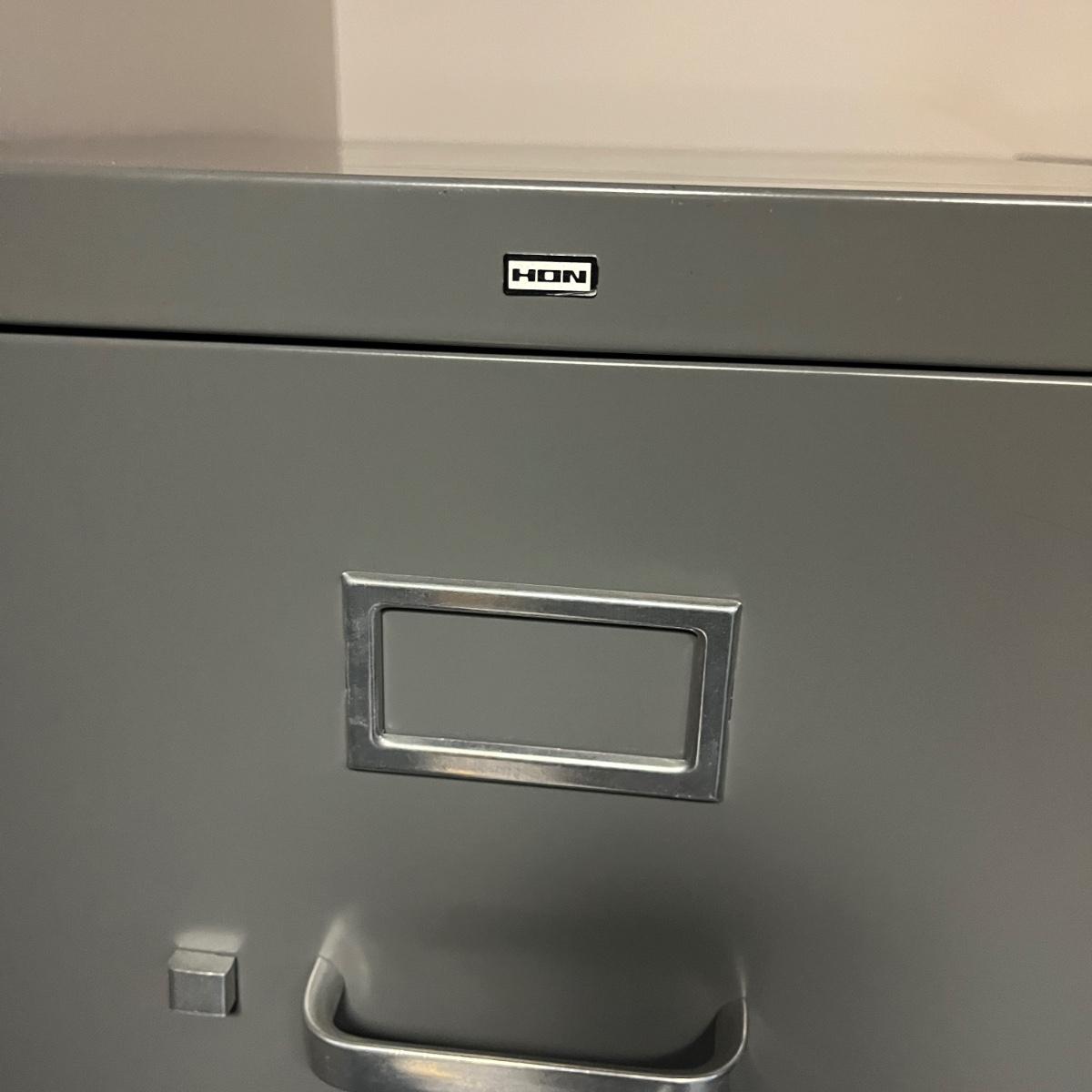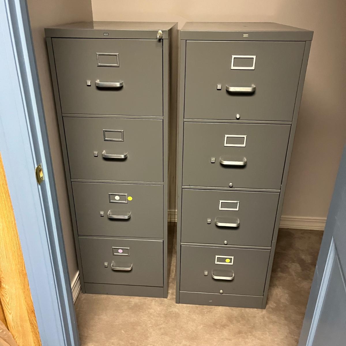 Lot includes two HON four drawer metal file cabinets with one having a lock and key. Largest cabinet measures 18” x 28” x 52”H.