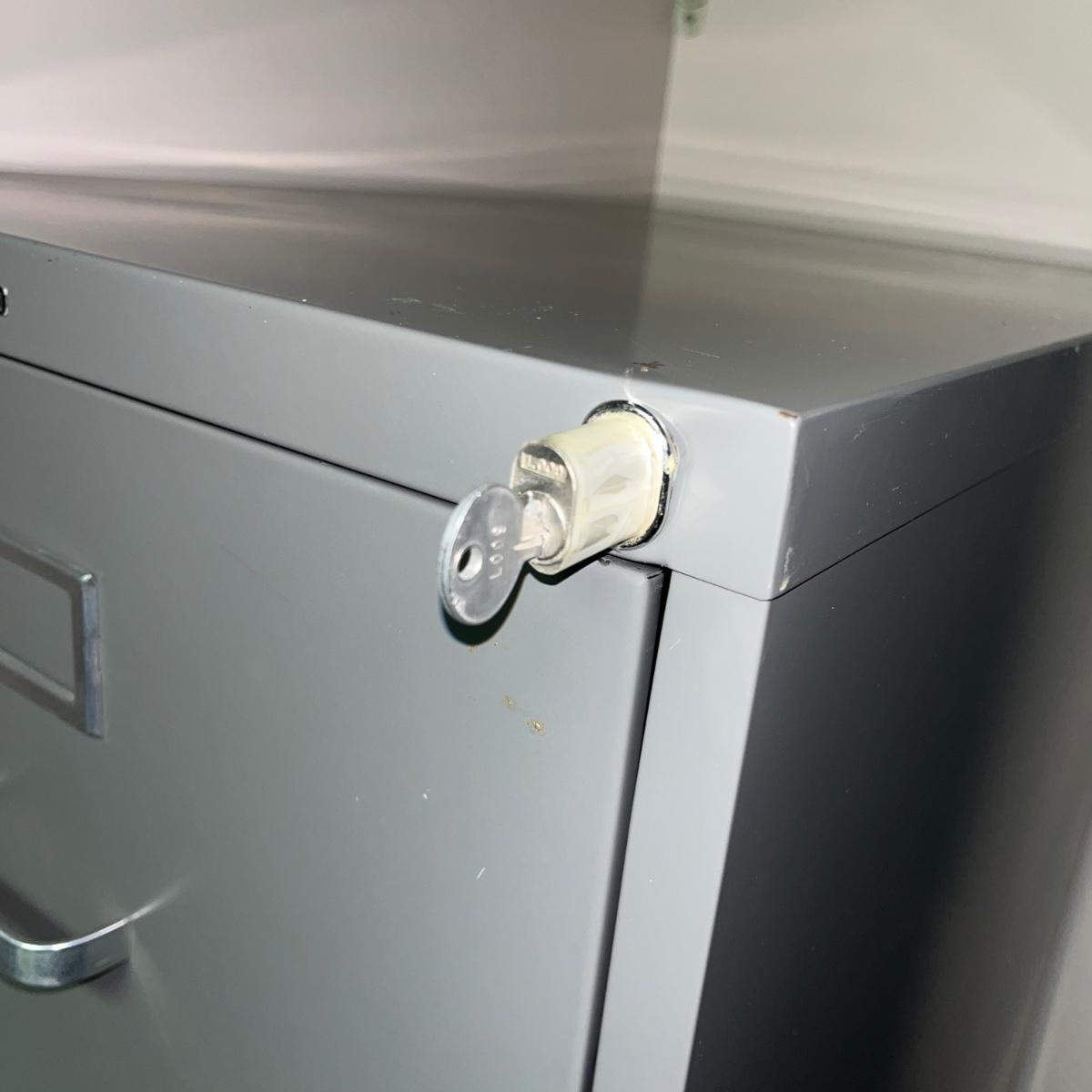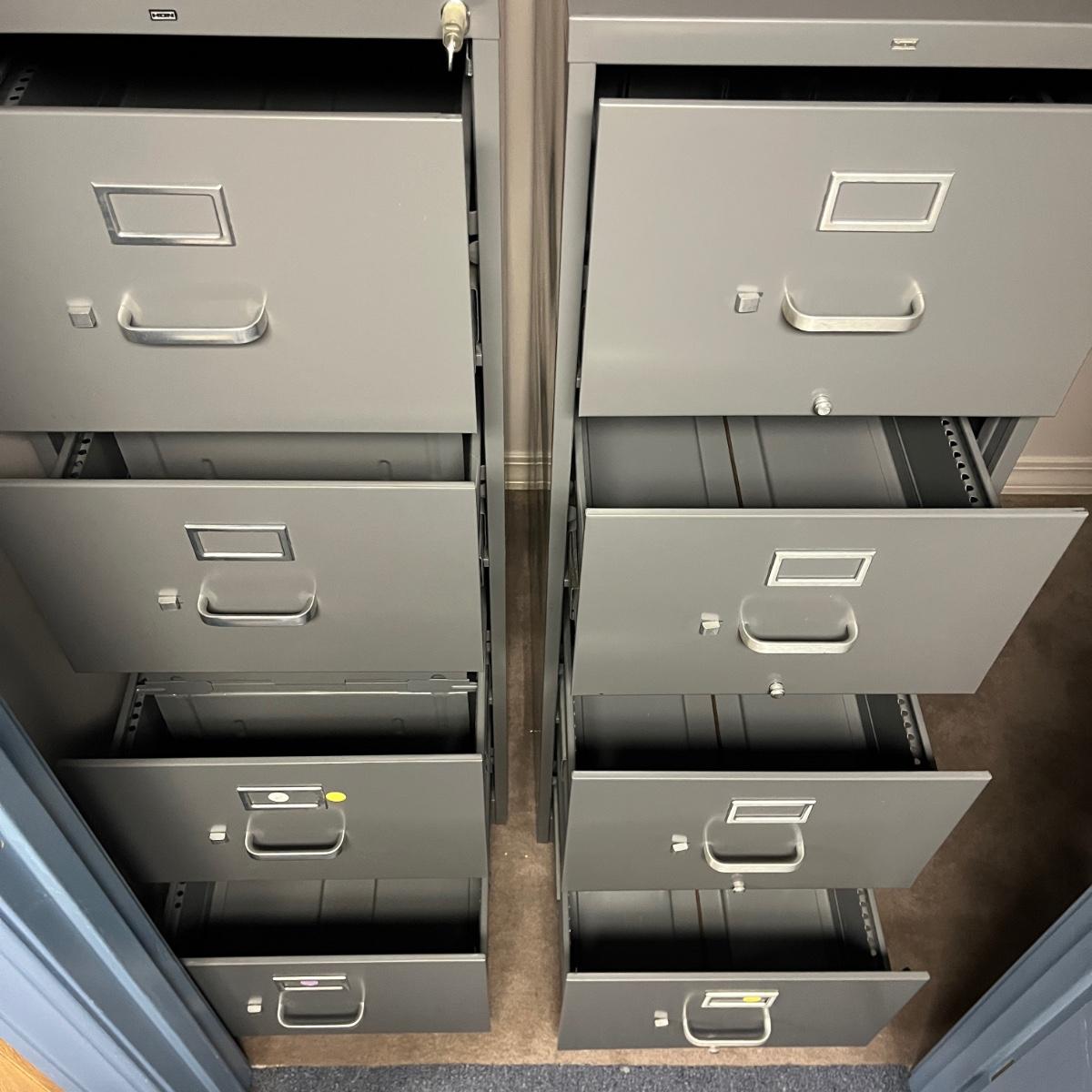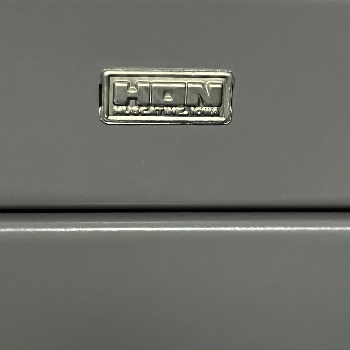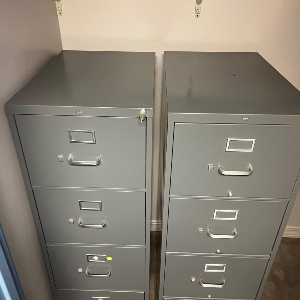 Lot includes two HON four drawer metal file cabinets with one having a lock and key. Largest cabinet measures 18” x 28” x 52”H.