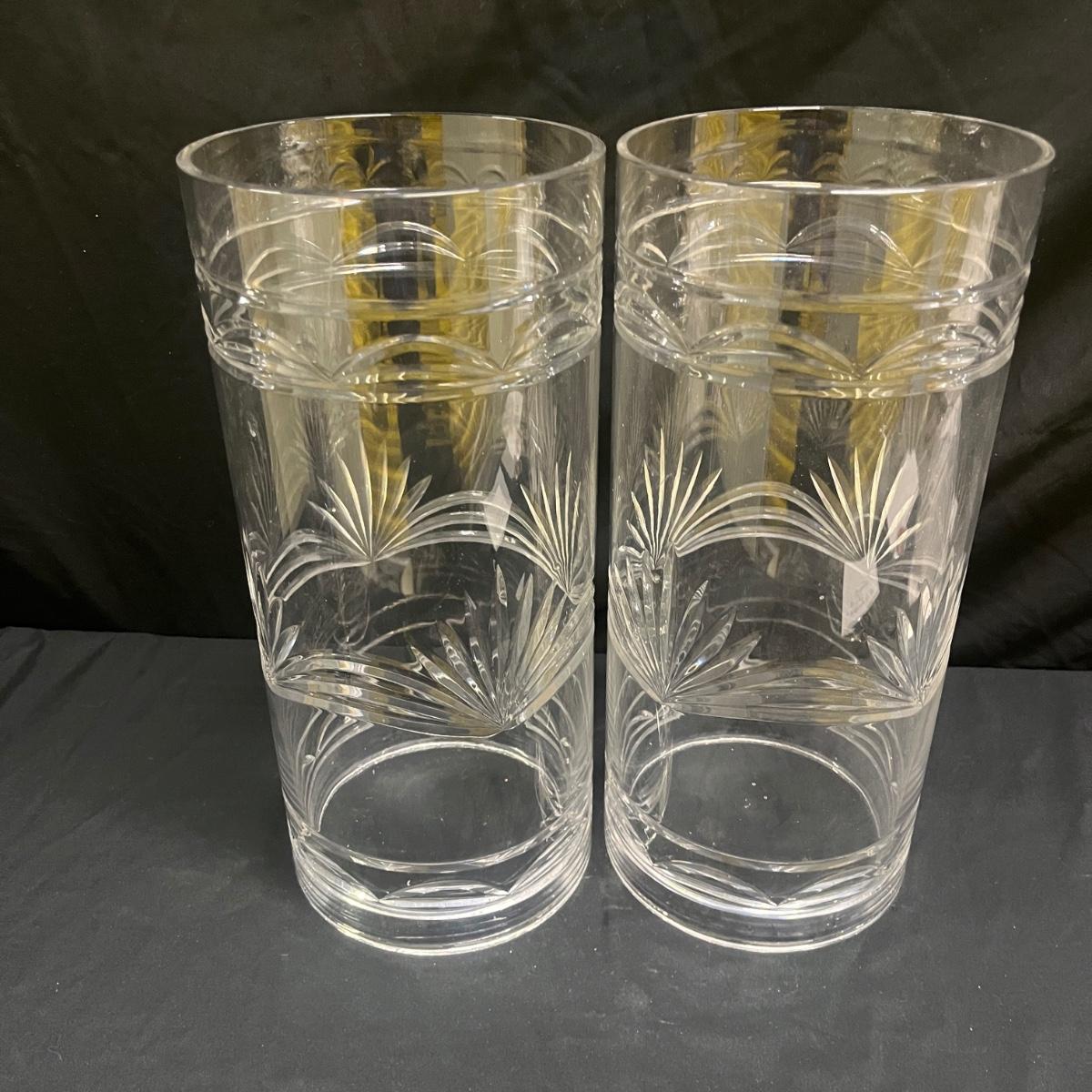 Lot includes two glass cylinders that appear to be the shades for hurricane/oil lamps. Each measures 7”D x 15.5”H.