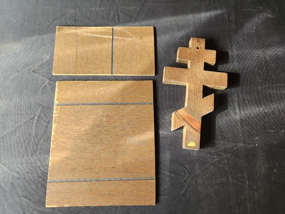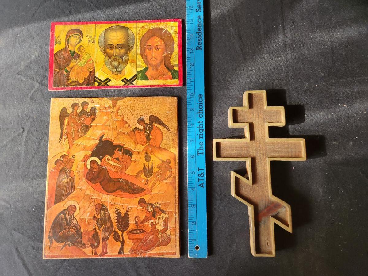 This auction lot is for Two Icons and a Cross. These mixed icons are printed on paper and fused to a wood backing. These examples are mounted on thin boards. The cross appears to be made from a balsam wood as it is very light - but a nice example and useful for so many purposes.