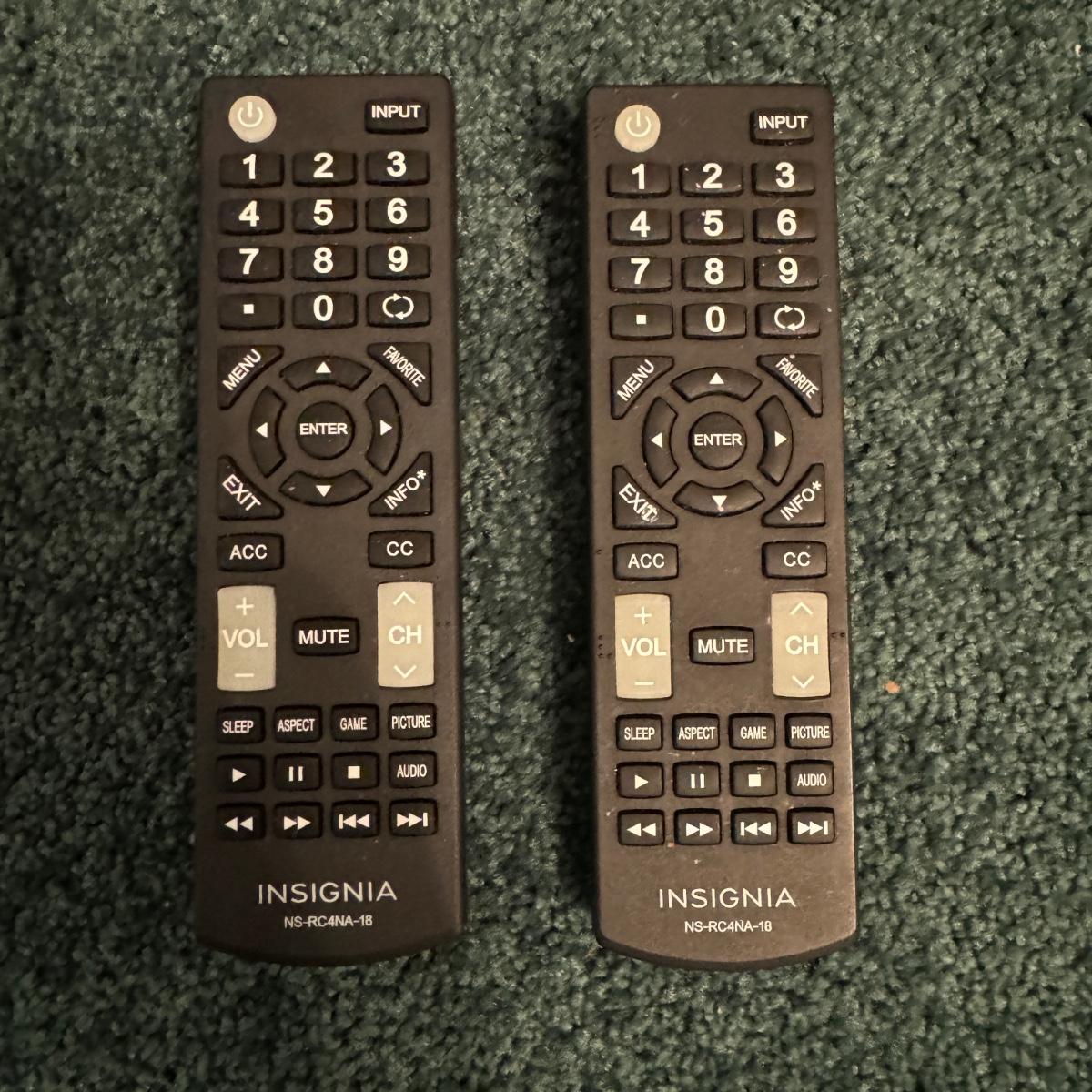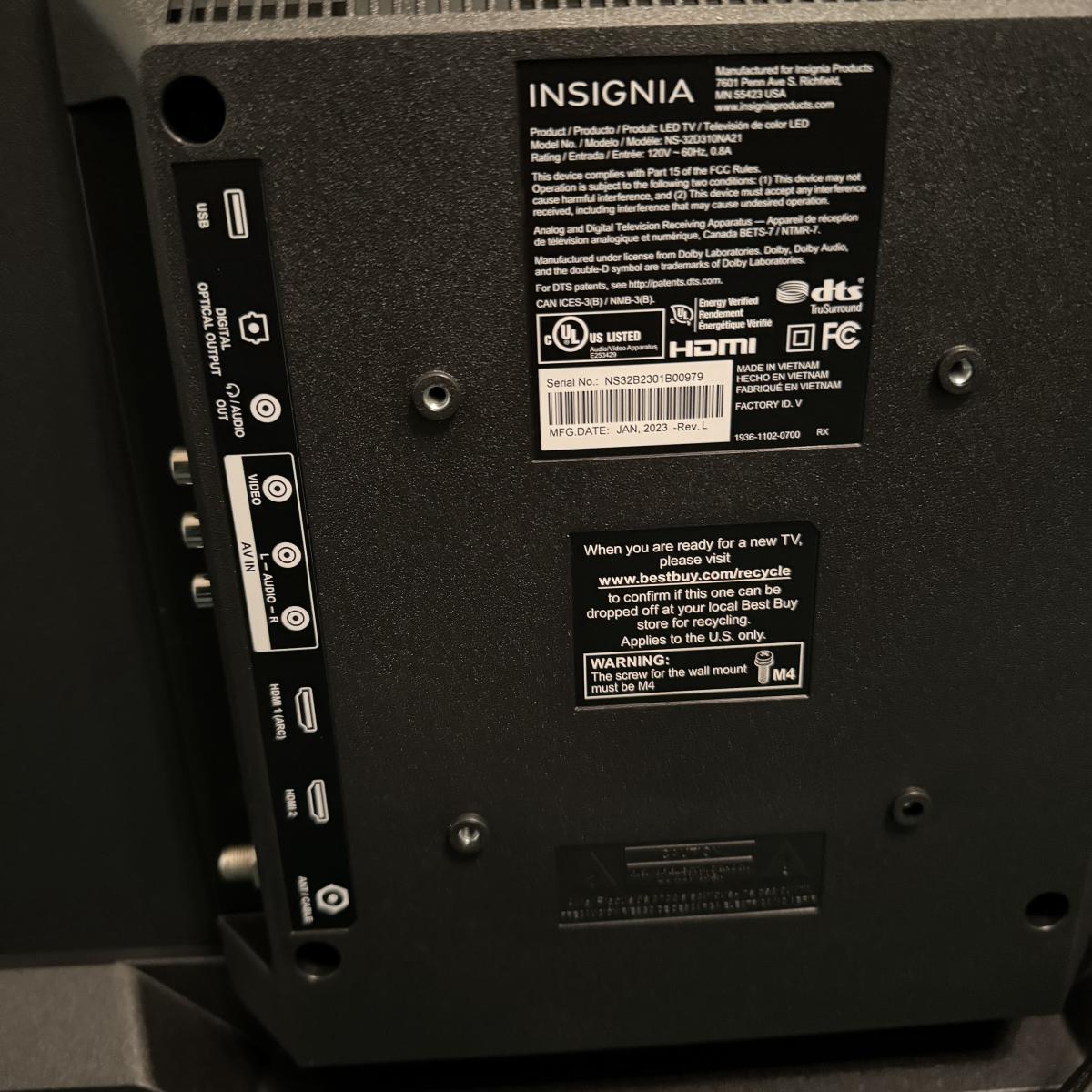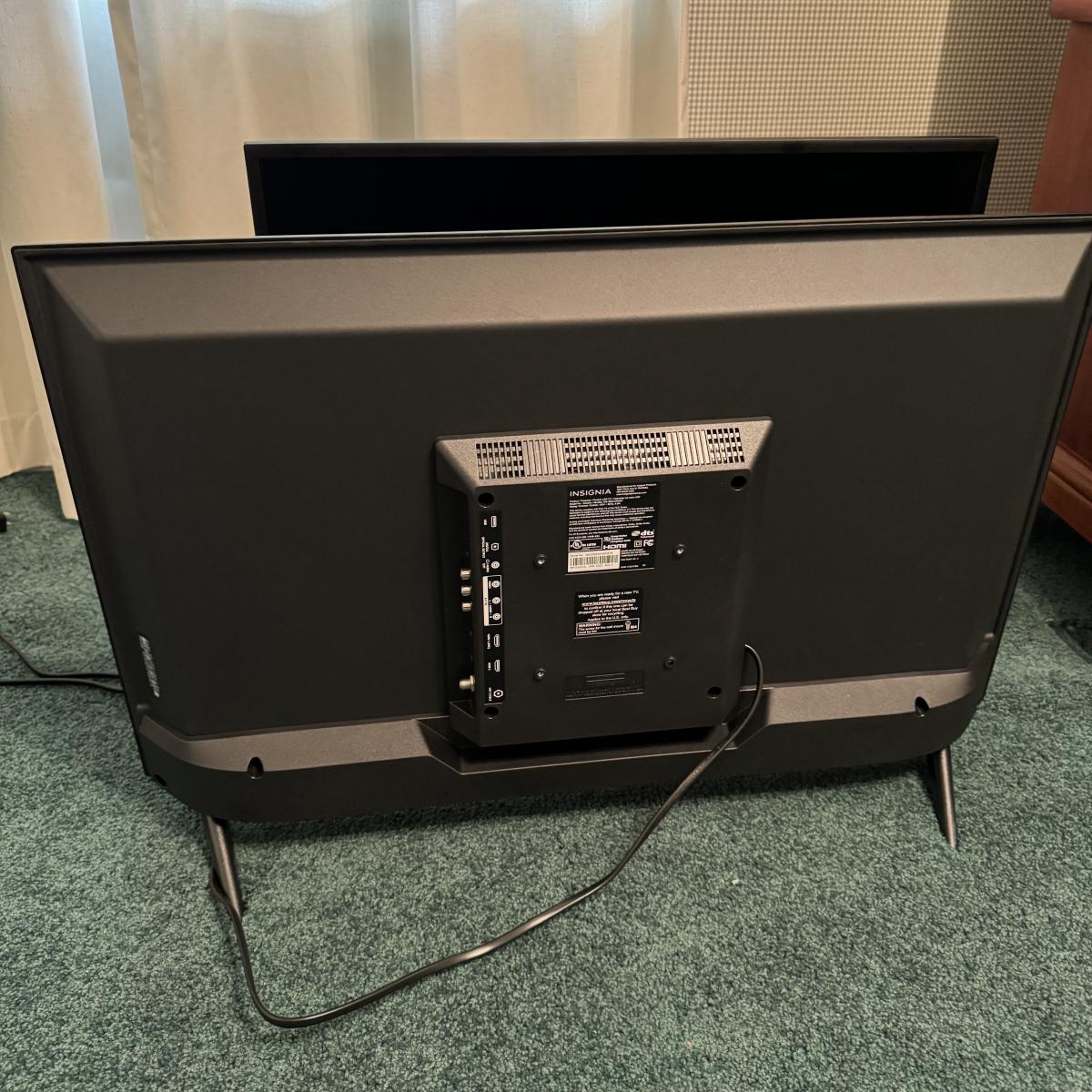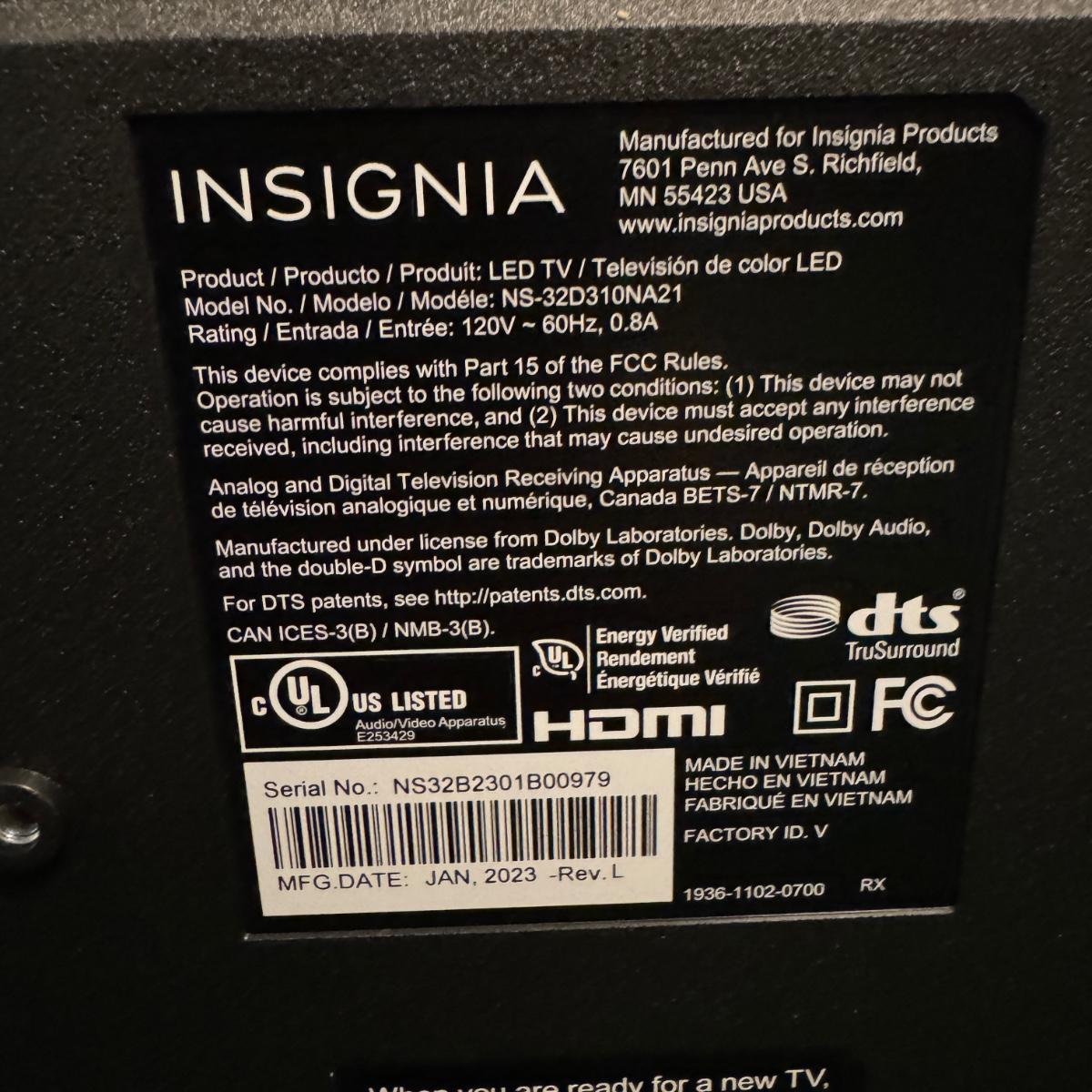 Two Insignia 32” TVs. Both are the same brand and say Mfg Date: January 2023. Both come with a remote control and one packet of original paperwork. Both powered on when plugged in. Local Pick Up Only.