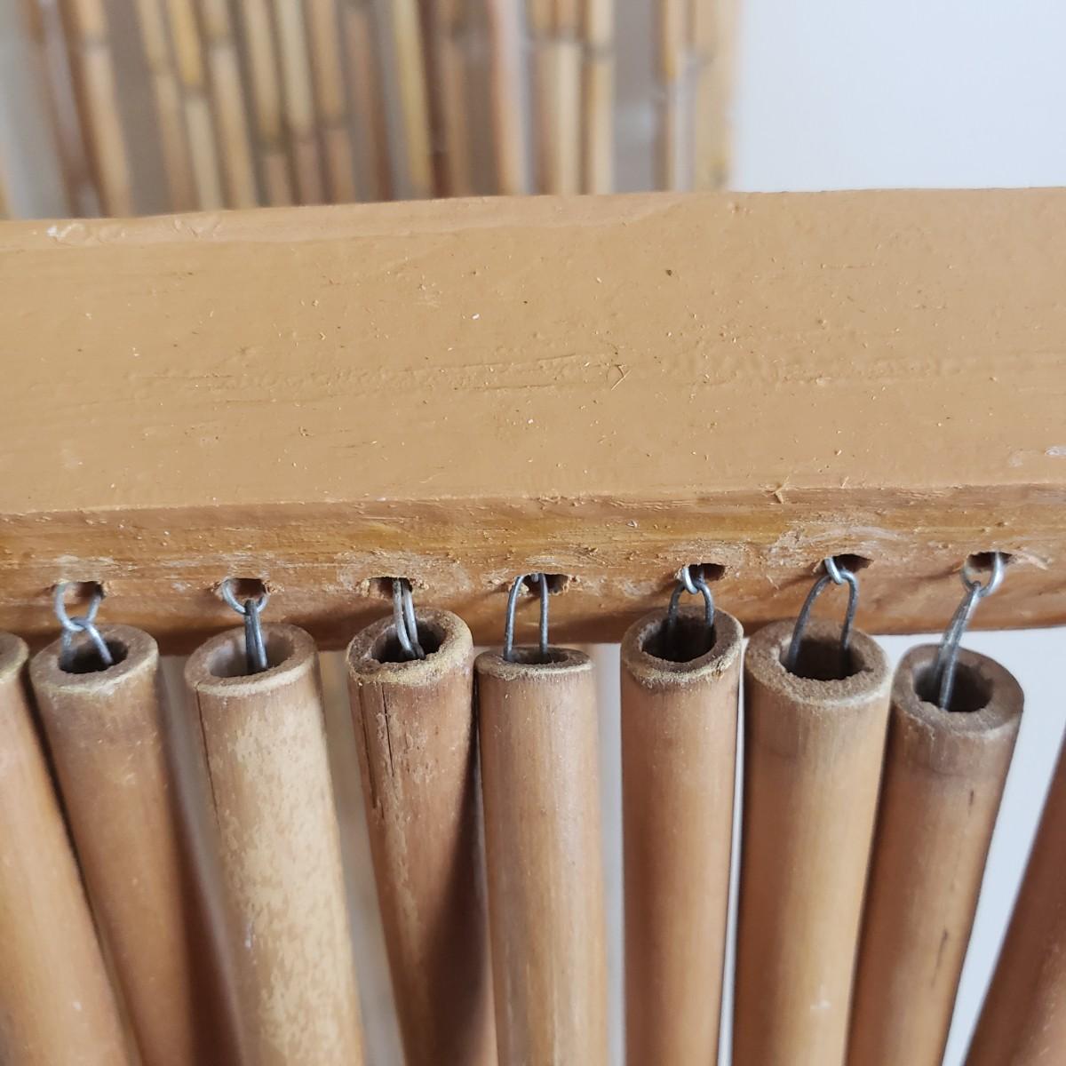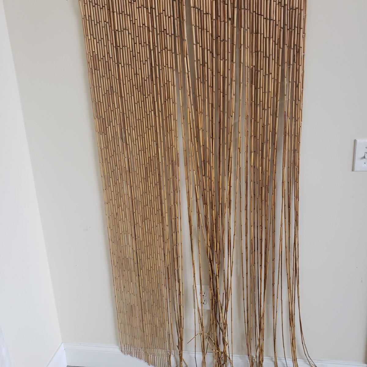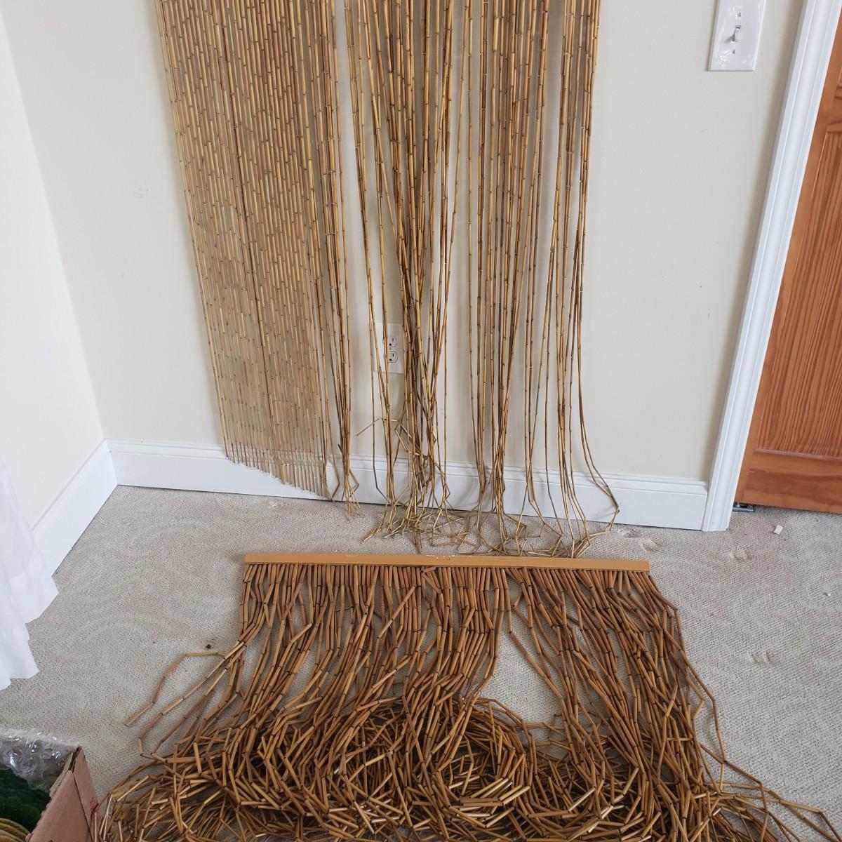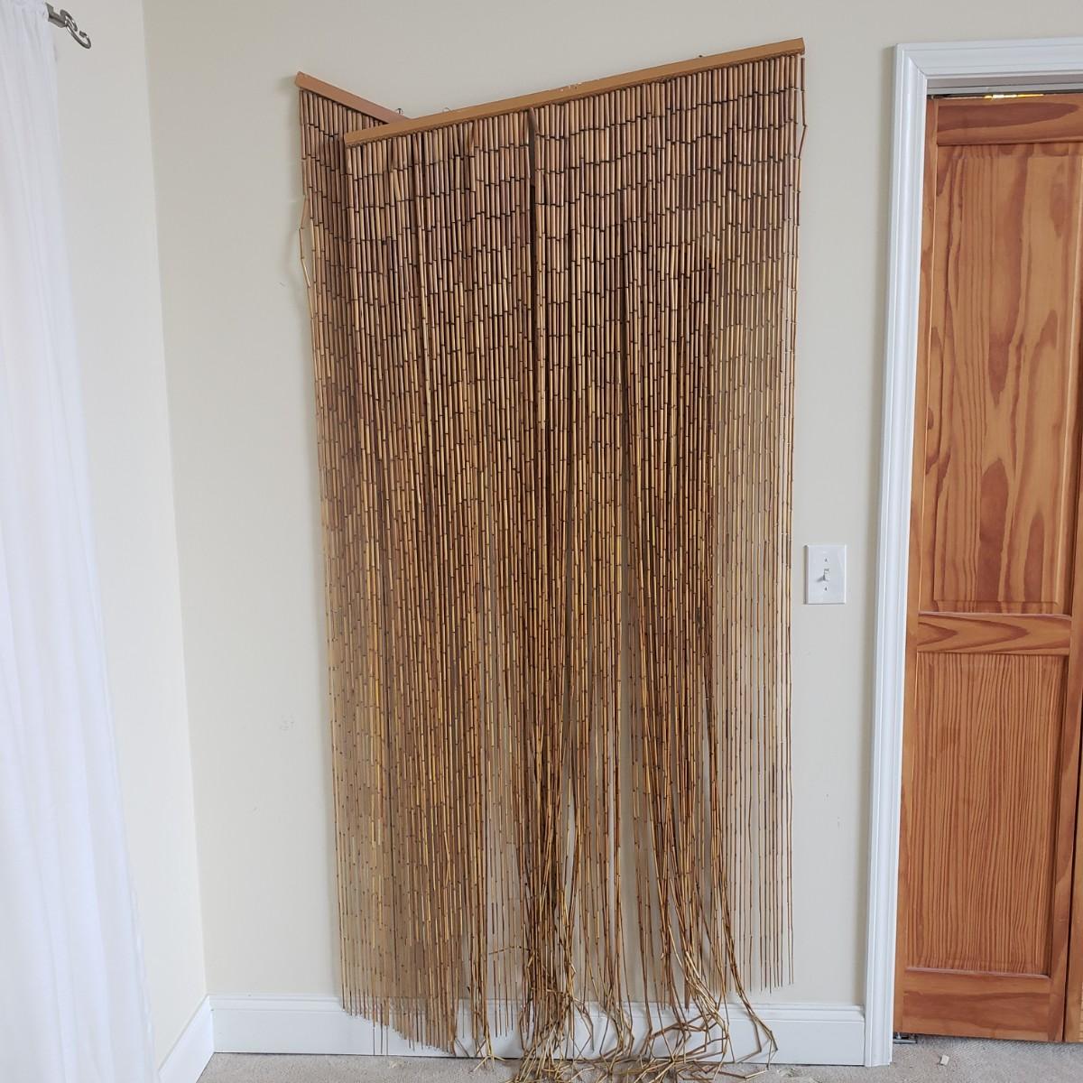 These identical bamboo curtains measure 35.5" x 78". The curtain bamboo parts are threaded with wire and attached to the brace. The brace has two hooks and a hole in the center, where it was screwed into the wall for added support.