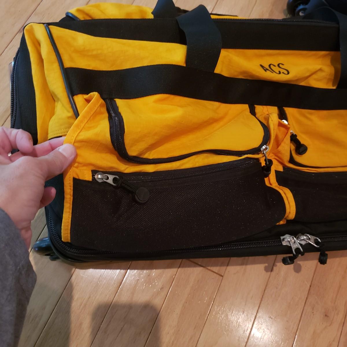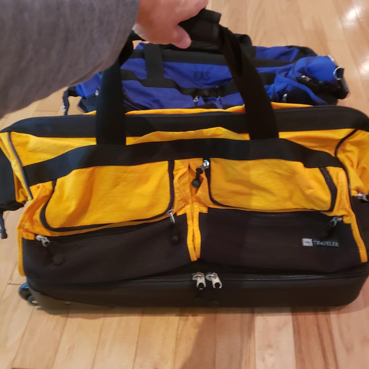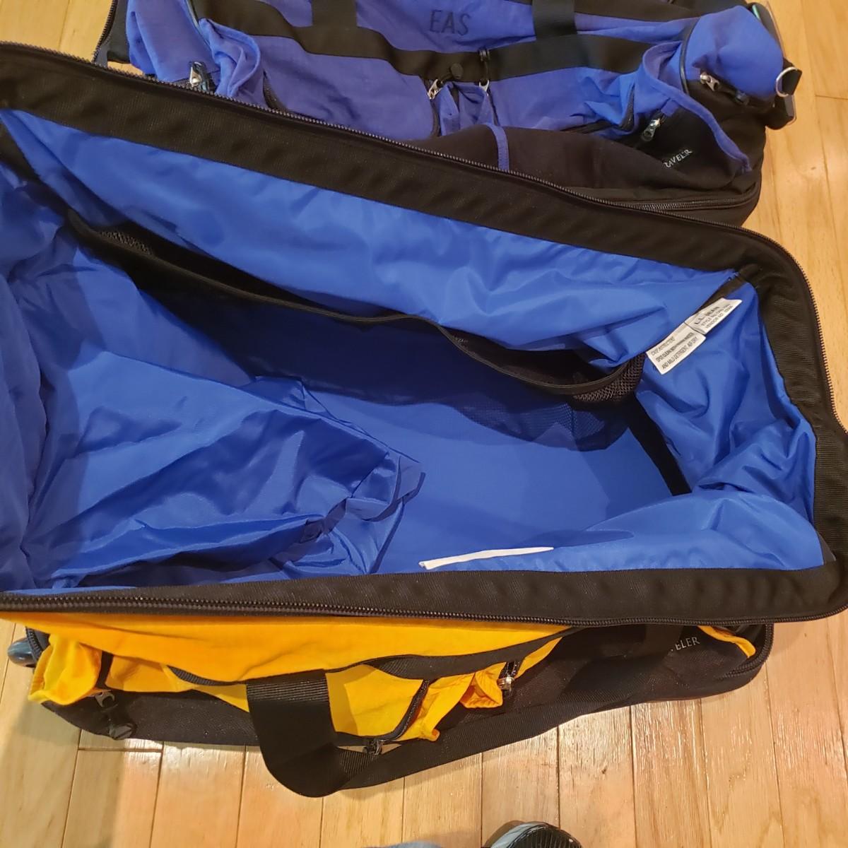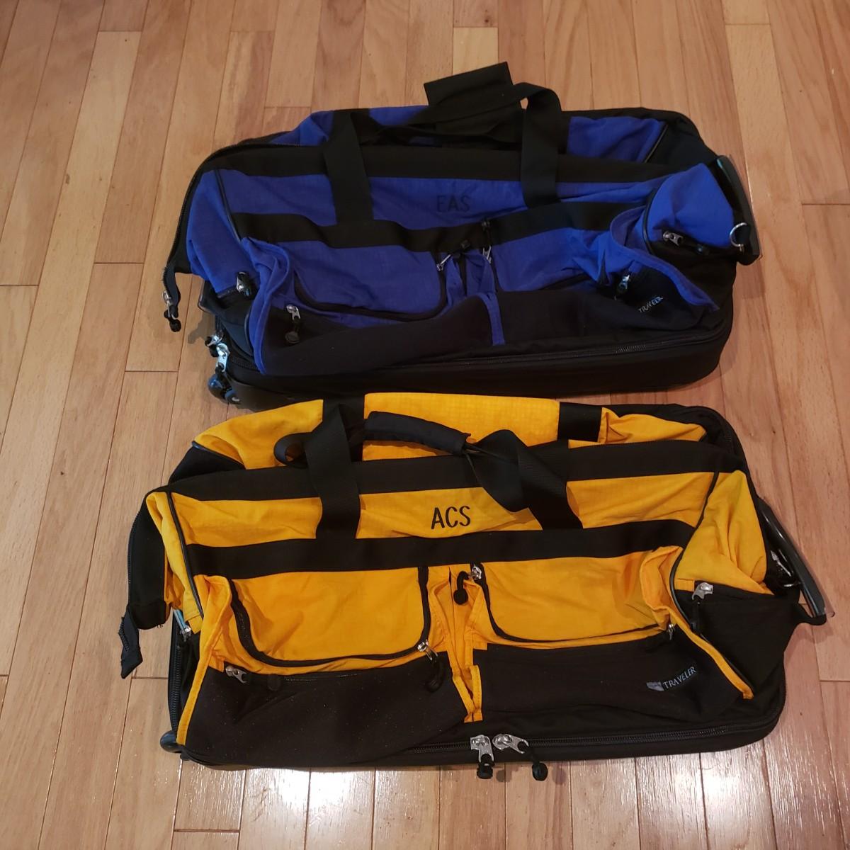 These two identical, other than the monograms (ACS/EAS) and colors are L.L.Bean Traveler rolling bags. (23" x 17" x 16"H) Talk about storage! These bags are loaded with compartments and pockets! There is the wide mouth, main area in the center with two mesh pockets on the sides, but there is also a storage area which you can see from the main section, but access it from the zipper, near the outside end handle. The main area is reinforced with metal rods around the zipper. The bottom storage area (26" x 15" x 5"H has another zippered area which exposes the support bars. There are two handles at each end and one at the top. The fabric is a sturdy, thick, soft sided canvas. There appear to be no blemishes on either bag. There appear to be barely used.