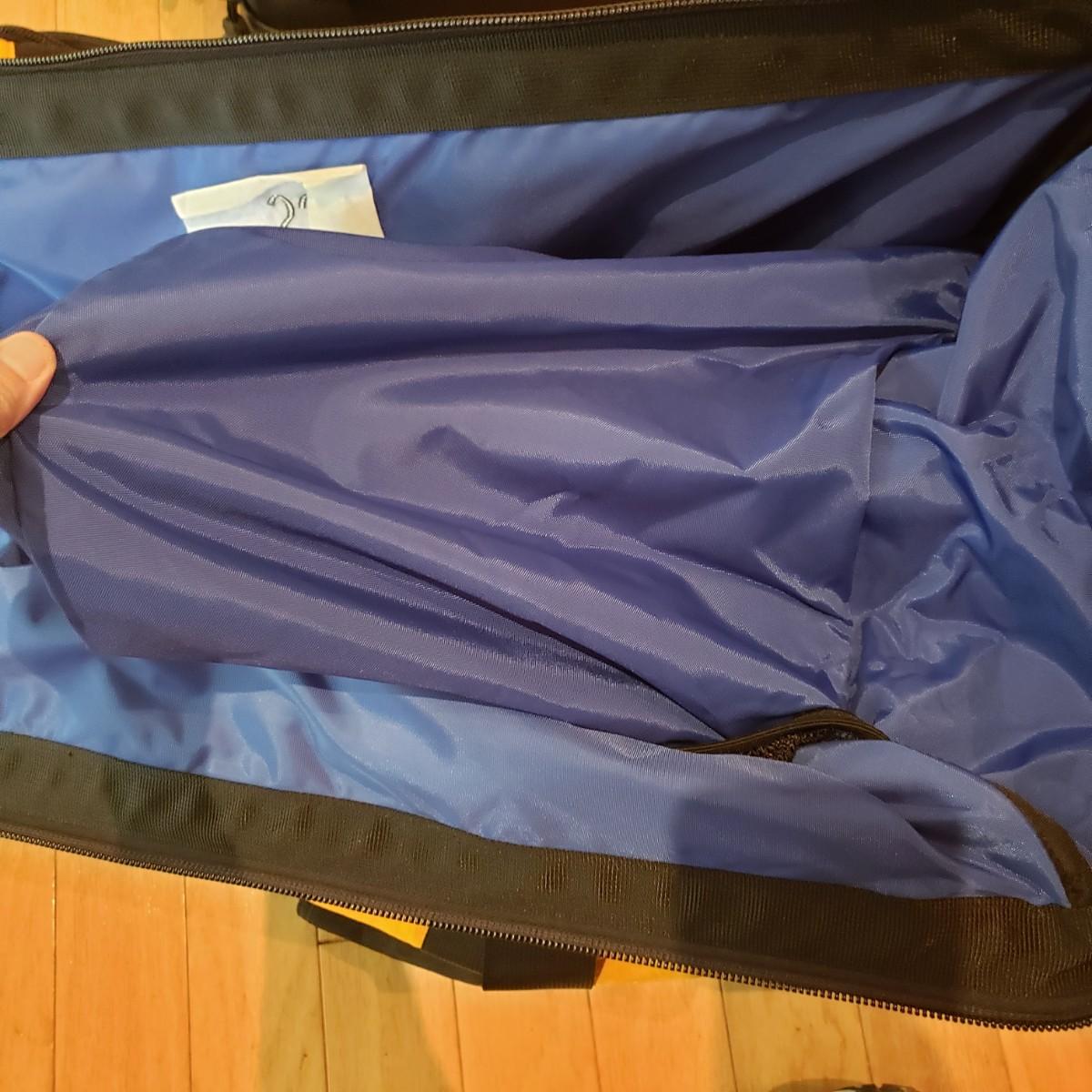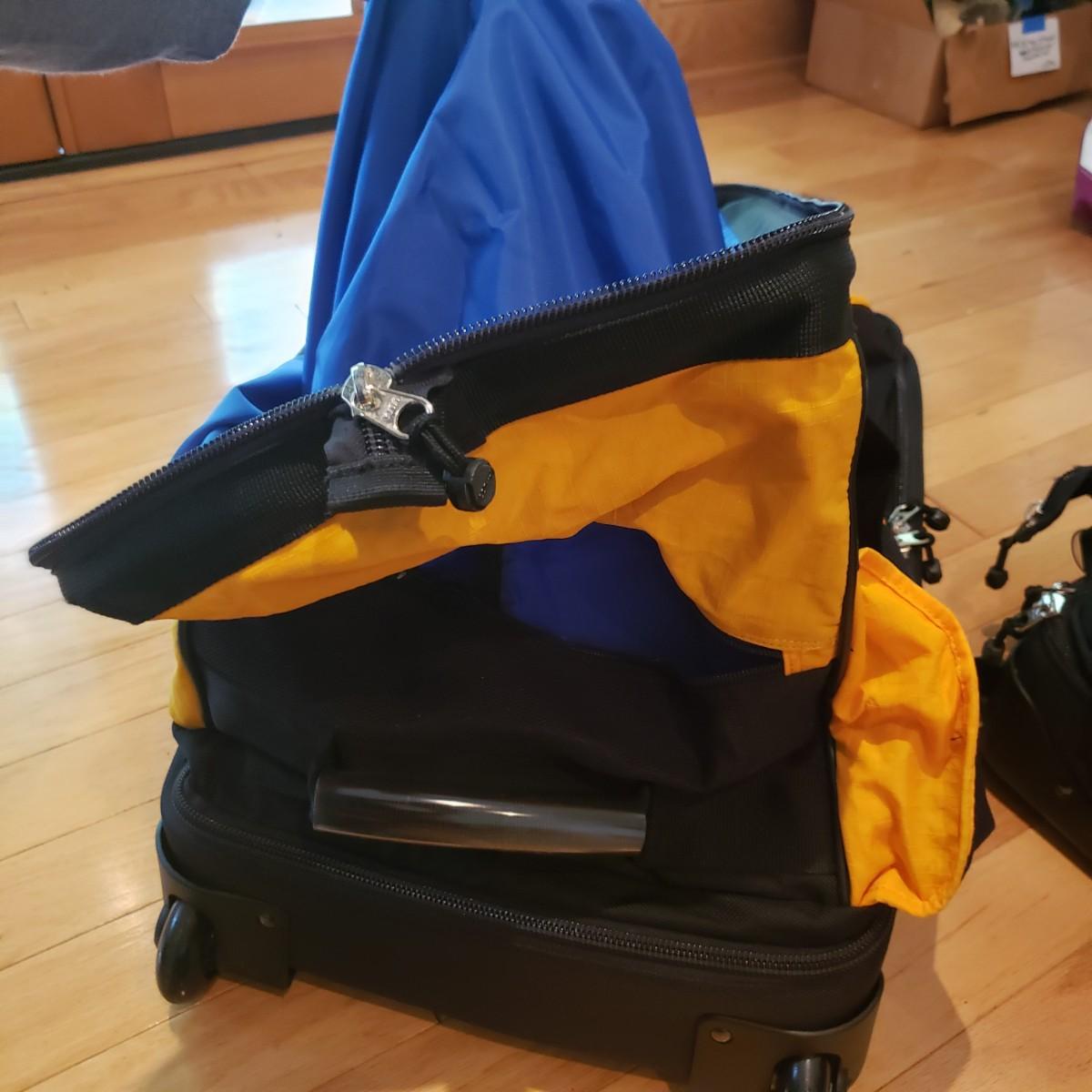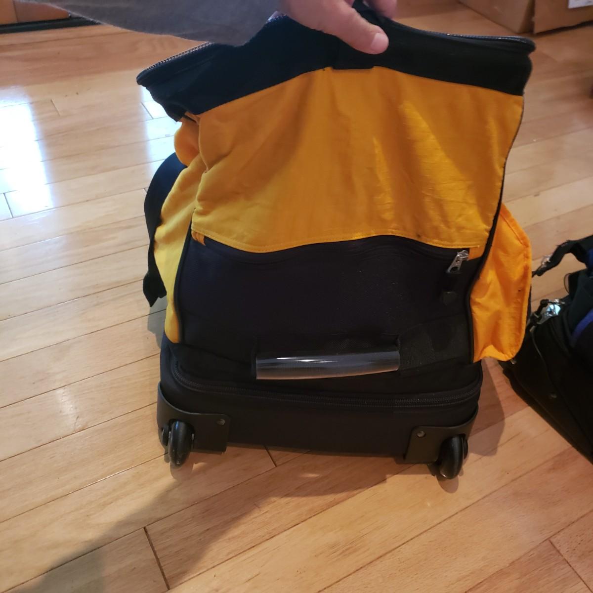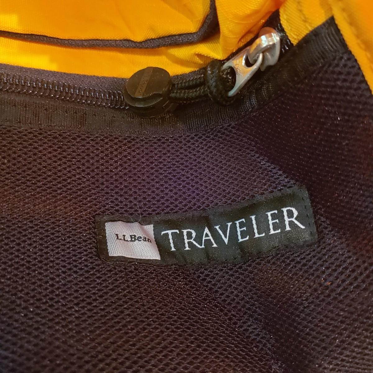 These two identical, other than the monograms (ACS/EAS) and colors are L.L.Bean Traveler rolling bags. (23" x 17" x 16"H) Talk about storage! These bags are loaded with compartments and pockets! There is the wide mouth, main area in the center with two mesh pockets on the sides, but there is also a storage area which you can see from the main section, but access it from the zipper, near the outside end handle. The main area is reinforced with metal rods around the zipper. The bottom storage area (26" x 15" x 5"H has another zippered area which exposes the support bars. There are two handles at each end and one at the top. The fabric is a sturdy, thick, soft sided canvas. There appear to be no blemishes on either bag. There appear to be barely used.