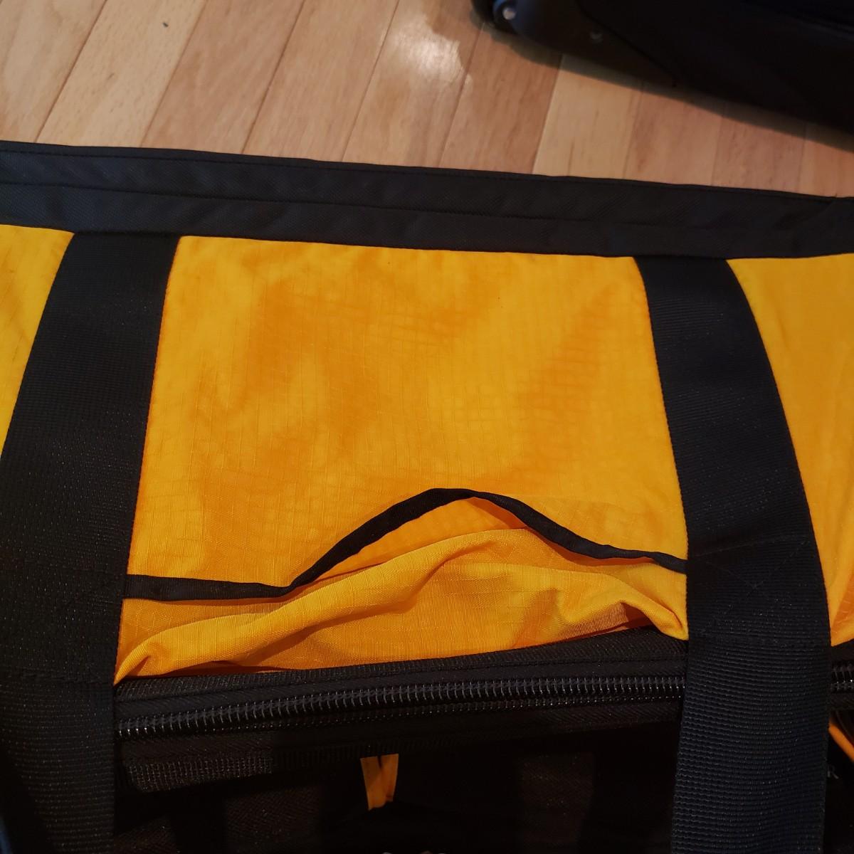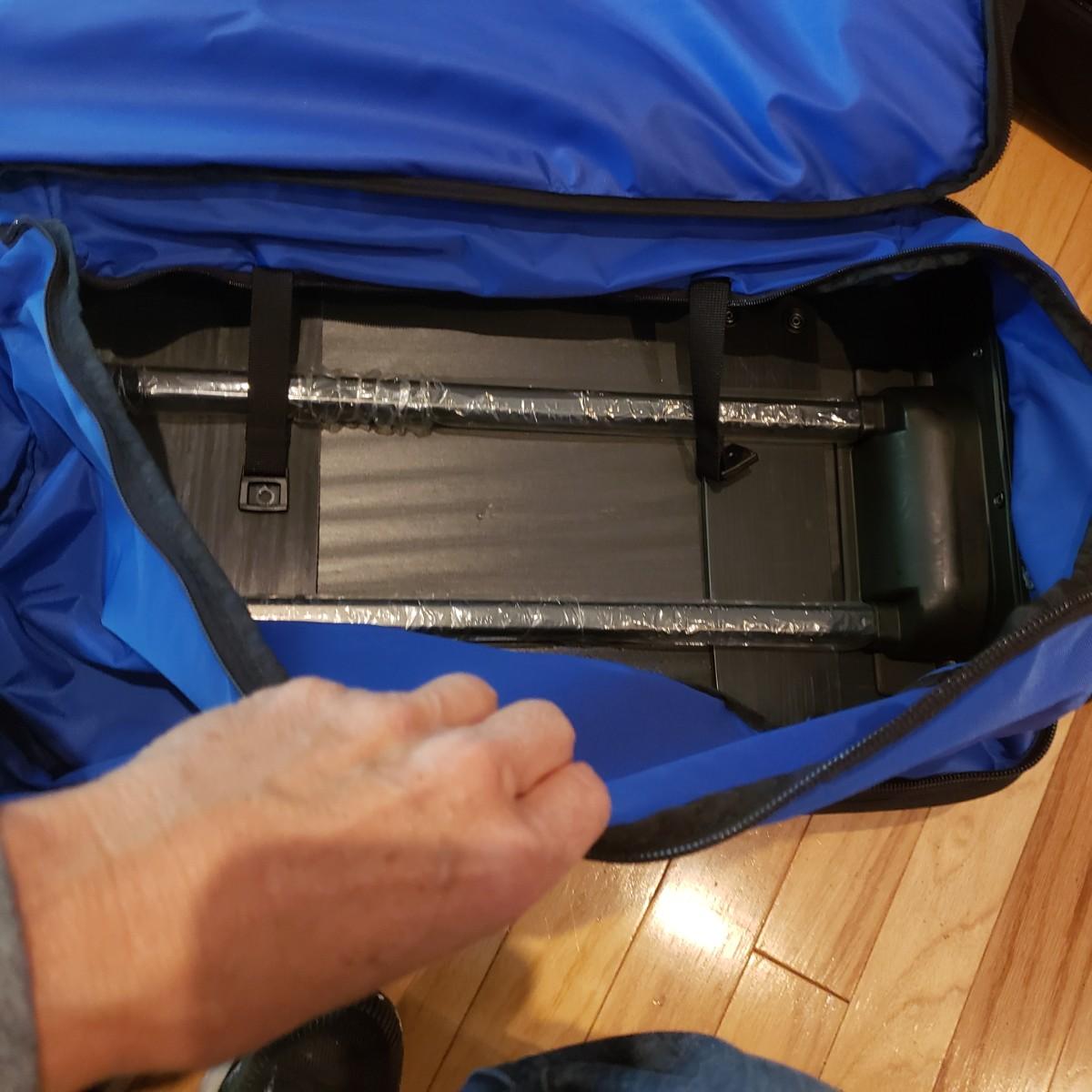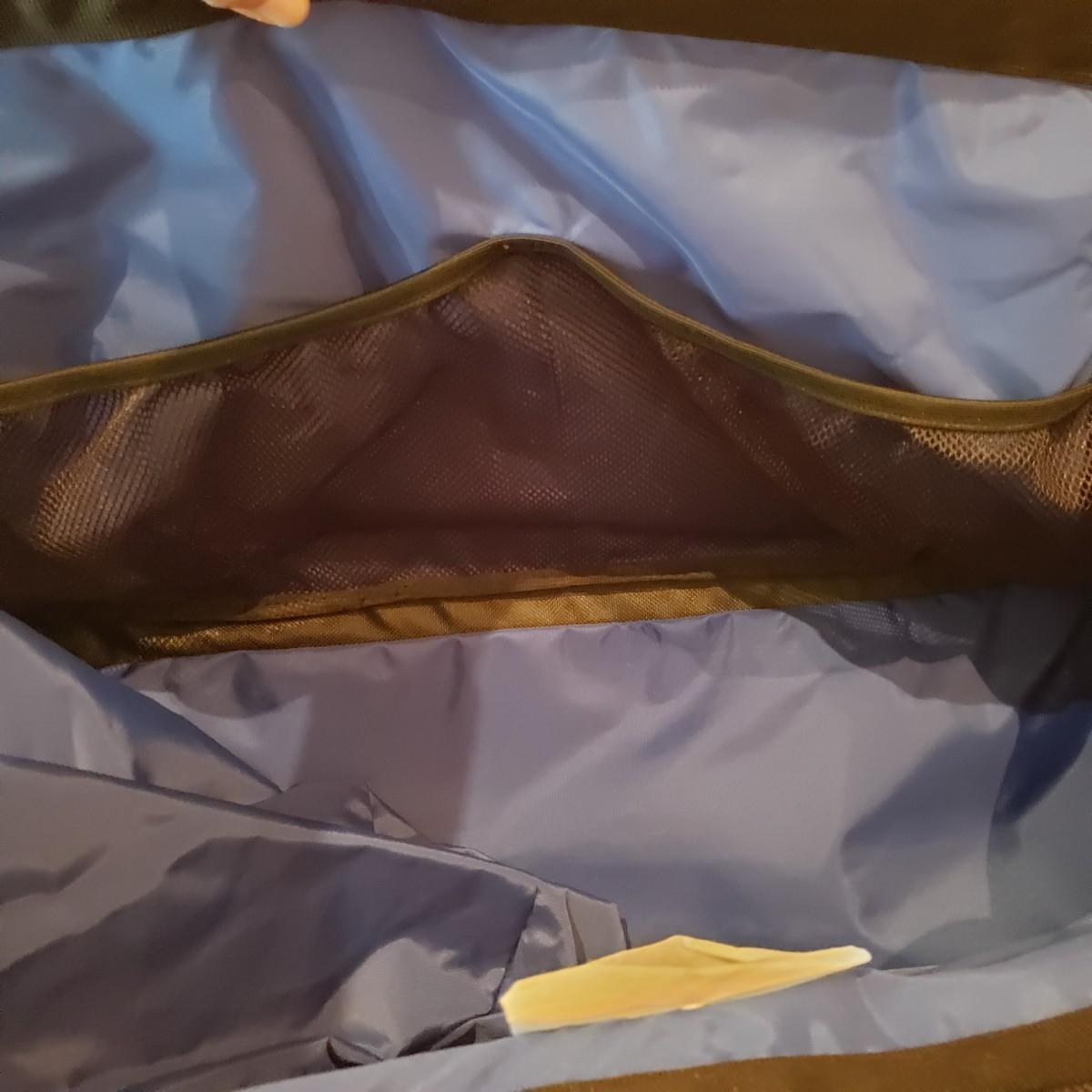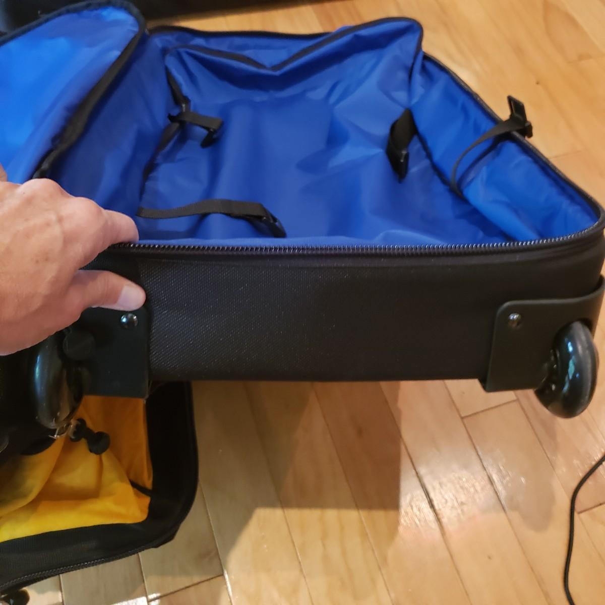 These two identical, other than the monograms (ACS/EAS) and colors are L.L.Bean Traveler rolling bags. (23" x 17" x 16"H) Talk about storage! These bags are loaded with compartments and pockets! There is the wide mouth, main area in the center with two mesh pockets on the sides, but there is also a storage area which you can see from the main section, but access it from the zipper, near the outside end handle. The main area is reinforced with metal rods around the zipper. The bottom storage area (26" x 15" x 5"H has another zippered area which exposes the support bars. There are two handles at each end and one at the top. The fabric is a sturdy, thick, soft sided canvas. There appear to be no blemishes on either bag. There appear to be barely used.