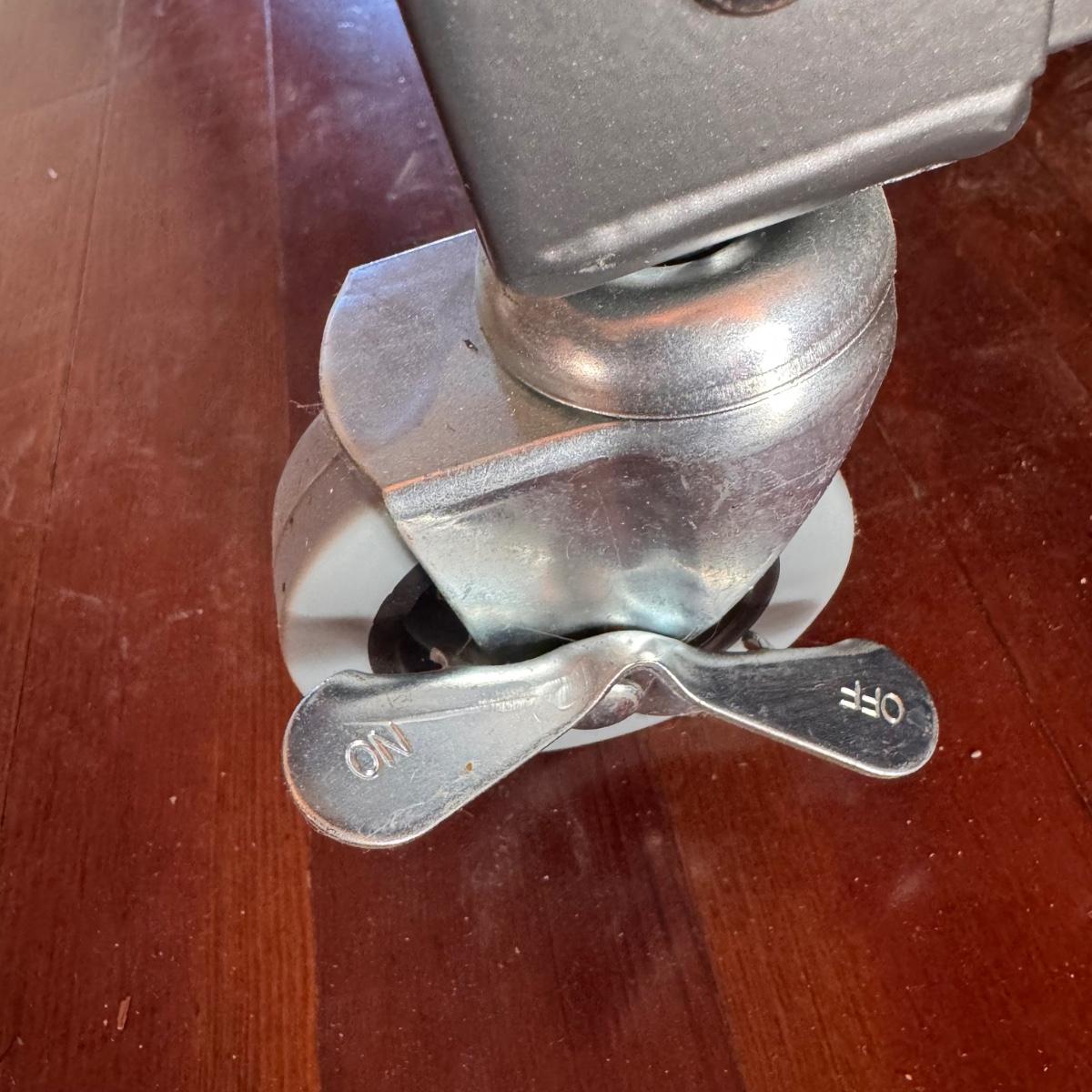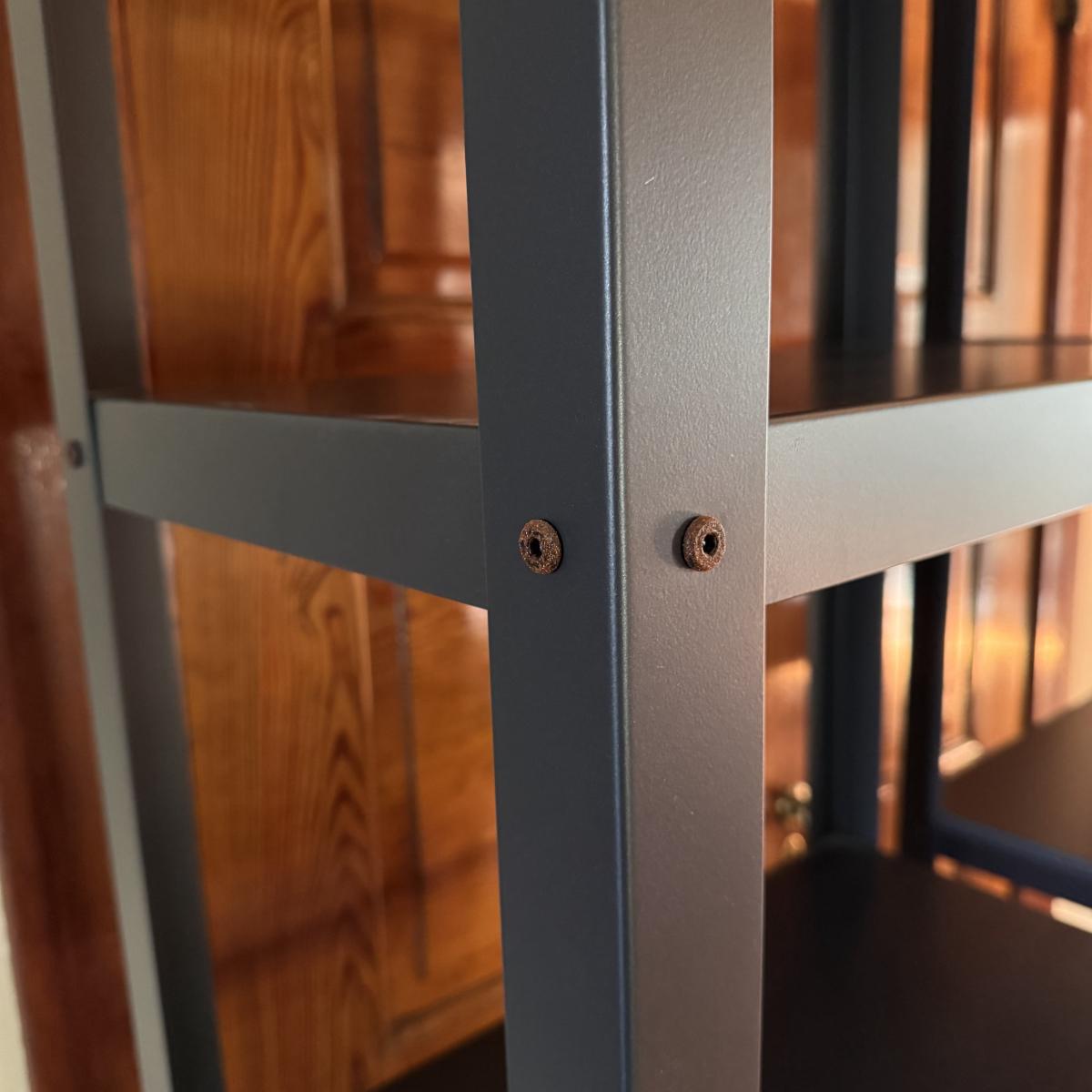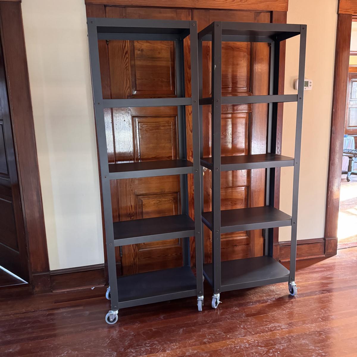 Lot includes two matching metal shelves that are on wheels. There are four shelves on each - five shelves if you include the top. There is one scratch on one of the shelves - see picture included. They individually measure 24” x 14” x 72”H. These shelves match another lot in this sale titled “Sturdy Metal Table on Wheels.” Local pickup only. Both shelves are located up a flight of stairs. Winning bidder must bring assistance to help move and load this item due to its weight and/or size..