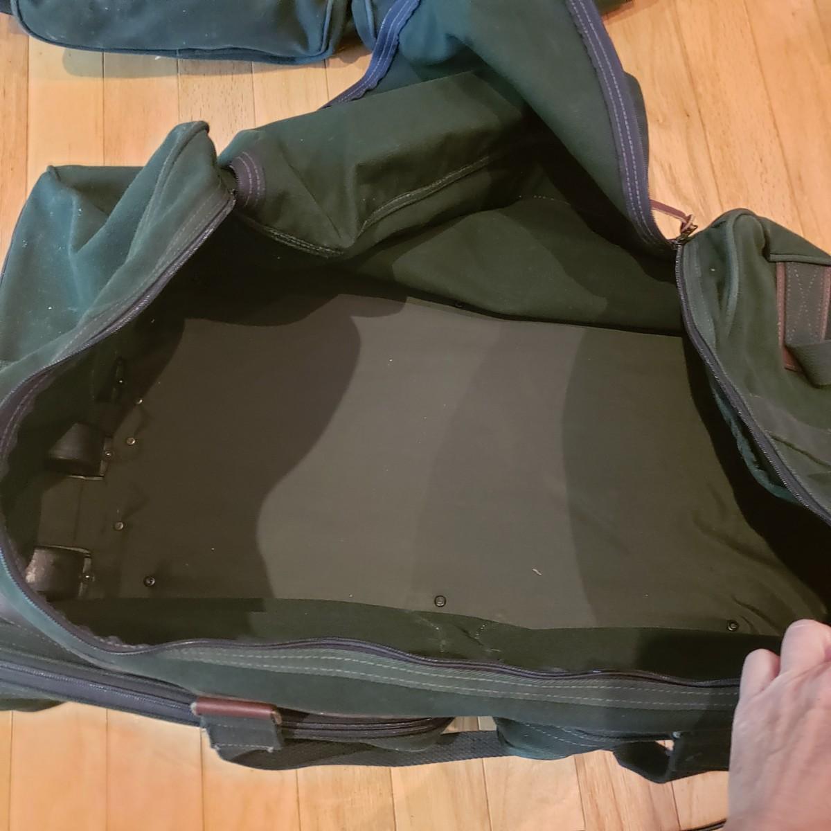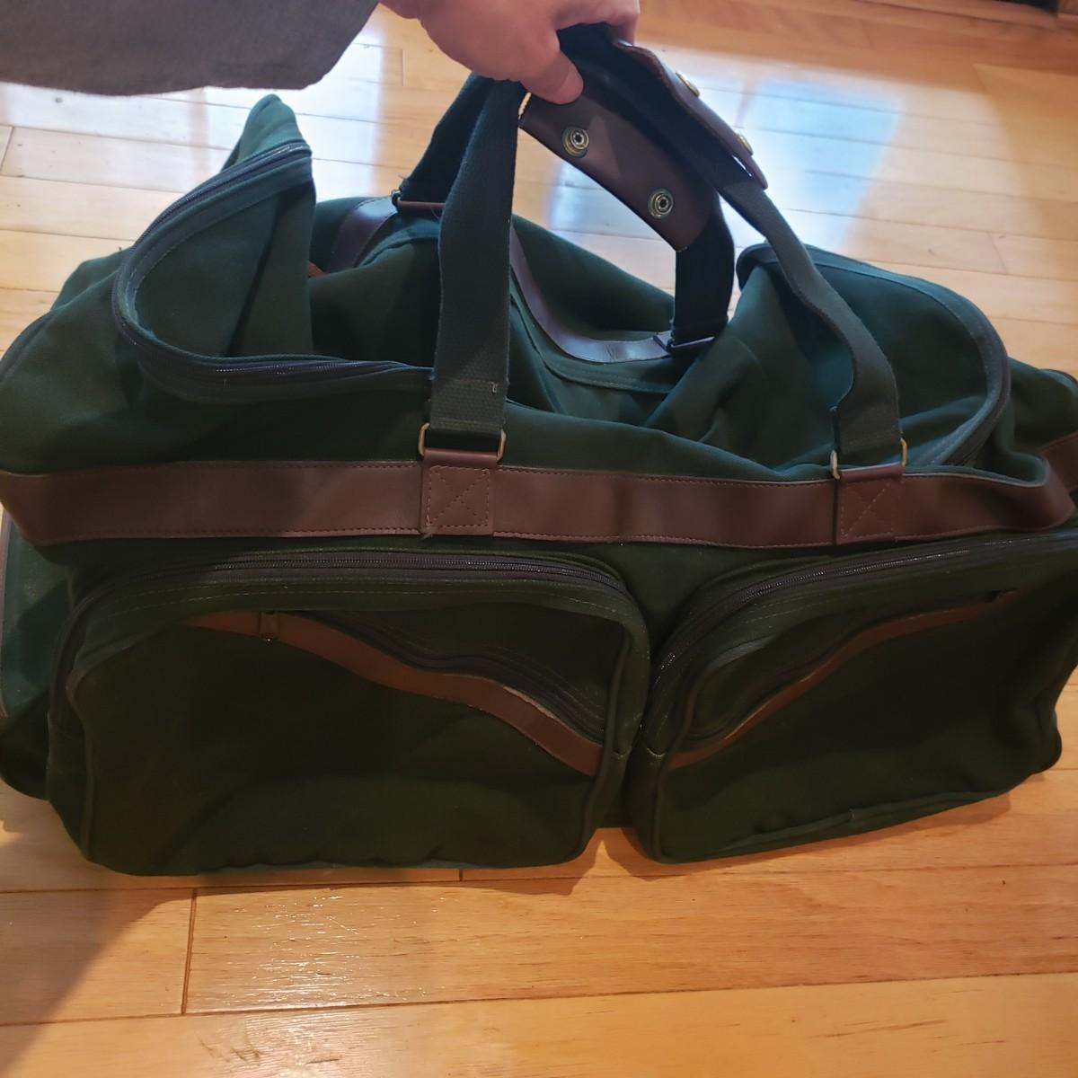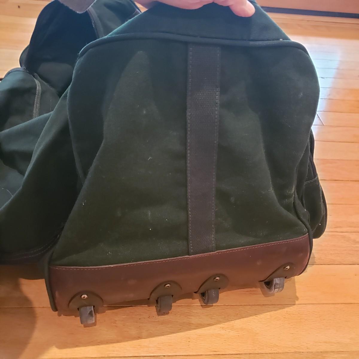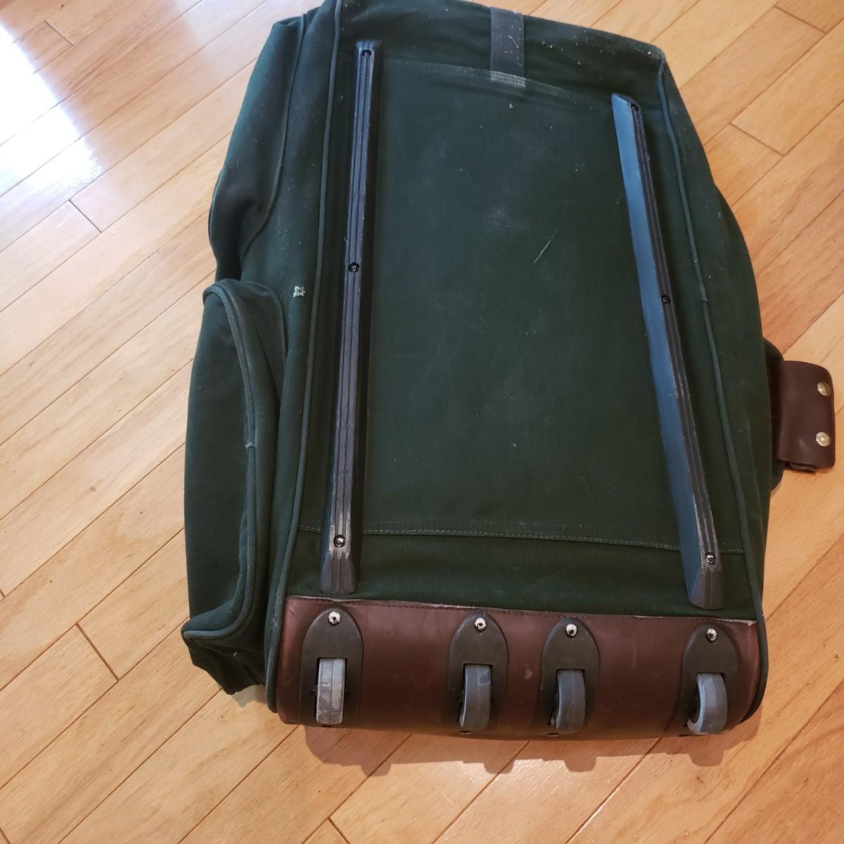 These two identical Orvis dark green and leather trimmed canvas bags with rollers measure 17" x 29" x 16" H. There are handles on top that snap for carrying or a handle at the end so you can roll it. The canvas is heavy duty. The second bag has a couple of worn spots, see last two pictures. The first bag has one small spot as seen pointed to in the picture.