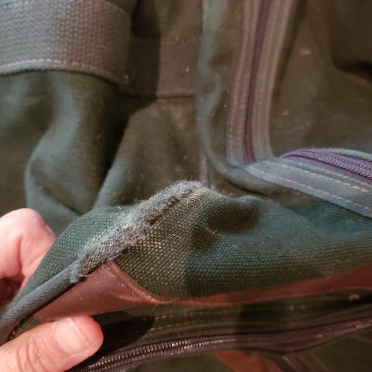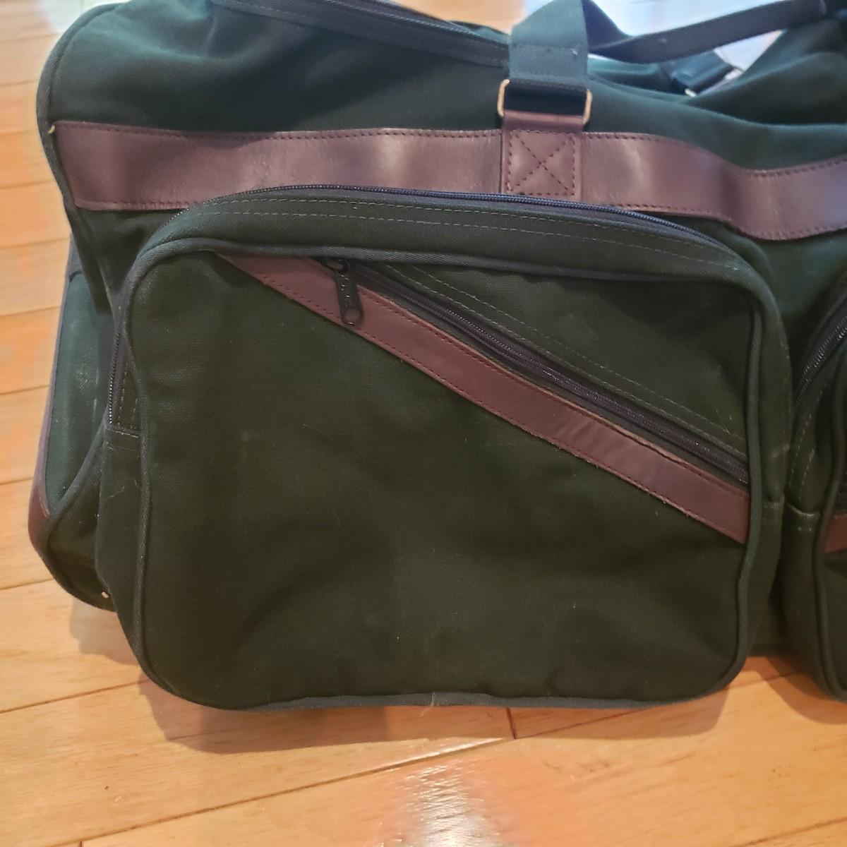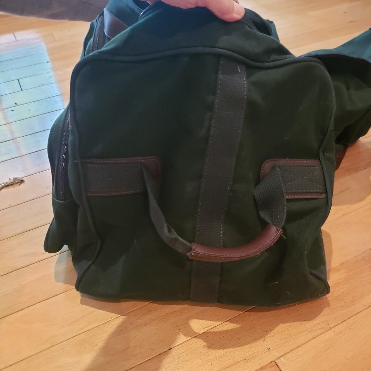 These two identical Orvis dark green and leather trimmed canvas bags with rollers measure 17" x 29" x 16" H. There are handles on top that snap for carrying or a handle at the end so you can roll it. The canvas is heavy duty. The second bag has a couple of worn spots, see last two pictures. The first bag has one small spot as seen pointed to in the picture.