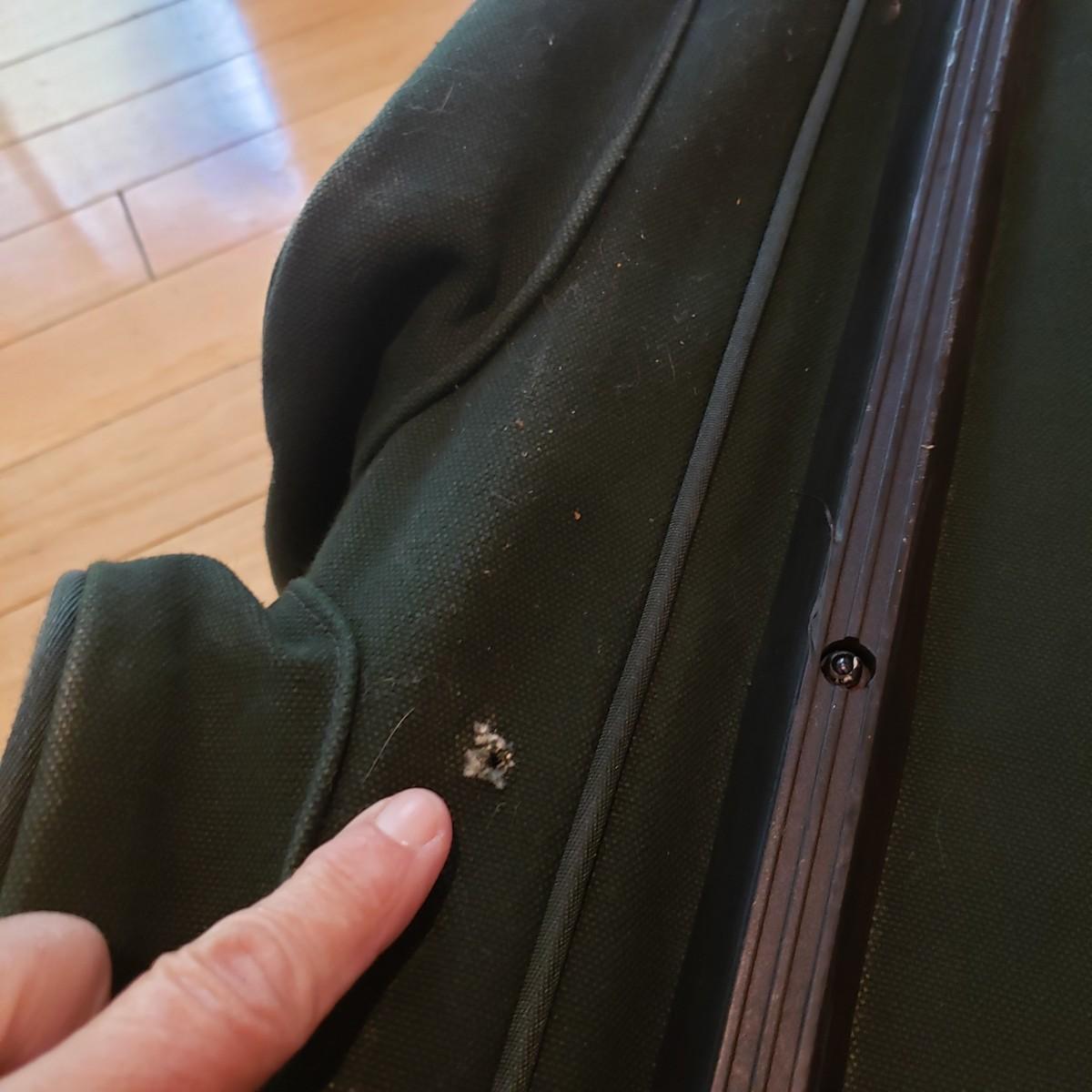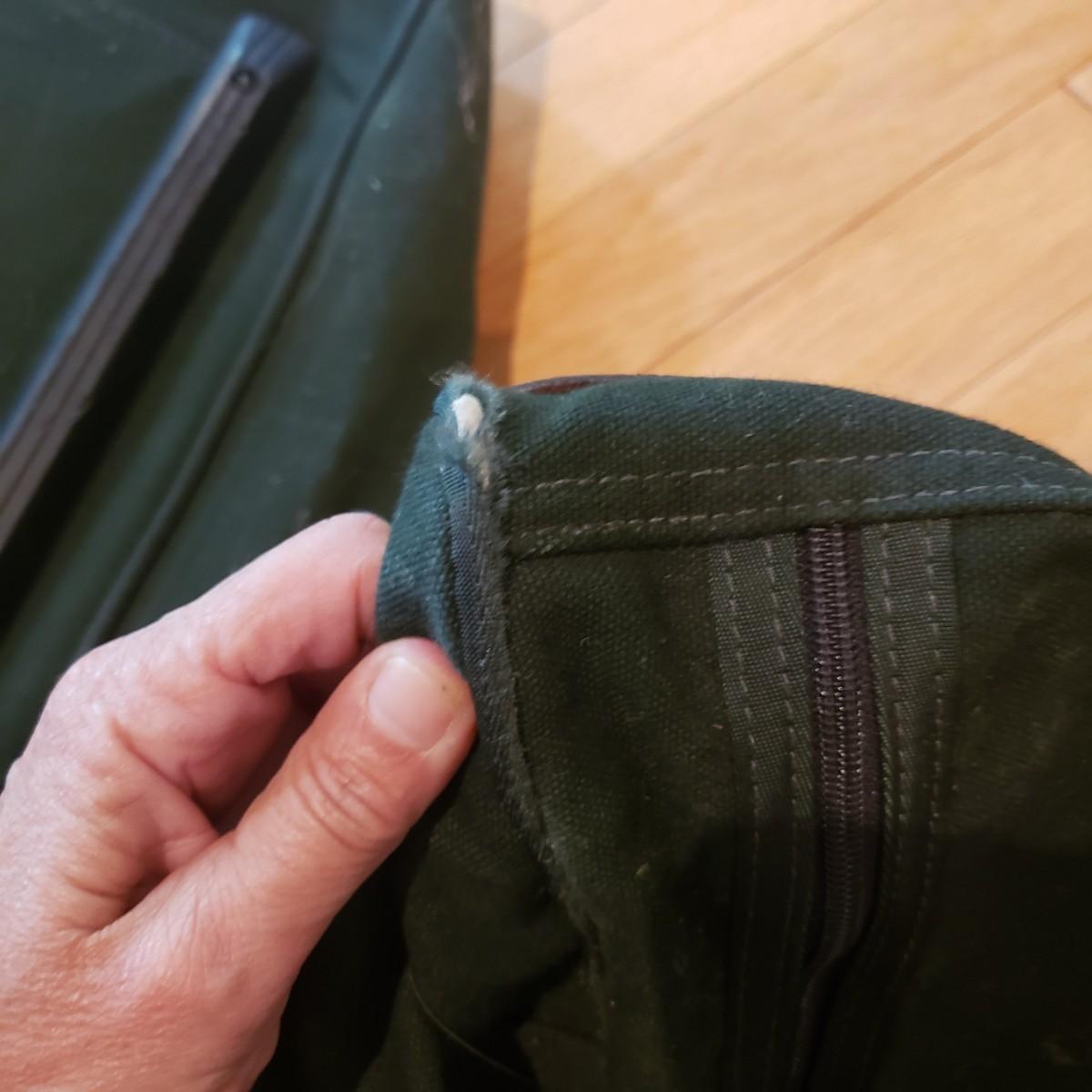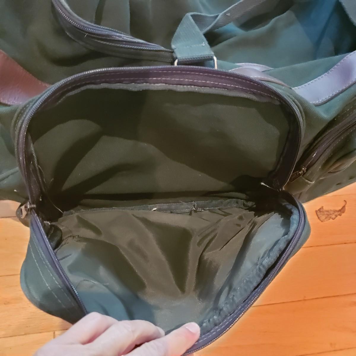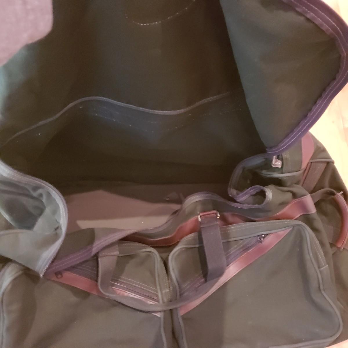 These two identical Orvis dark green and leather trimmed canvas bags with rollers measure 17" x 29" x 16" H. There are handles on top that snap for carrying or a handle at the end so you can roll it. The canvas is heavy duty. The second bag has a couple of worn spots, see last two pictures. The first bag has one small spot as seen pointed to in the picture.