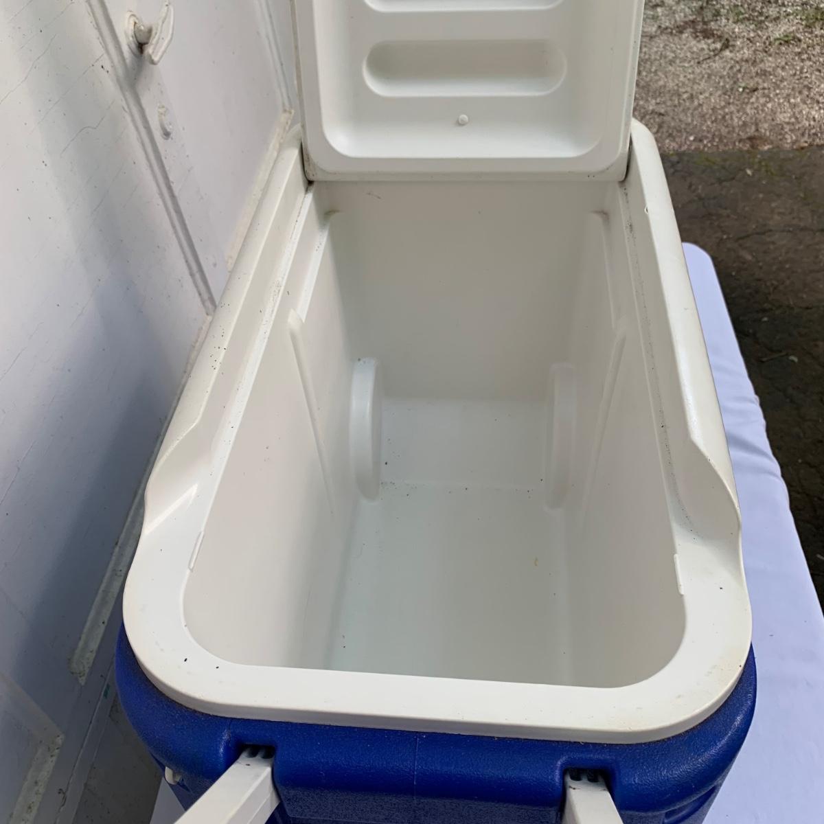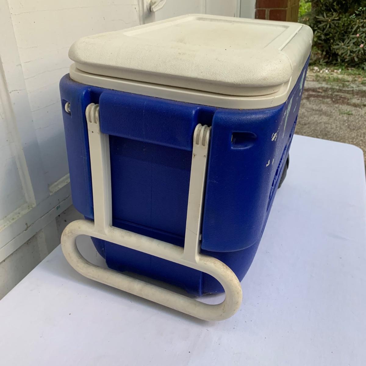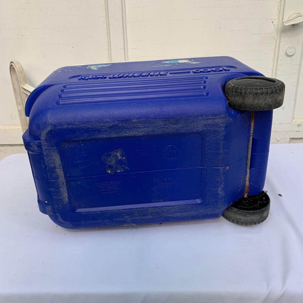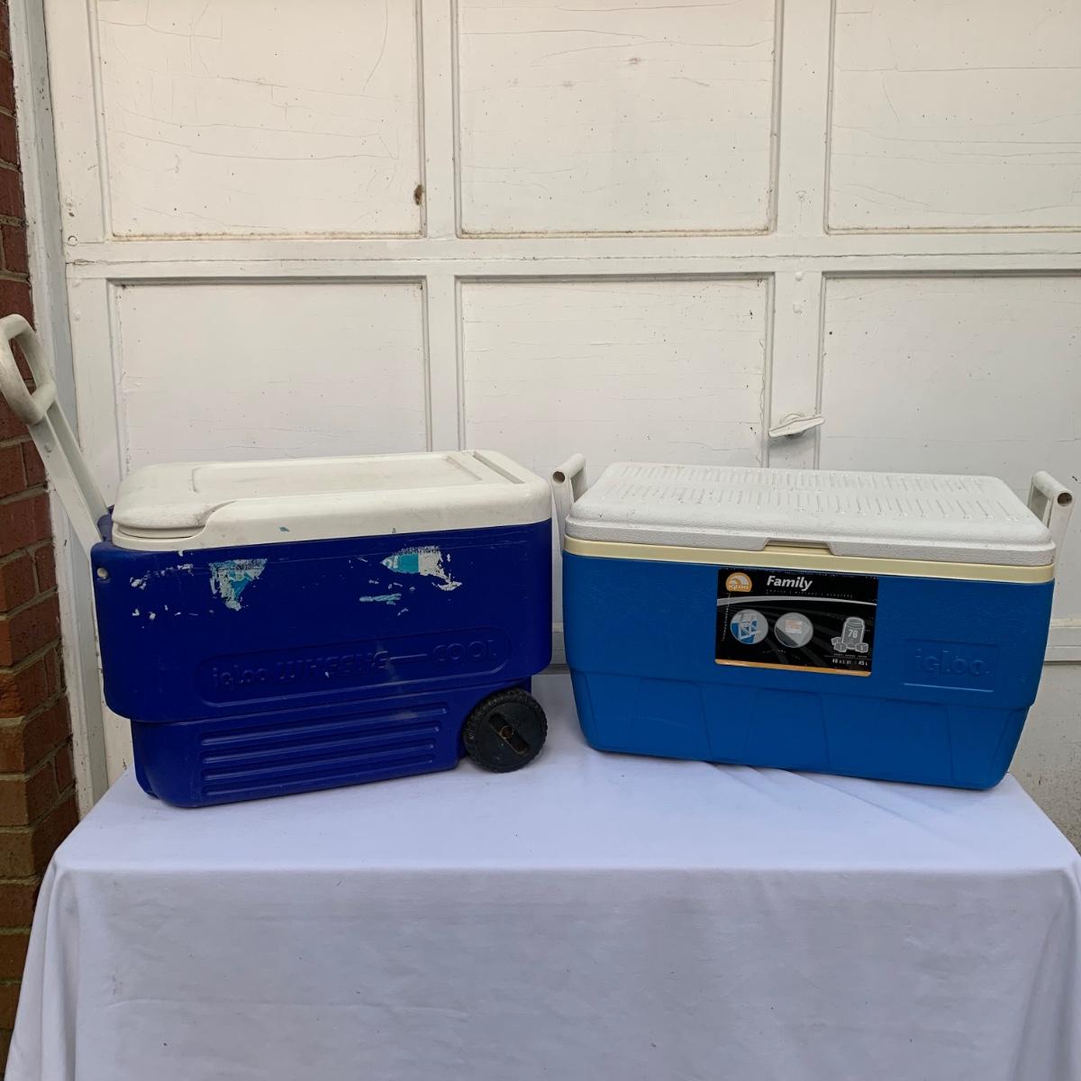 Two blue plastic Igloo coolers. The one without wheels has a 48 qt. capacity and can hold 76 cans. The bottom of this one is slightly uneven, but it is still sturdy. This cooler measures 24” x 14” x 15”. The Igloo “Wheelie Cool” cooler appears to be just slightly smaller. Both are a bit dirty from use. Local pickup only.