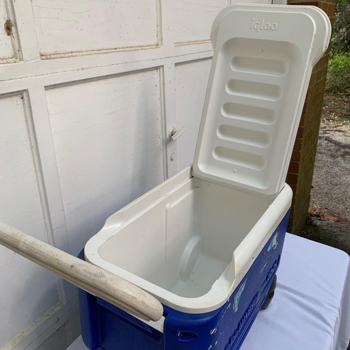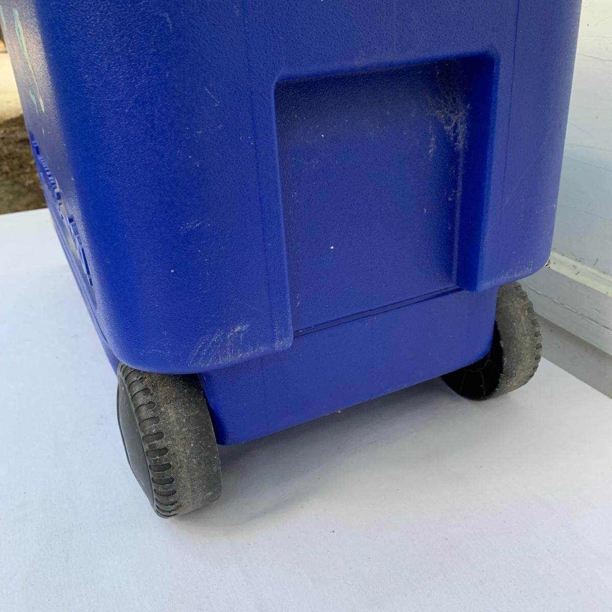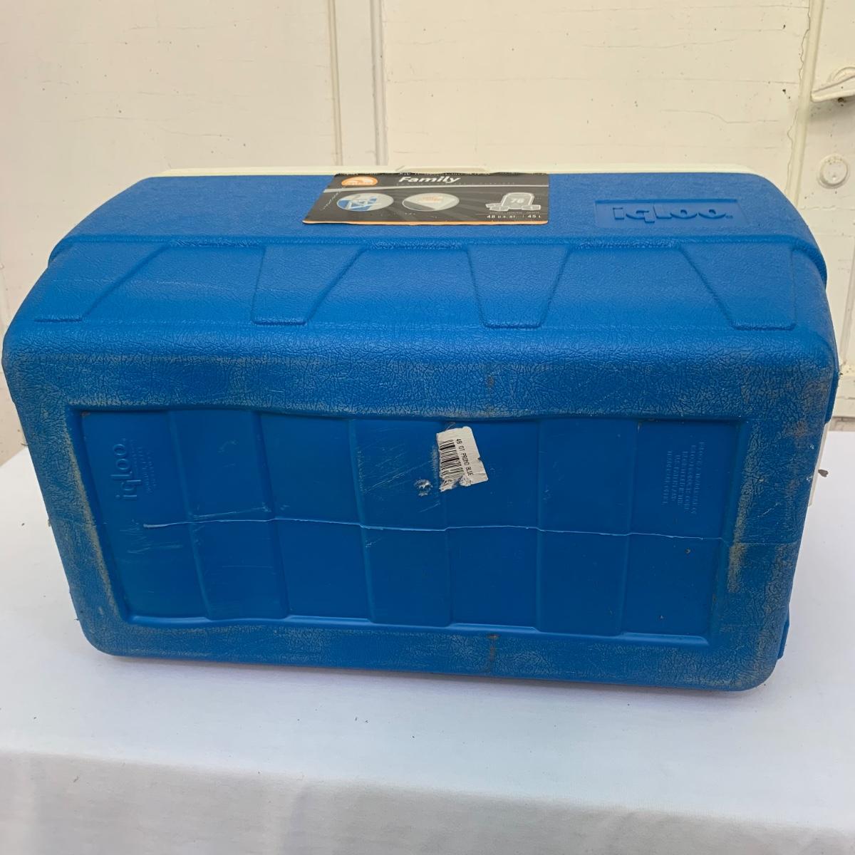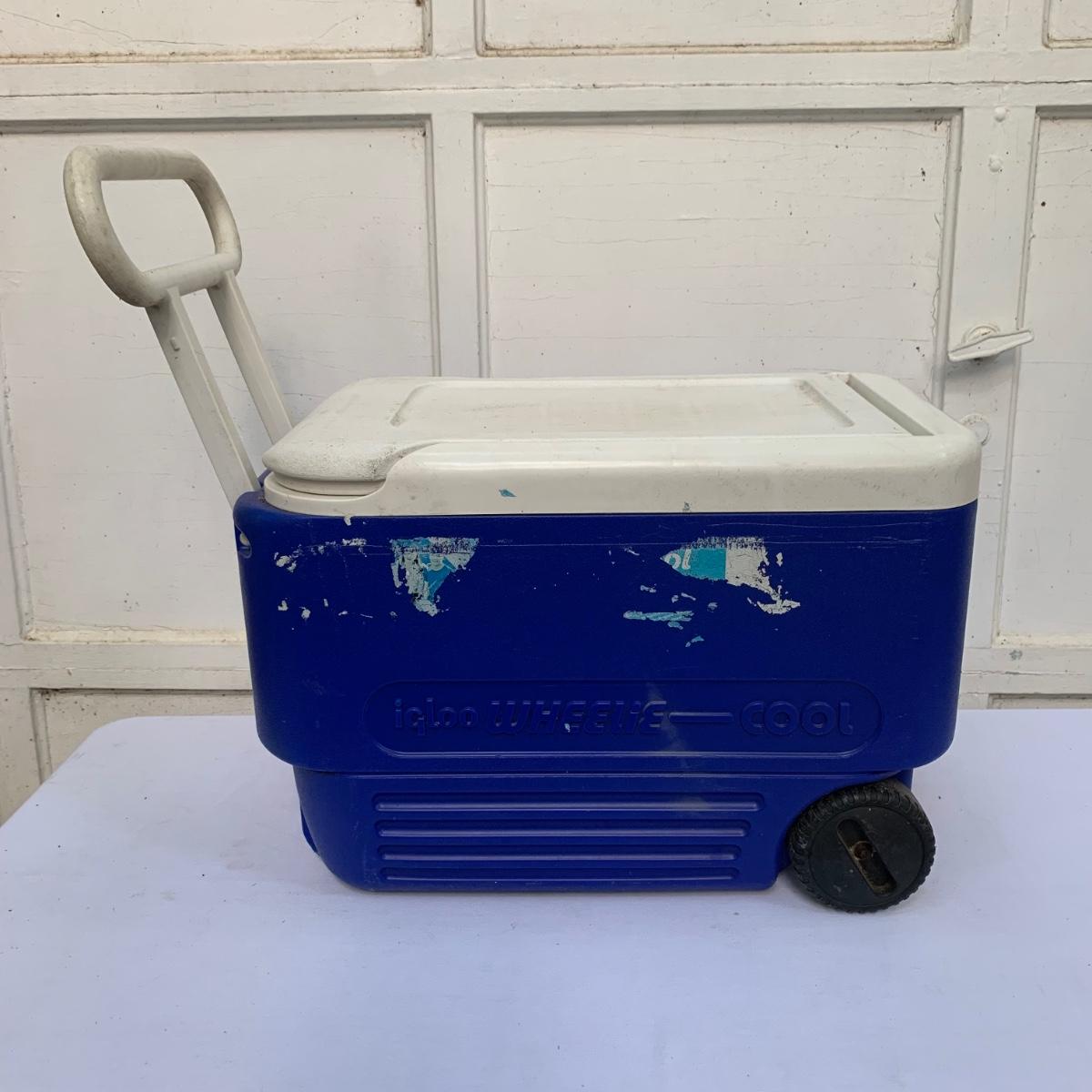 Two blue plastic Igloo coolers. The one without wheels has a 48 qt. capacity and can hold 76 cans. The bottom of this one is slightly uneven, but it is still sturdy. This cooler measures 24” x 14” x 15”. The Igloo “Wheelie Cool” cooler appears to be just slightly smaller. Both are a bit dirty from use. Local pickup only.