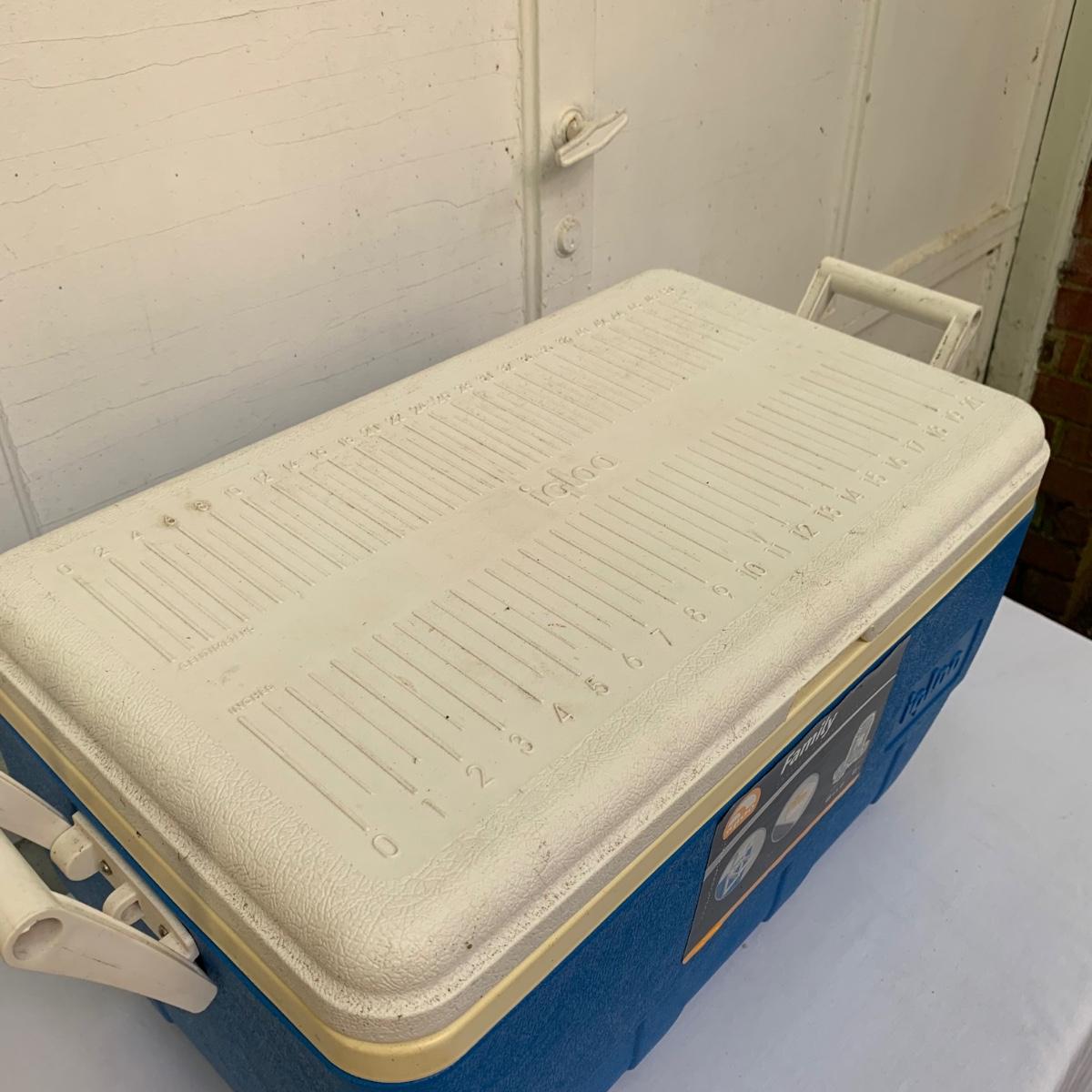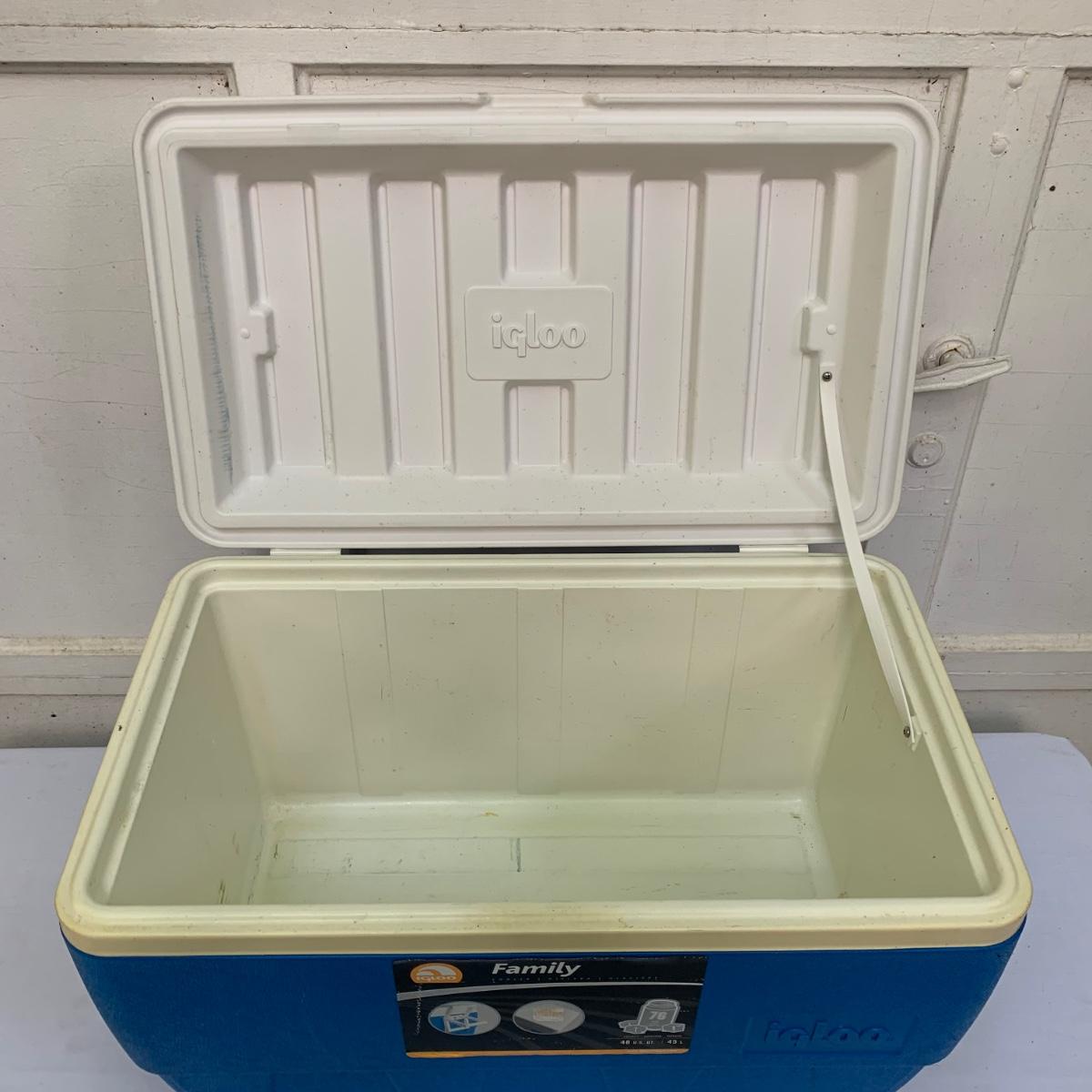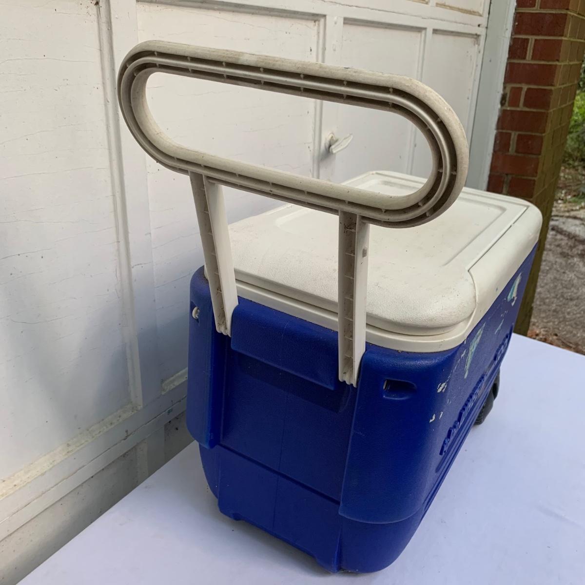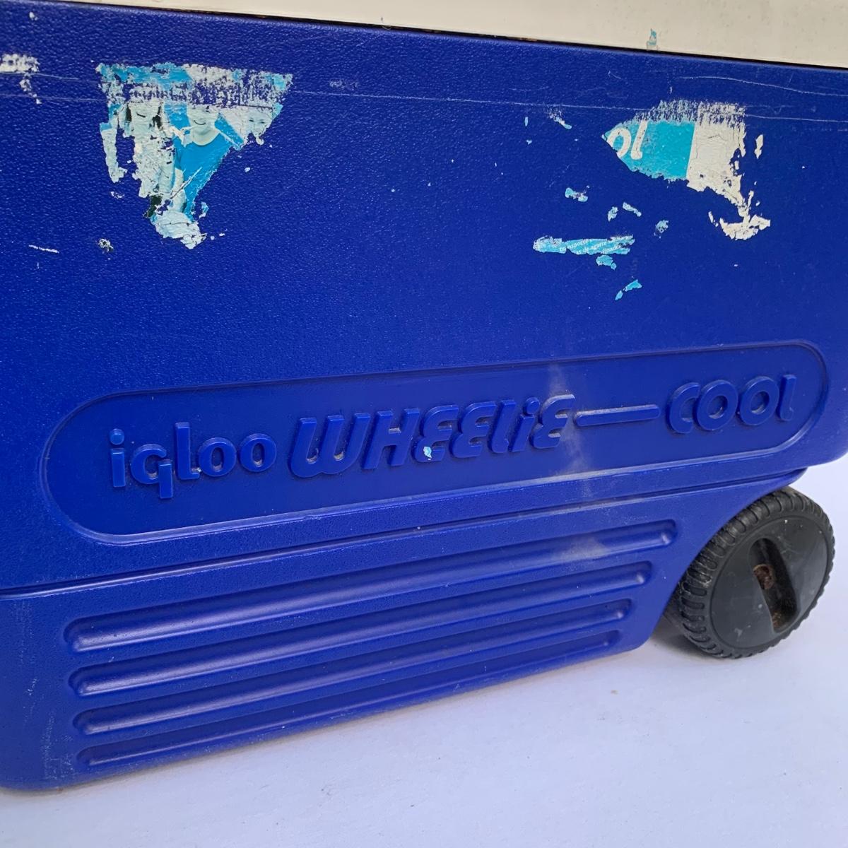 Two blue plastic Igloo coolers. The one without wheels has a 48 qt. capacity and can hold 76 cans. The bottom of this one is slightly uneven, but it is still sturdy. This cooler measures 24” x 14” x 15”. The Igloo “Wheelie Cool” cooler appears to be just slightly smaller. Both are a bit dirty from use. Local pickup only.