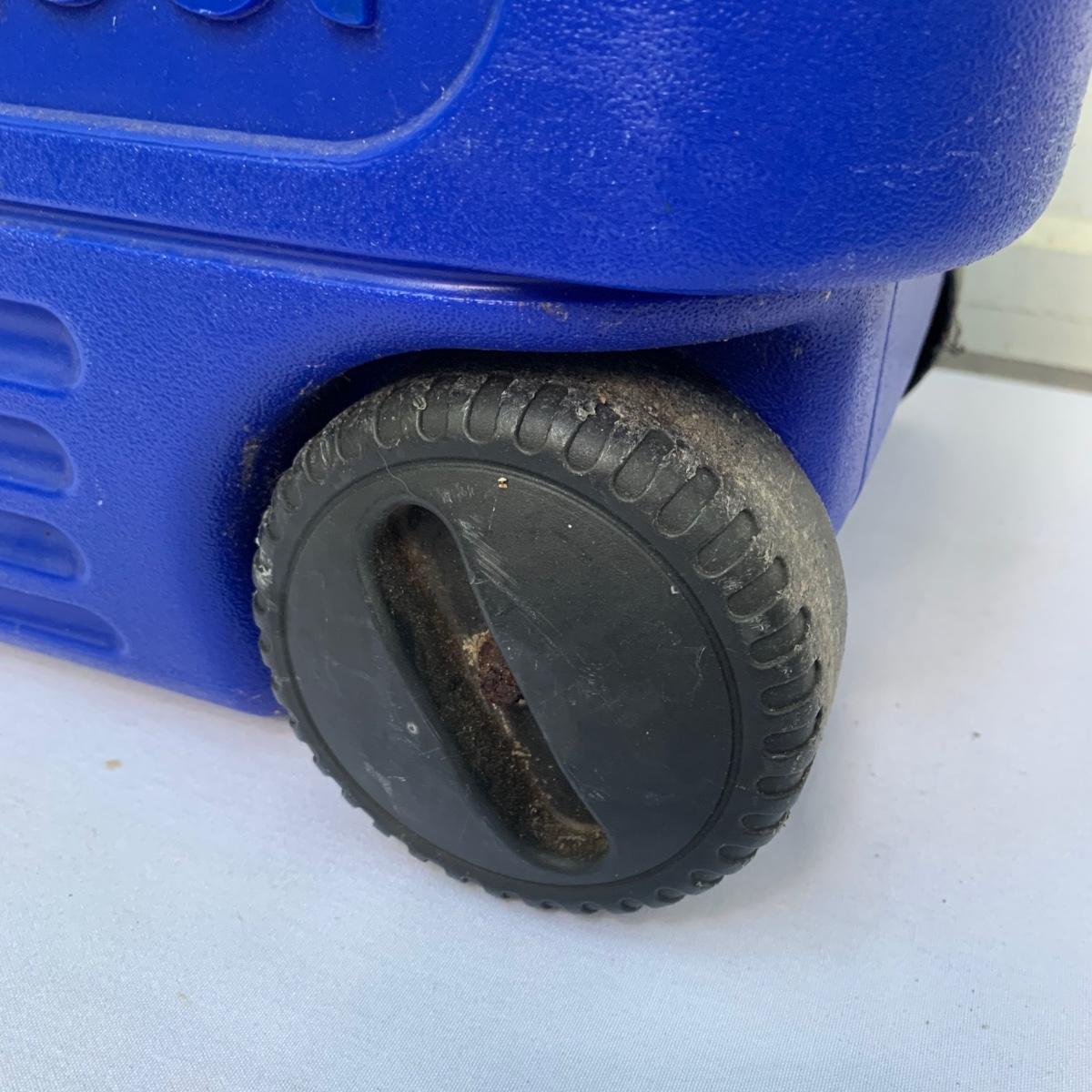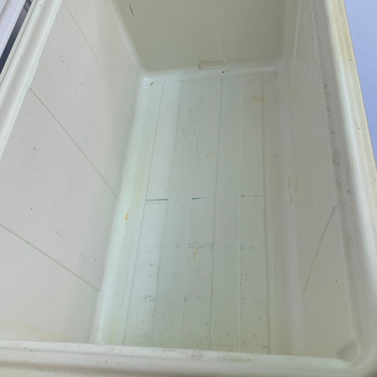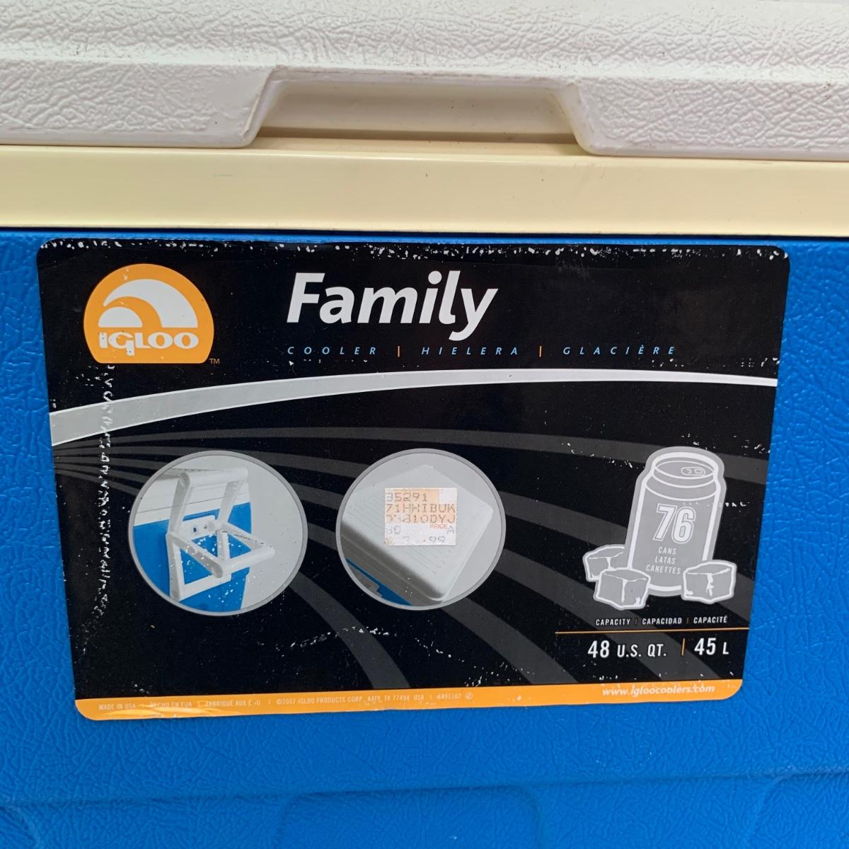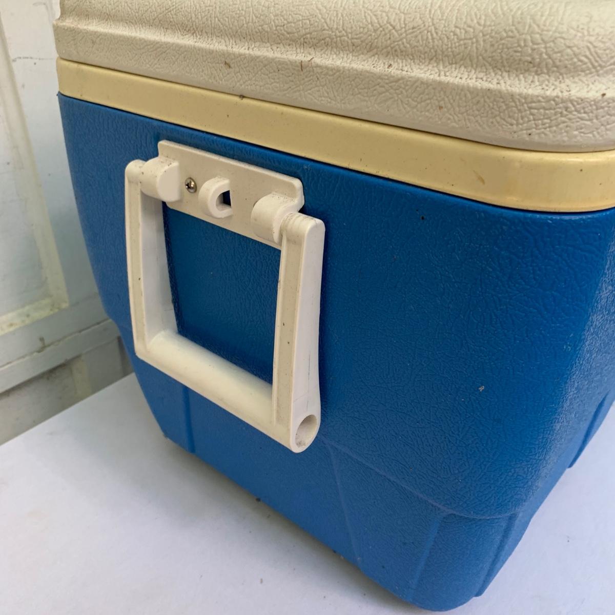 Two blue plastic Igloo coolers. The one without wheels has a 48 qt. capacity and can hold 76 cans. The bottom of this one is slightly uneven, but it is still sturdy. This cooler measures 24” x 14” x 15”. The Igloo “Wheelie Cool” cooler appears to be just slightly smaller. Both are a bit dirty from use. Local pickup only.