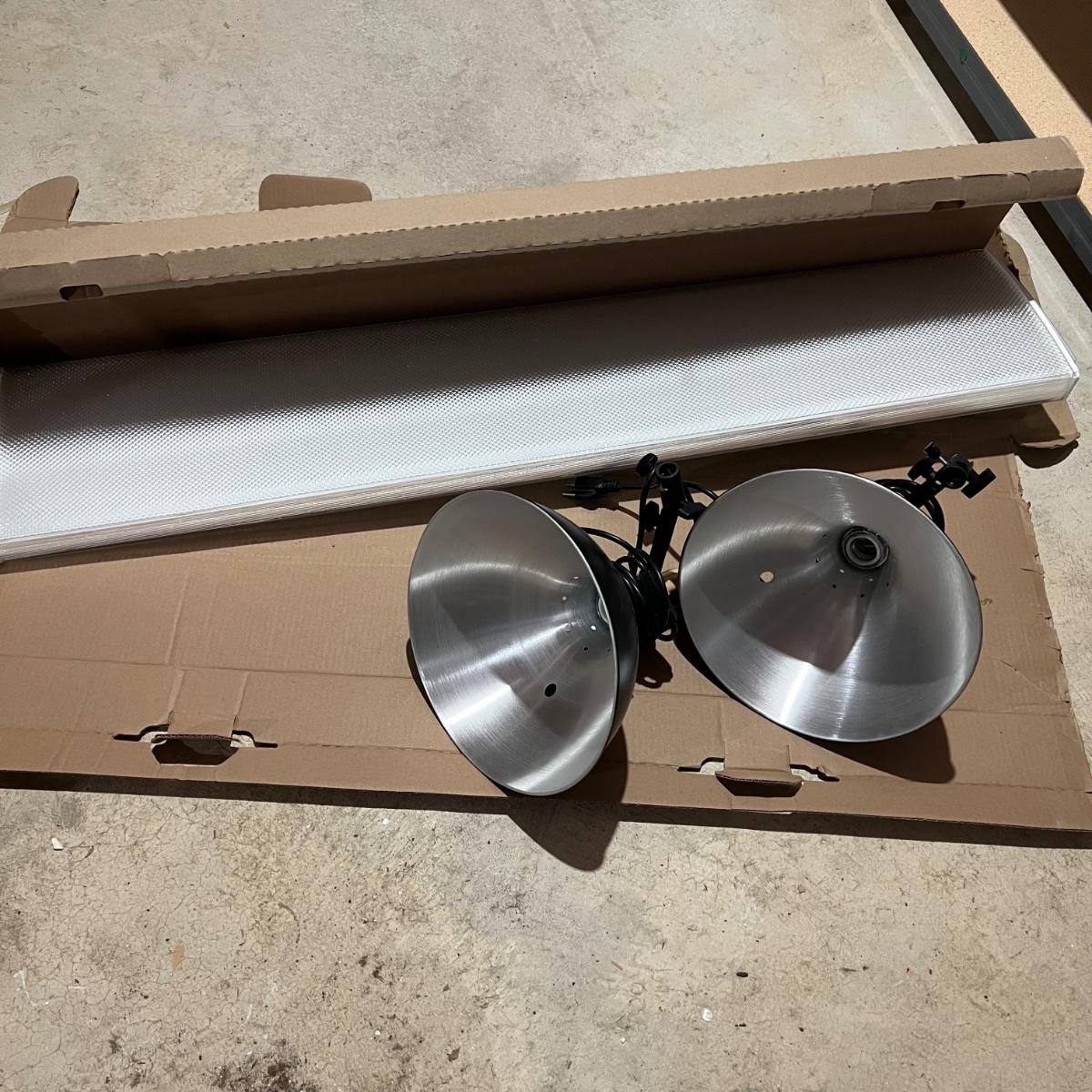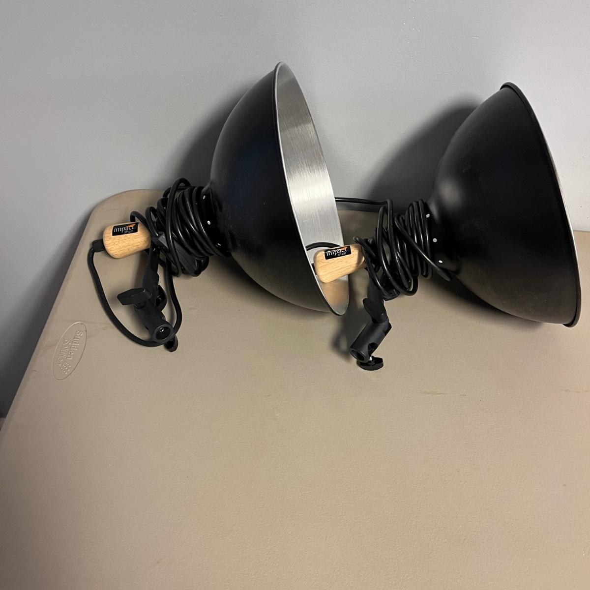 Lot includes two Impact reflector lights. Lights measure 11"D x 12"H. Both lights powered on when plugged in. Both lights have bracket to mount on pole. Also includes NIB LED wraparound light that was not tested. LED light measures 10" x 48" x 2.5"H and is powered by installation (wired).