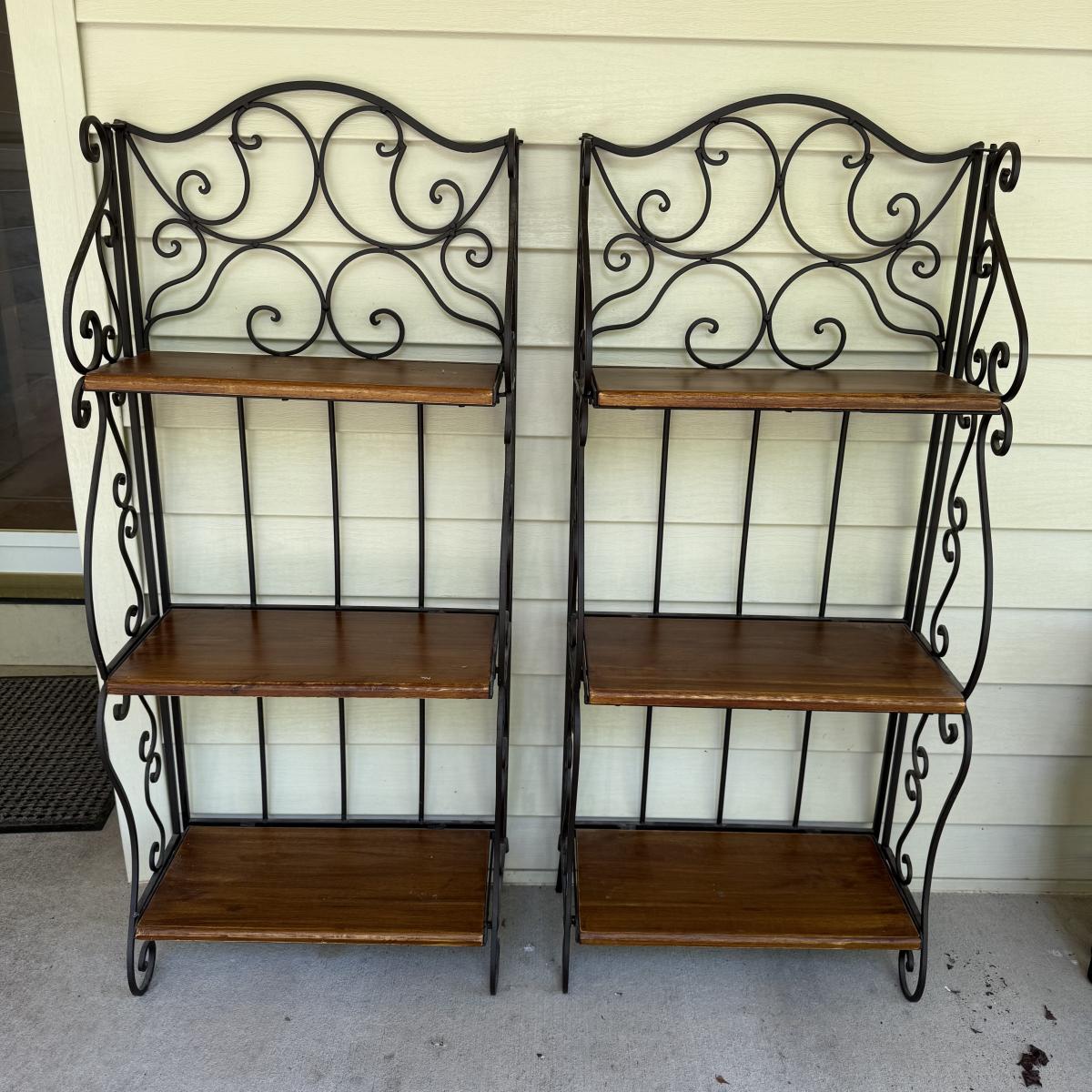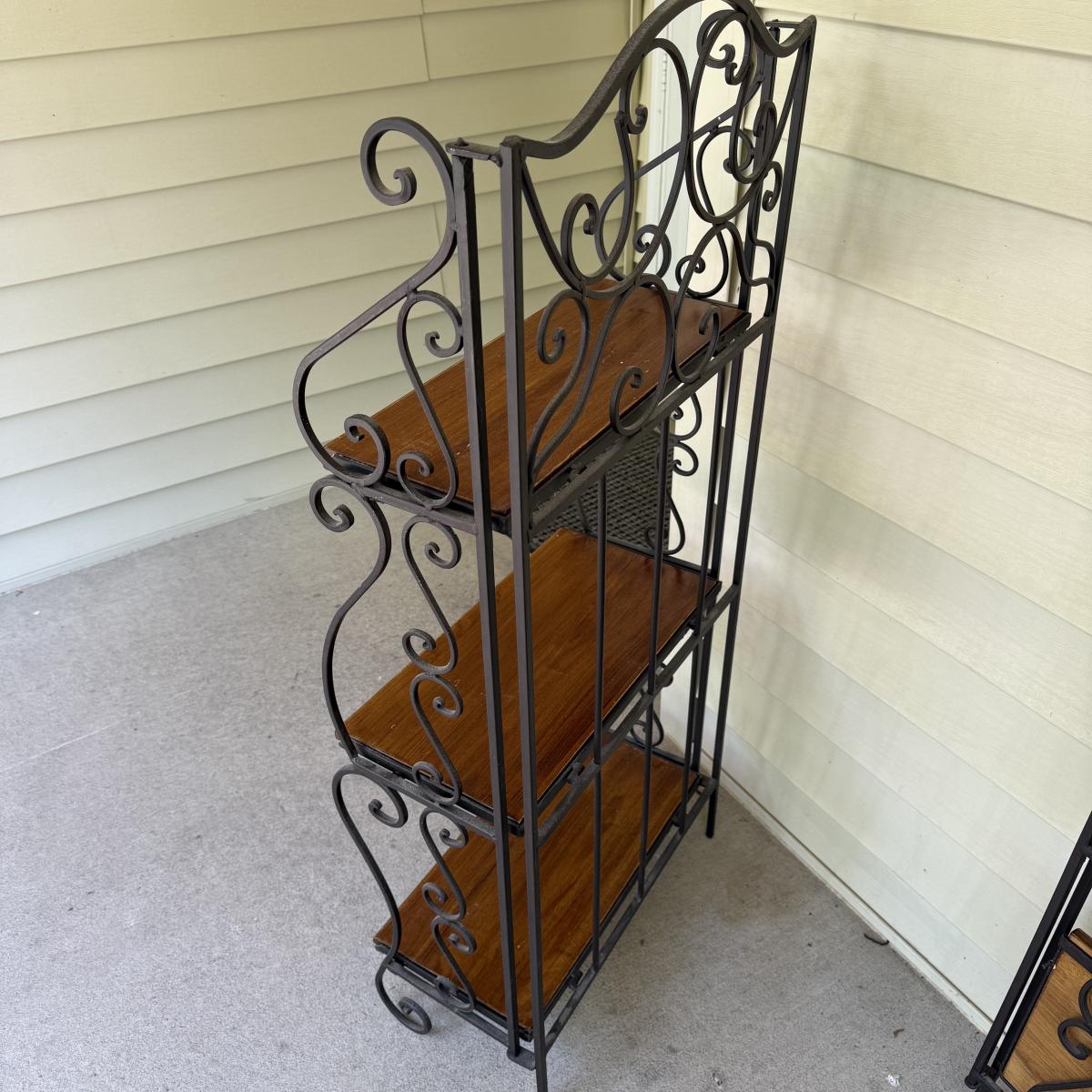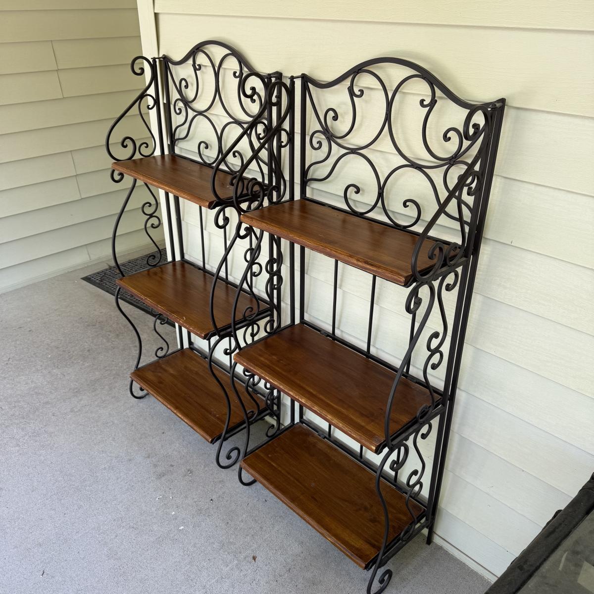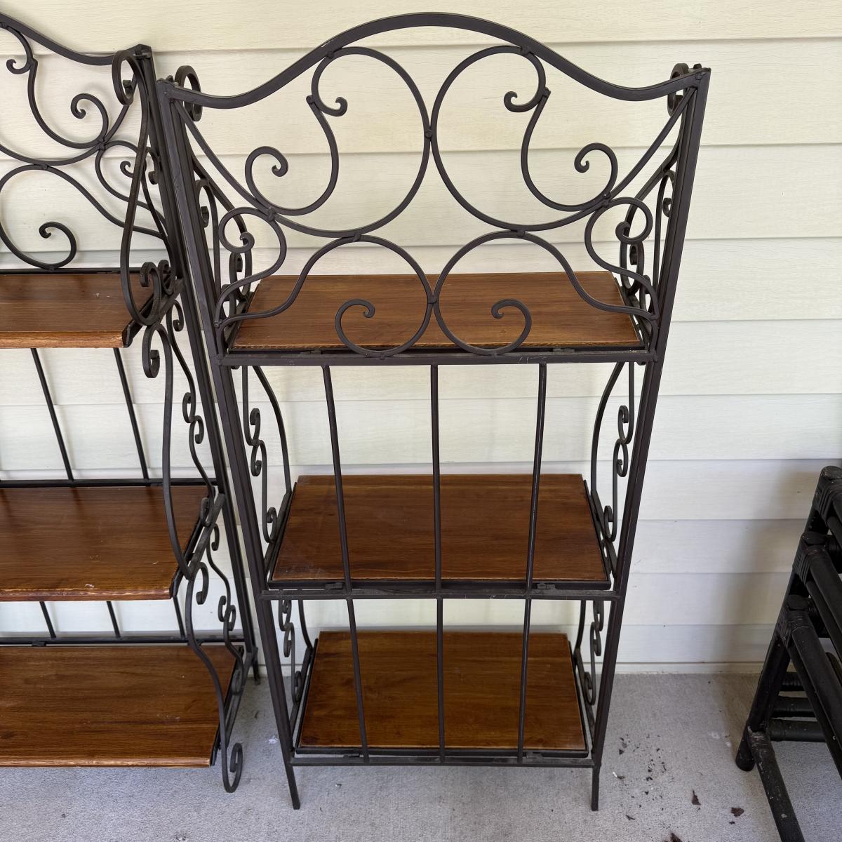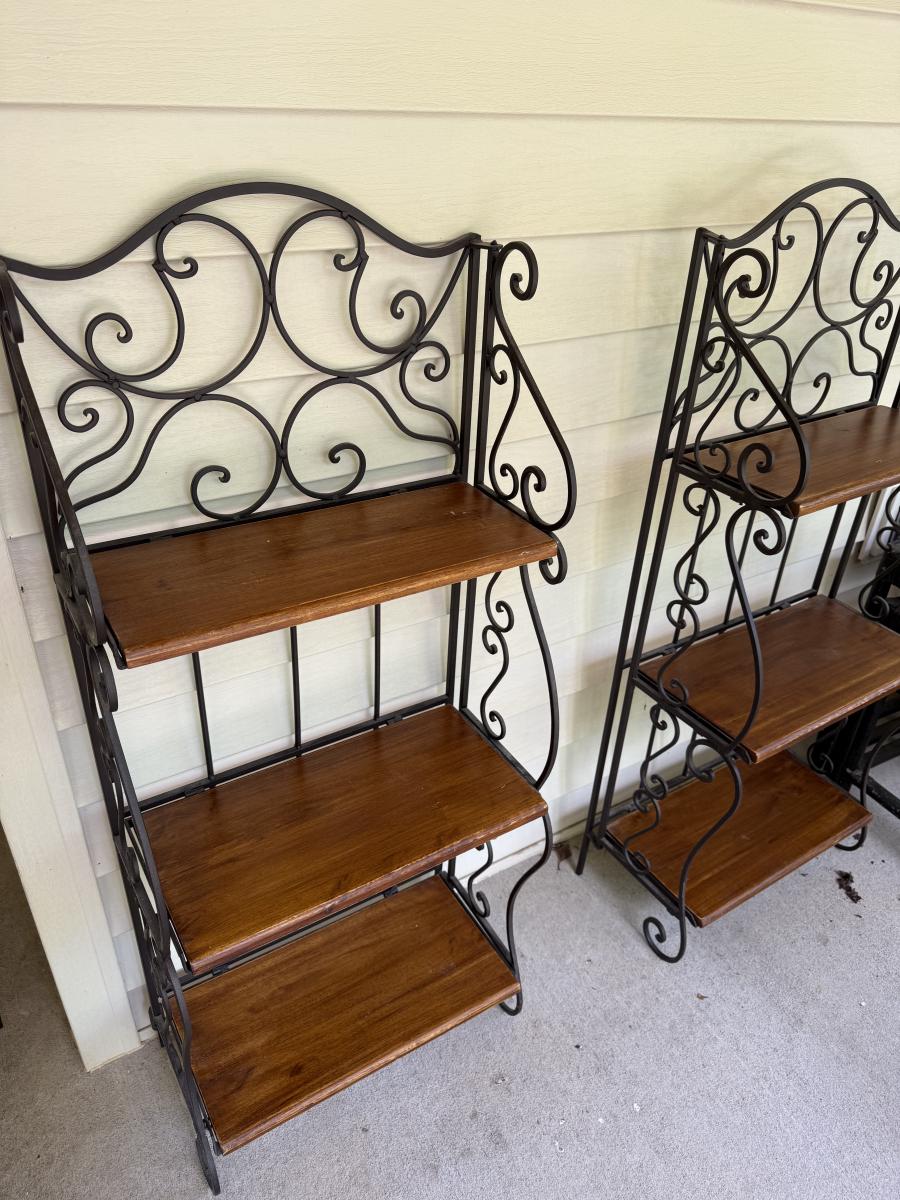 This lot contains a pair of iron and wooden bakers racks. Both of them fold up flat and have three shelves. They both measure 20” x 11” x 46”H. Although these fold they are still on the heavy side. Local pick up only.