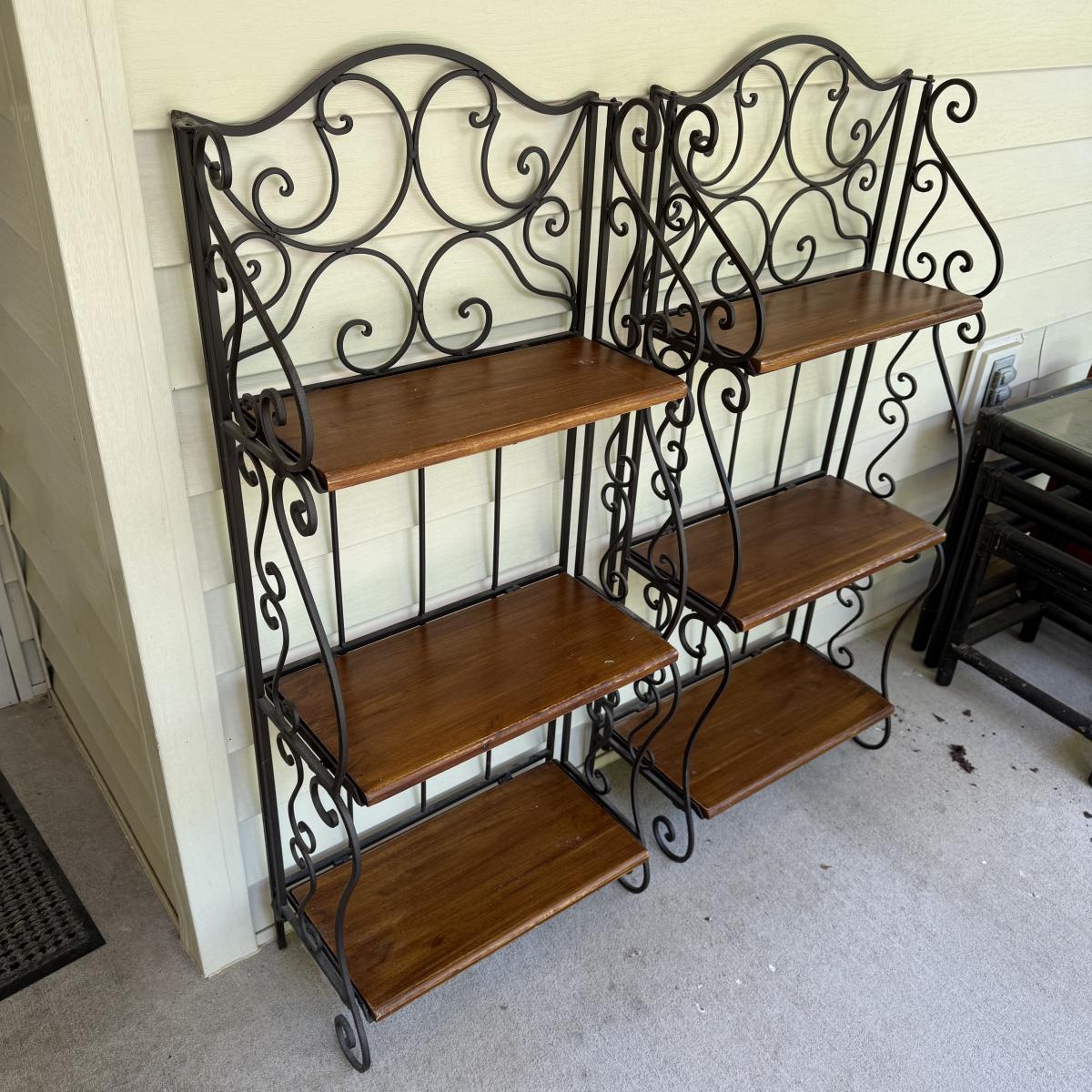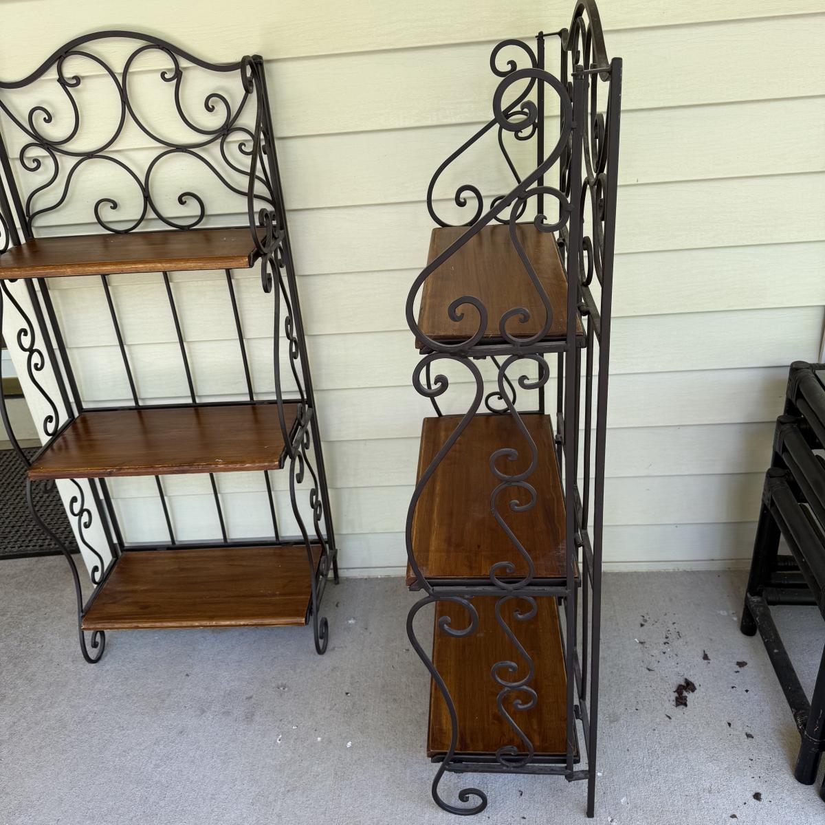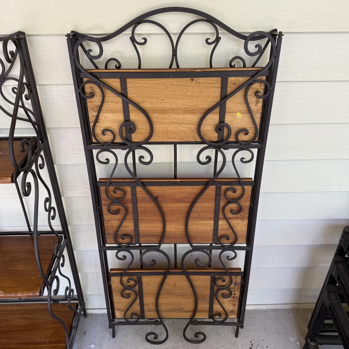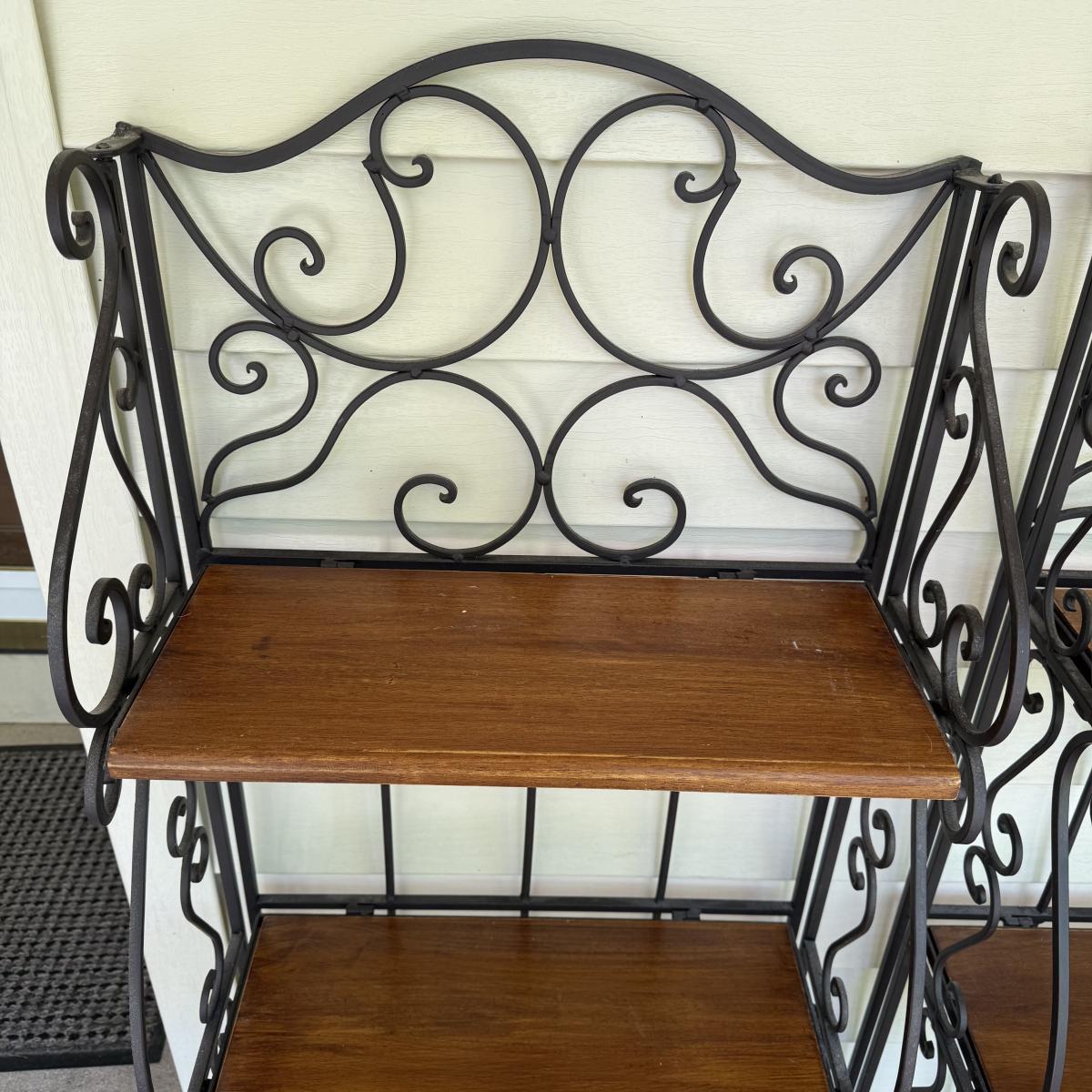 This lot contains a pair of iron and wooden bakers racks. Both of them fold up flat and have three shelves. They both measure 20” x 11” x 46”H. Although these fold they are still on the heavy side. Local pick up only.