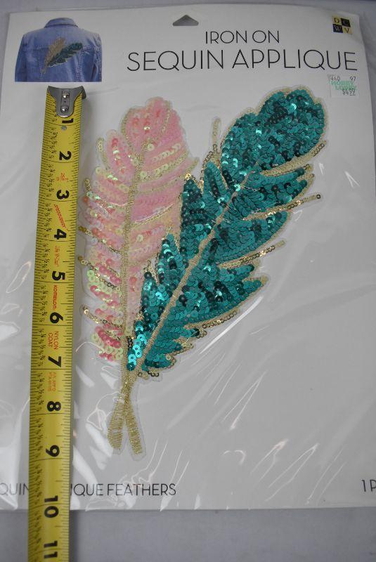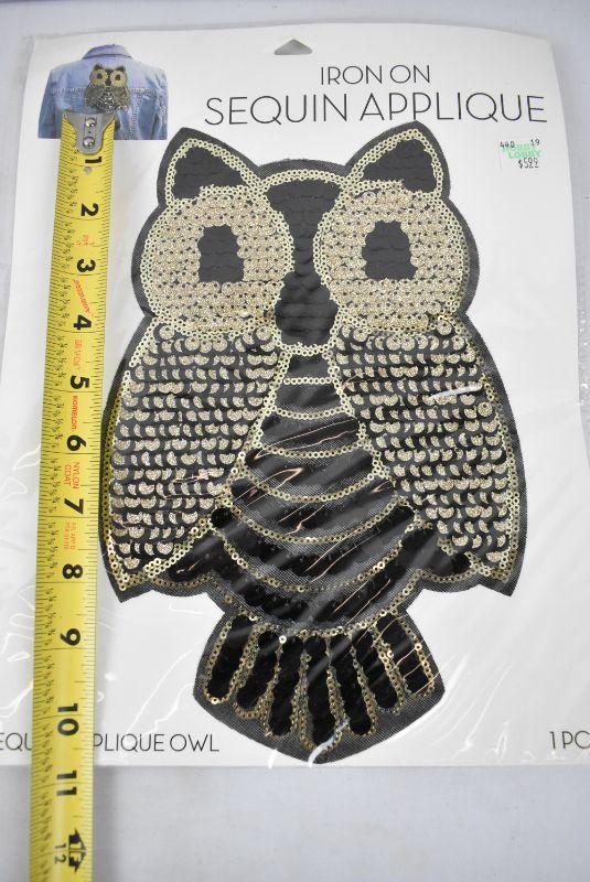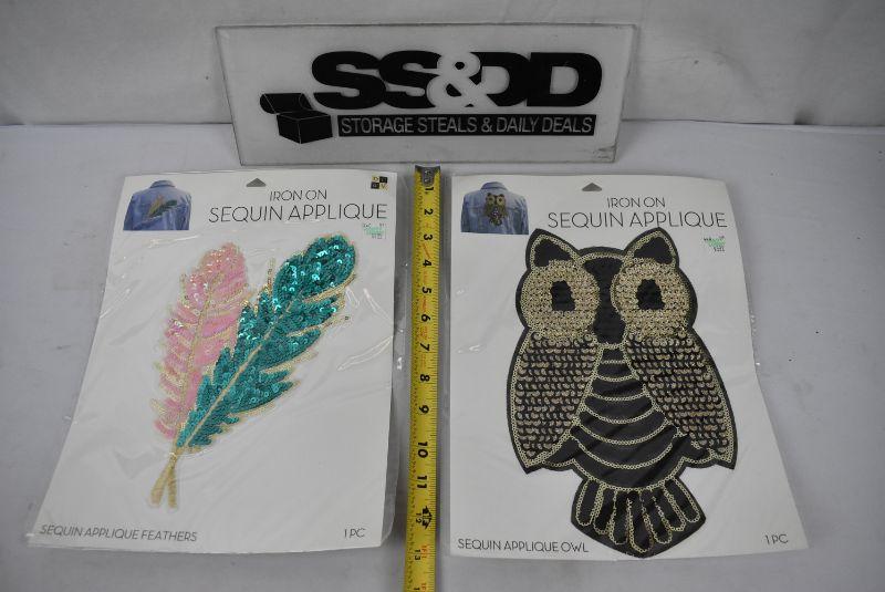 Two Iron On Sequin Appliques: Feathers & Owl - New