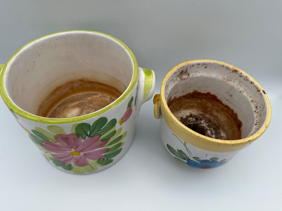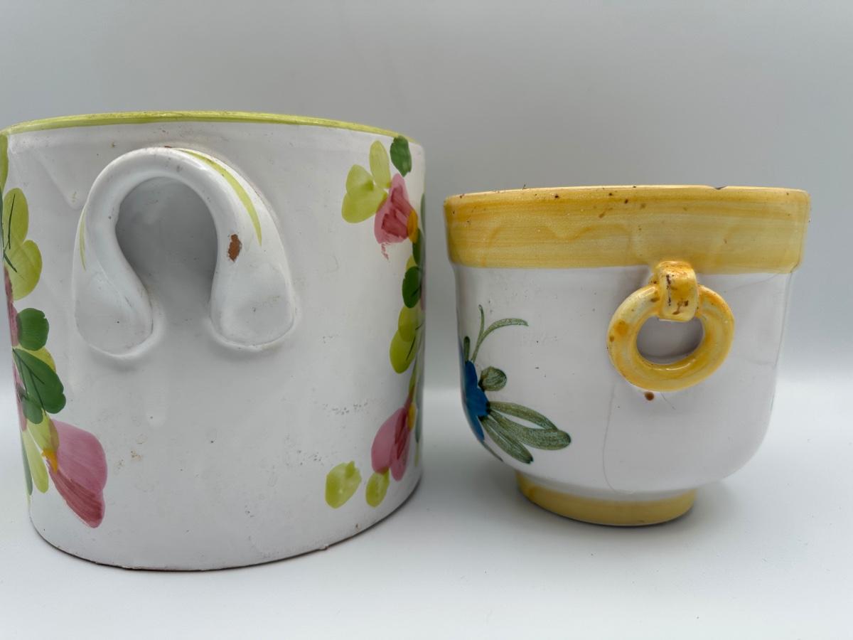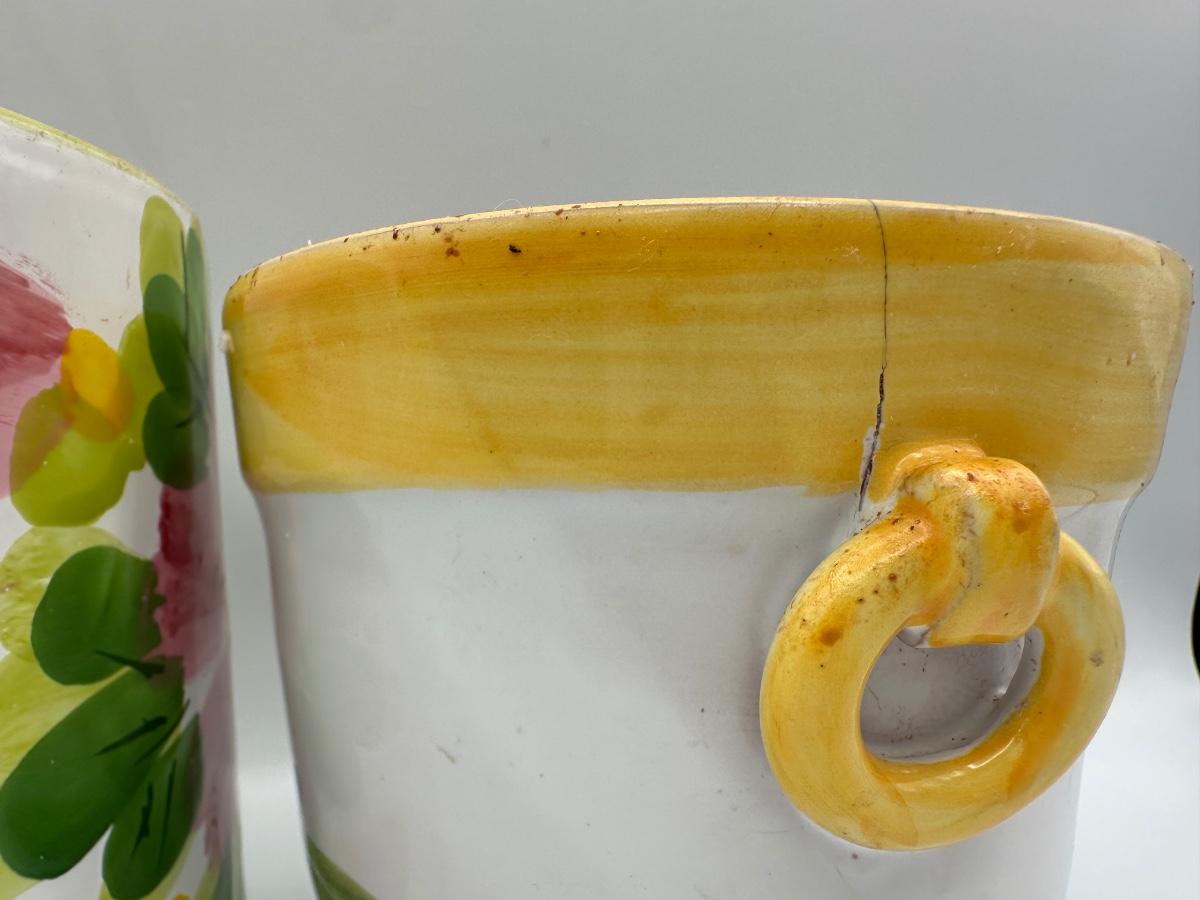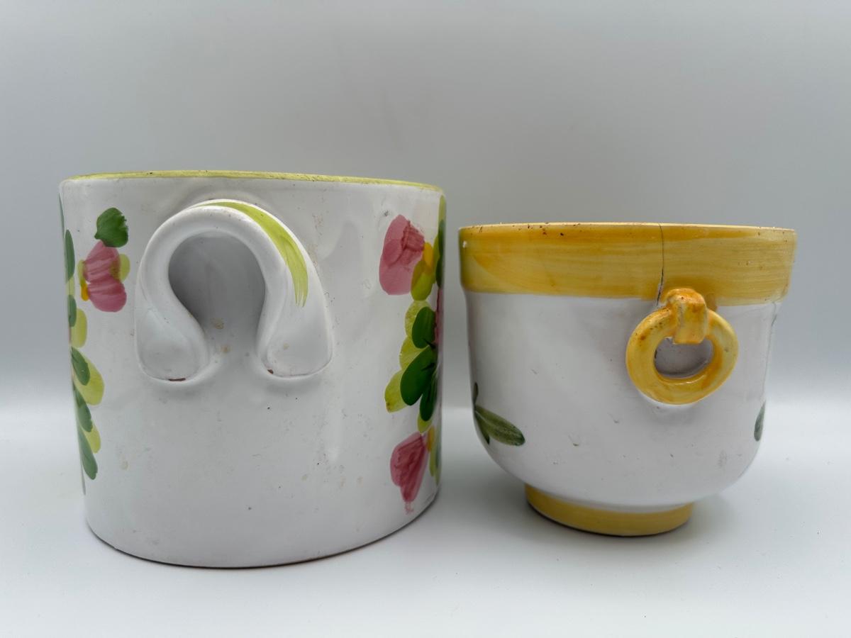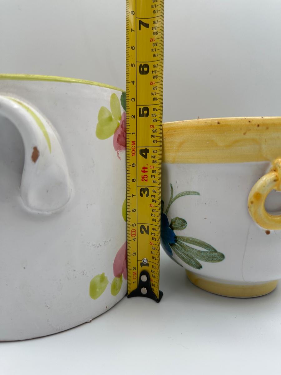 Each is marked with Italy on the bottom. The yellow pot has a hairline crack in it and a chip in it.