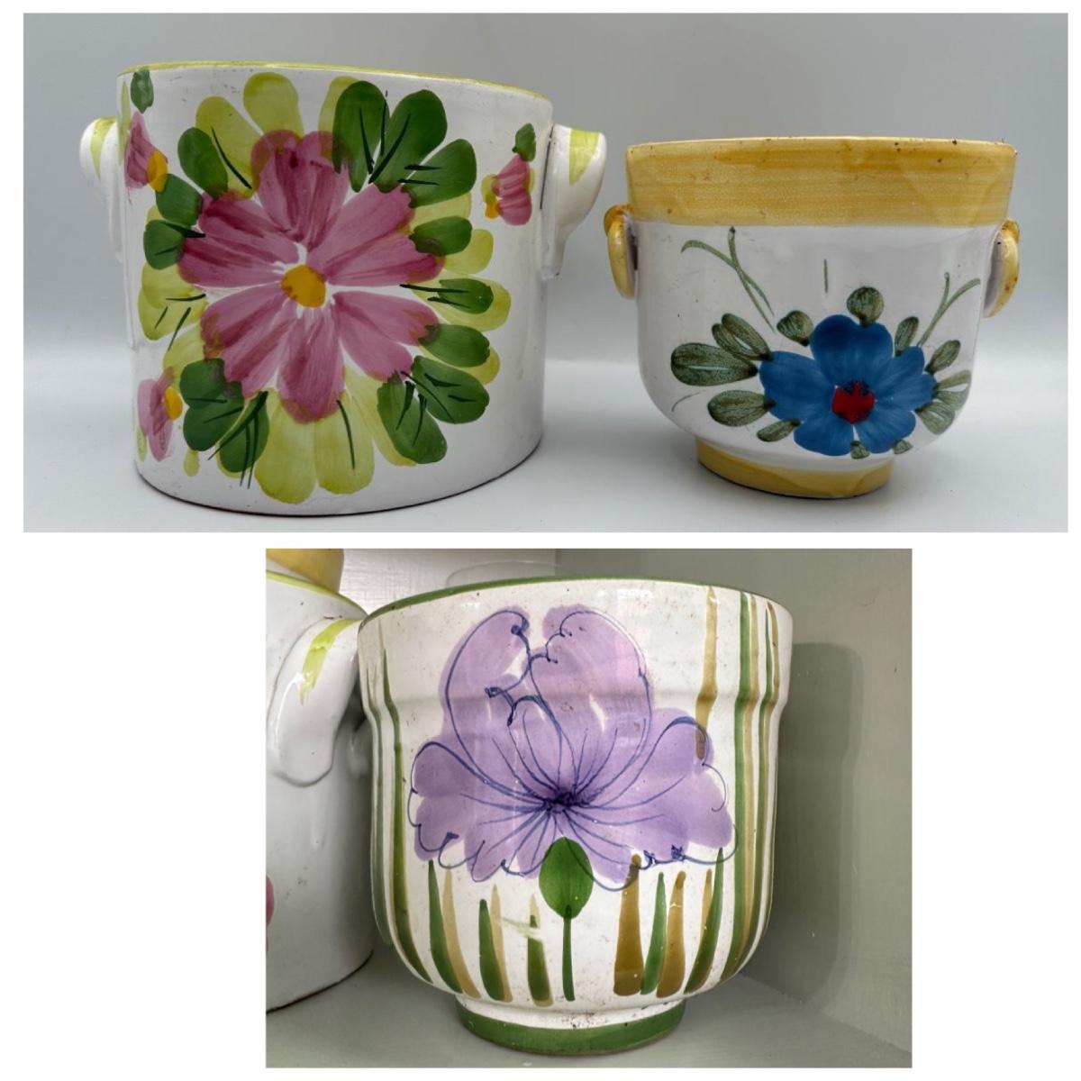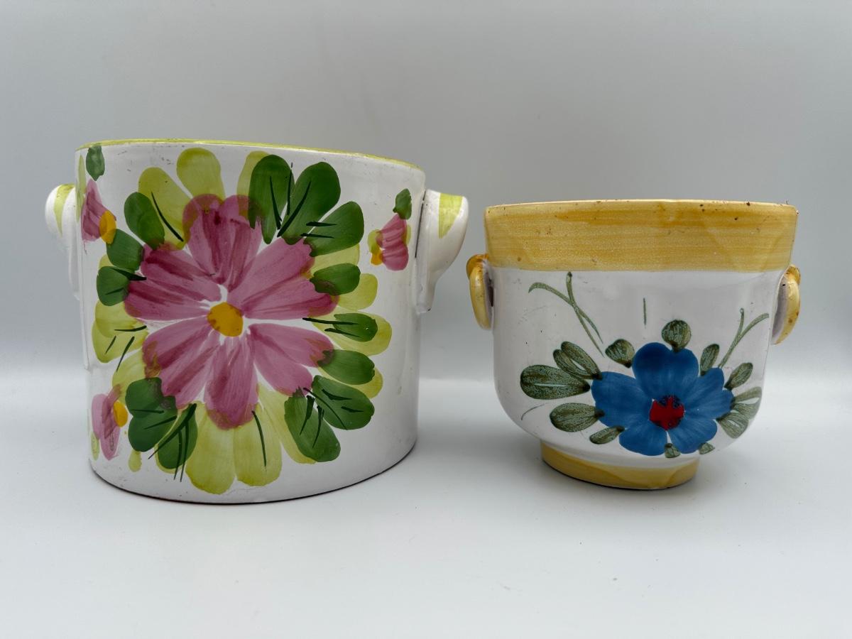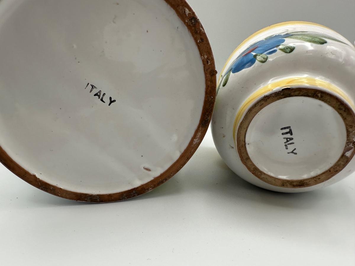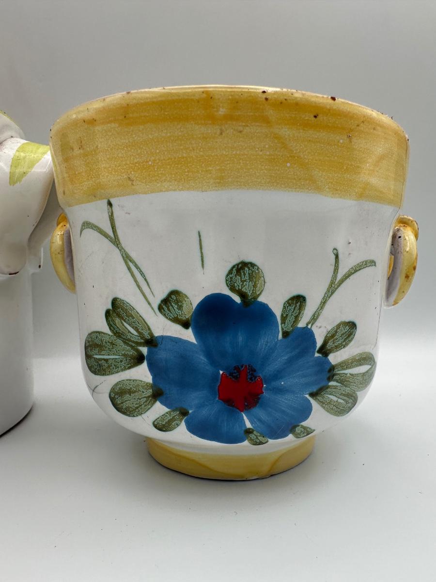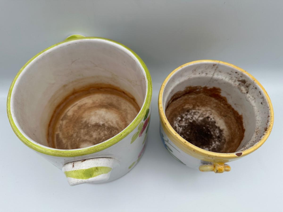 Each is marked with Italy on the bottom. The yellow pot has a hairline crack in it and a chip in it.