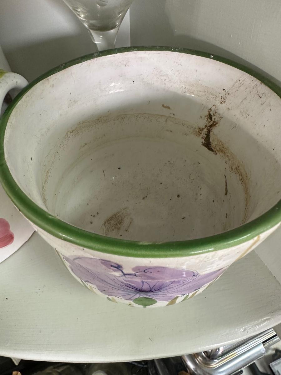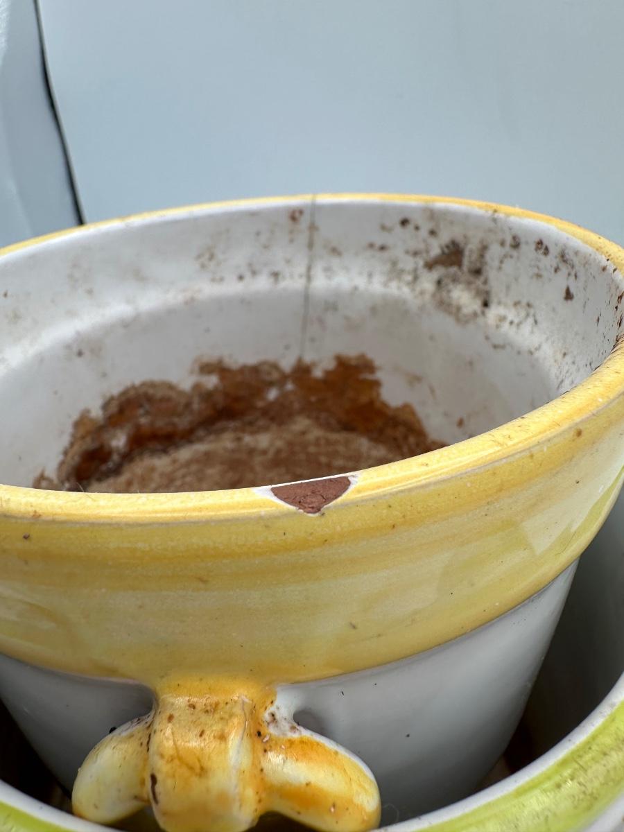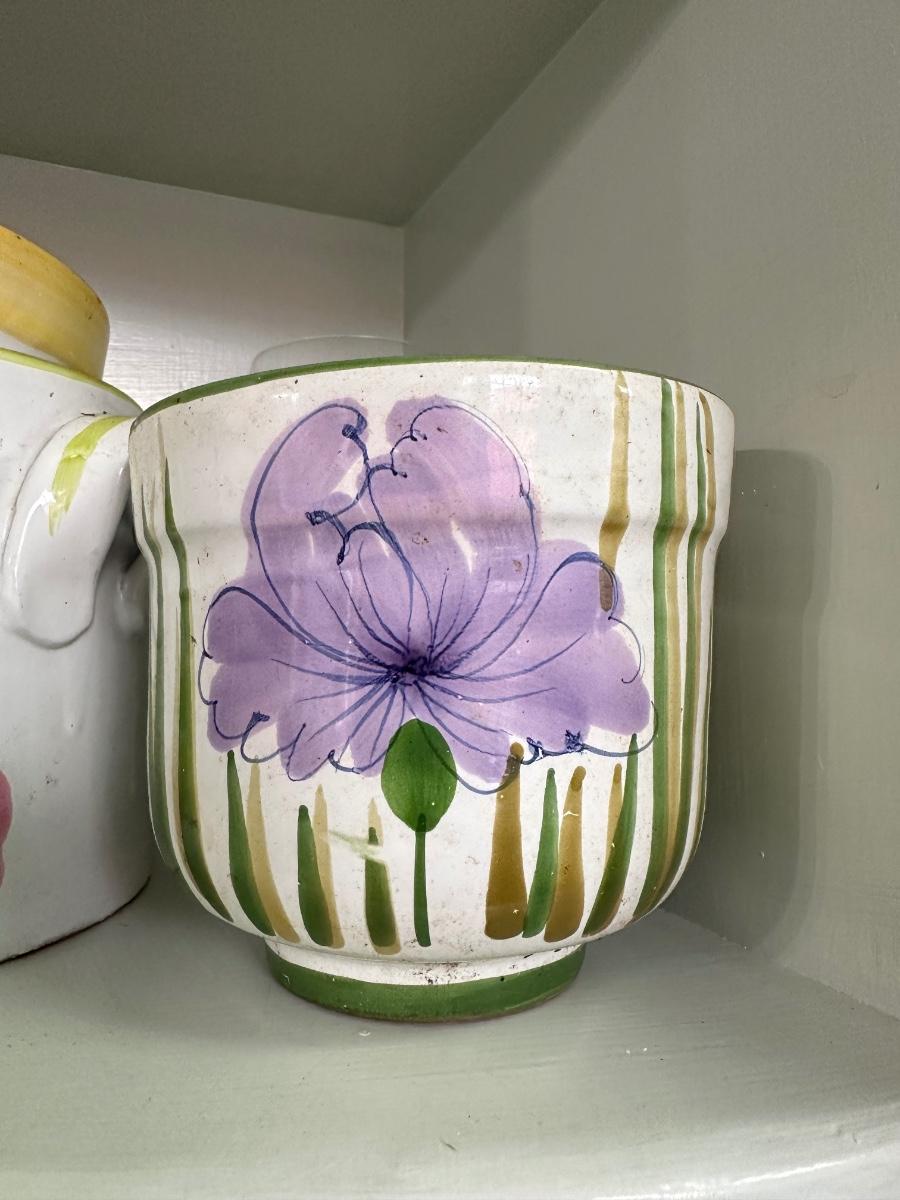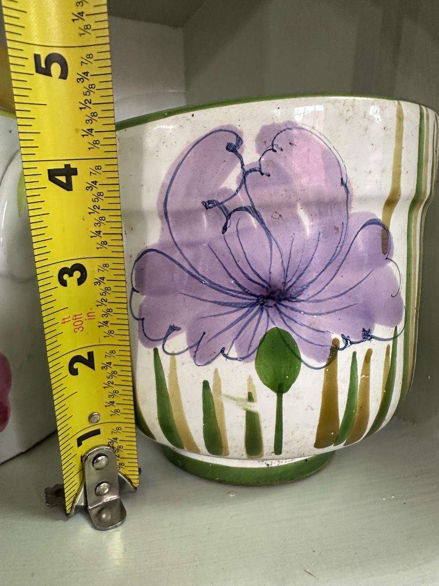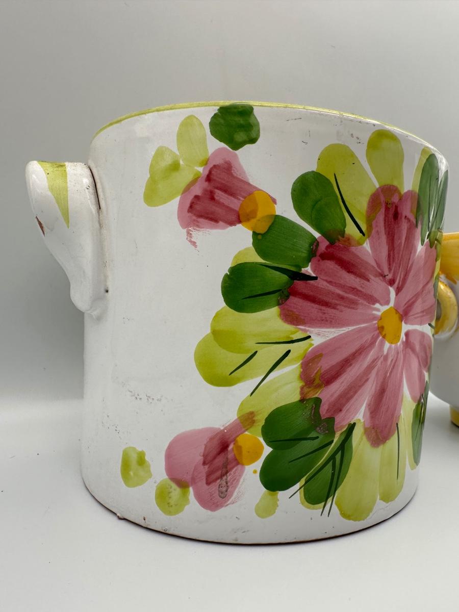 Each is marked with Italy on the bottom. The yellow pot has a hairline crack in it and a chip in it.