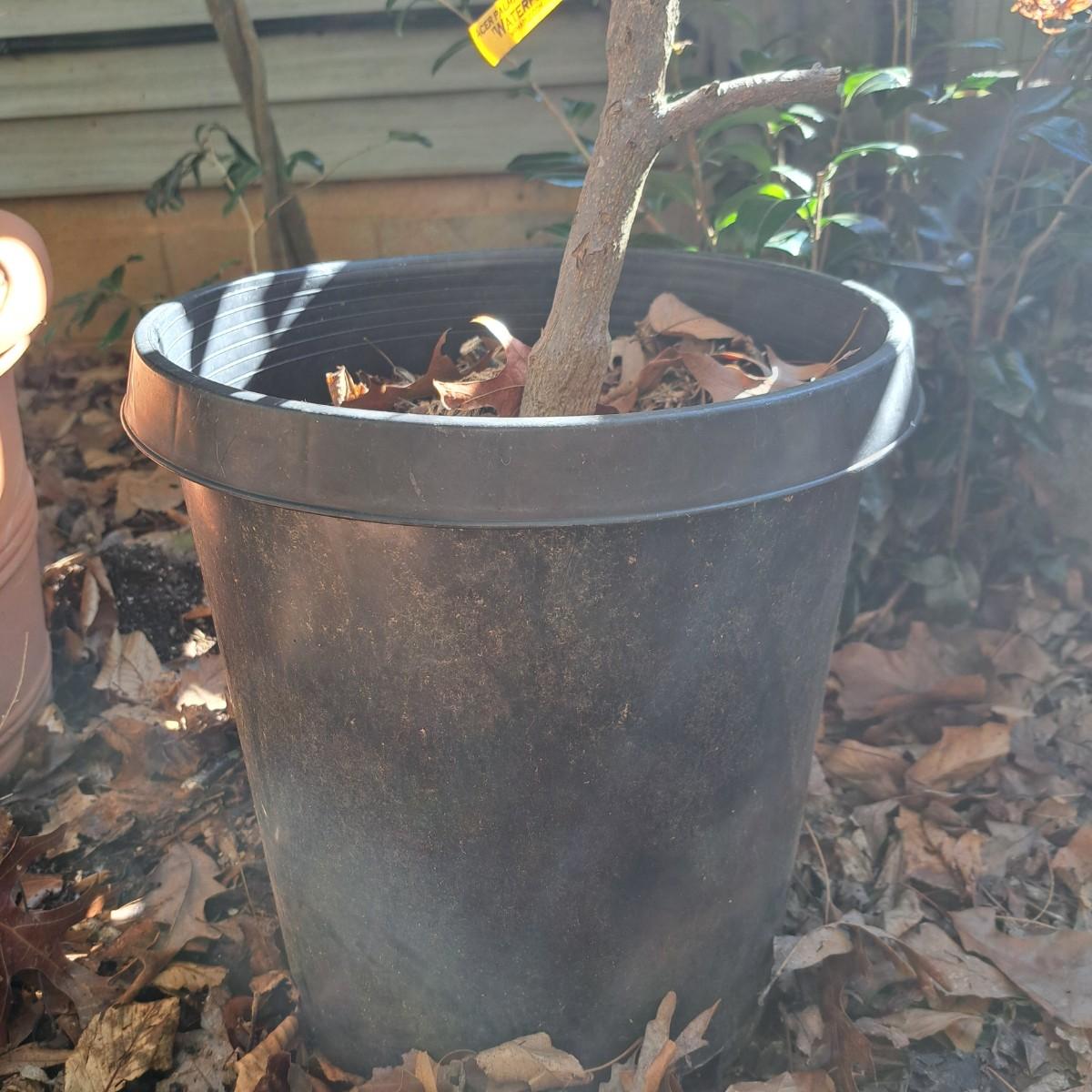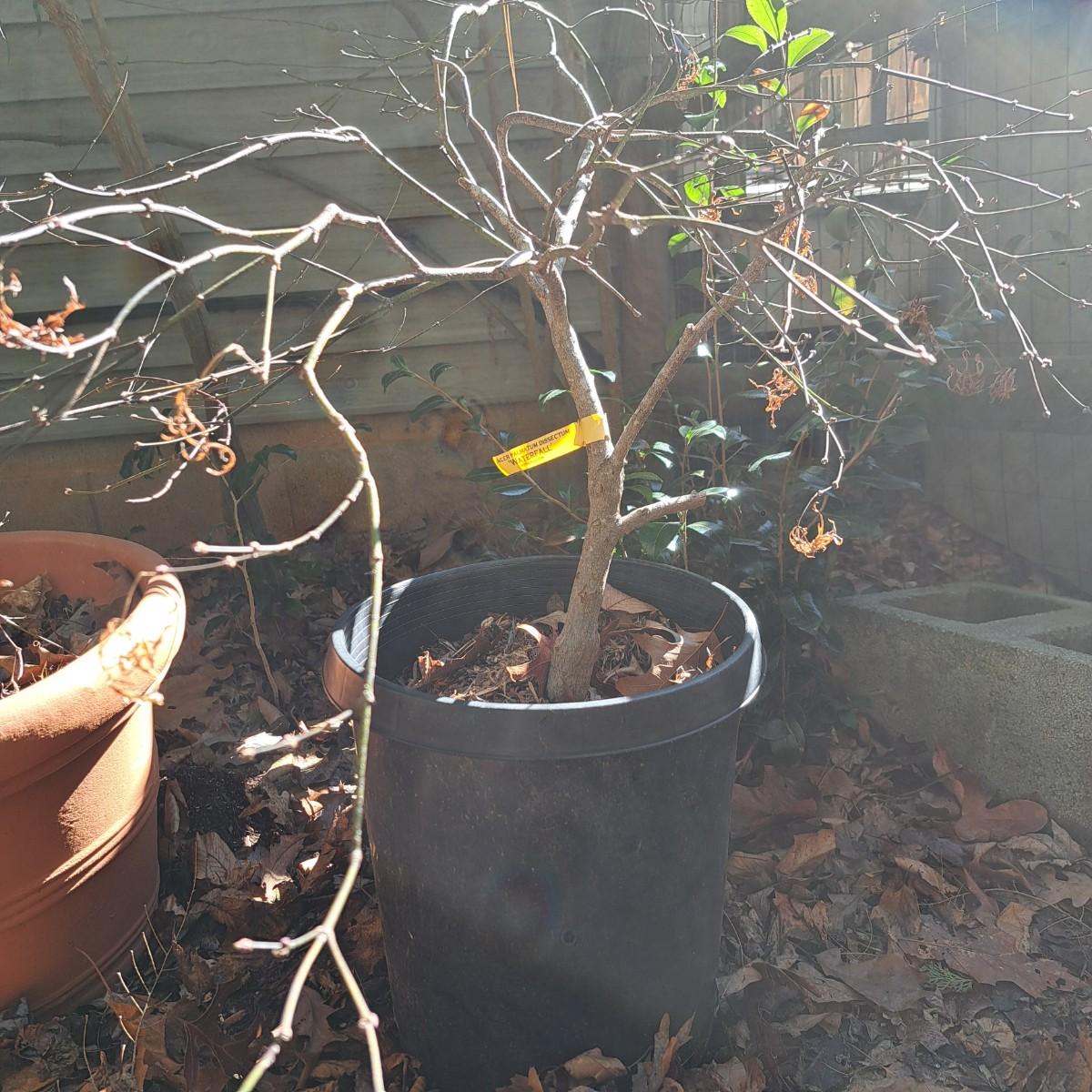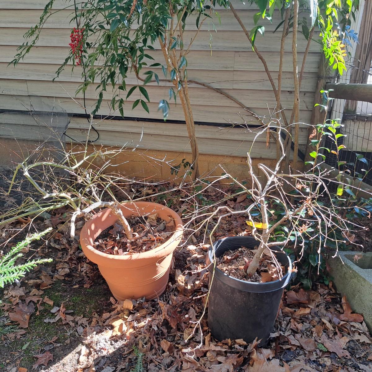 Two potted Japanese maple trees in large plastic pots, both approximately 40"H. One has a tag that reads, "
