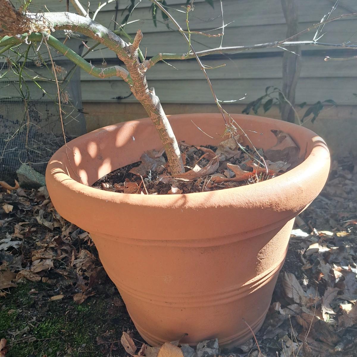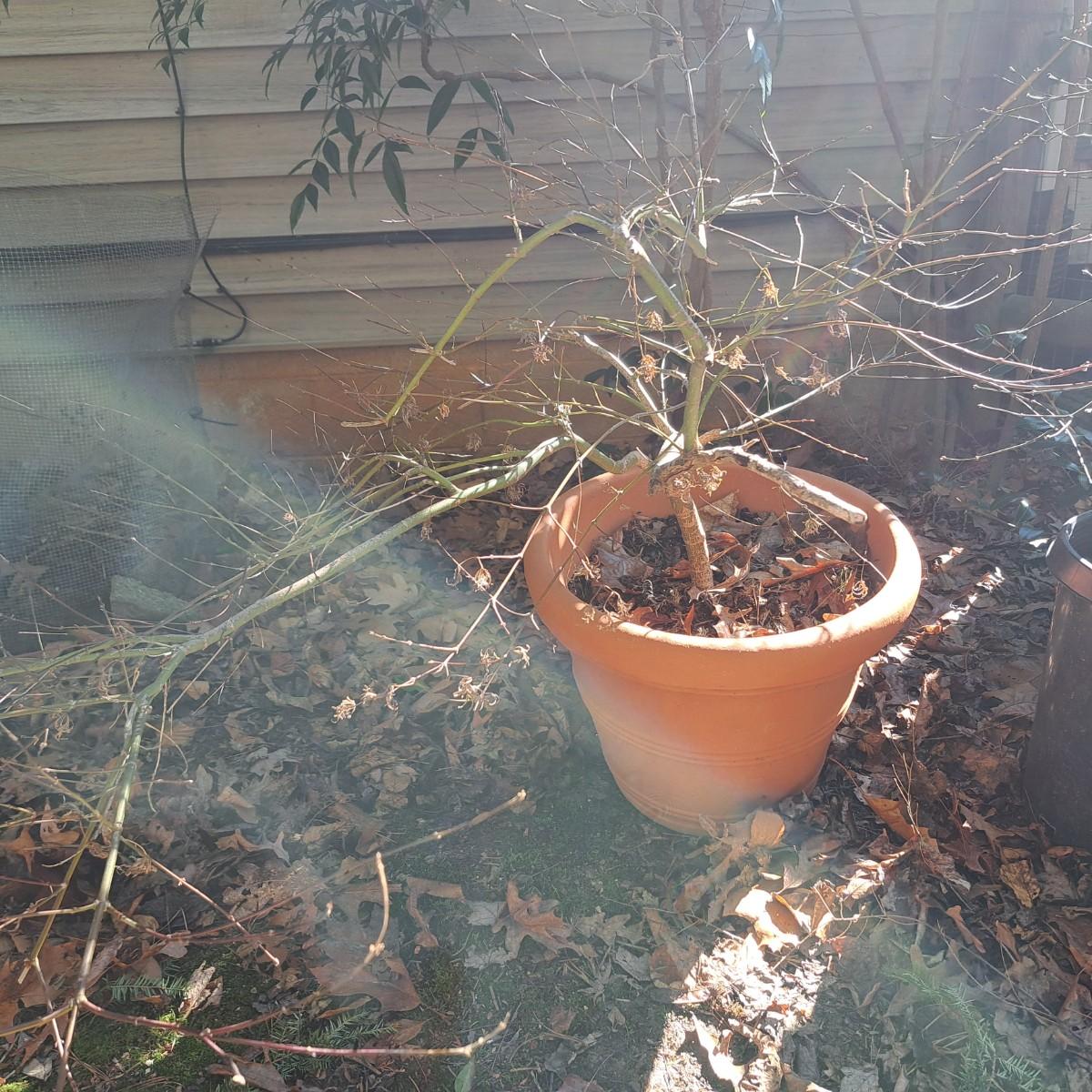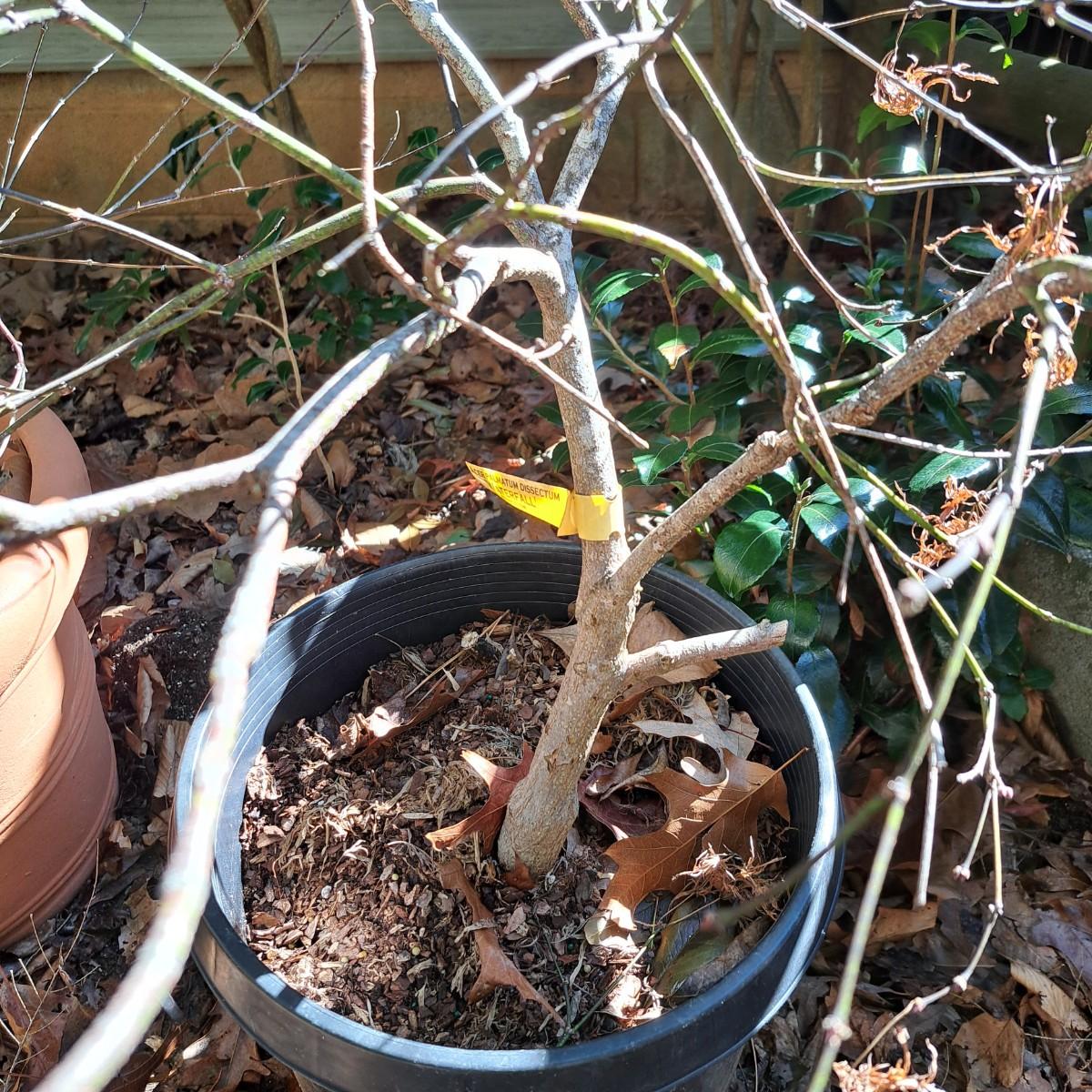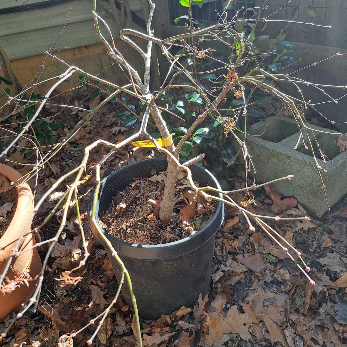 Two potted Japanese maple trees in large plastic pots, both approximately 40"H. One has a tag that reads, "