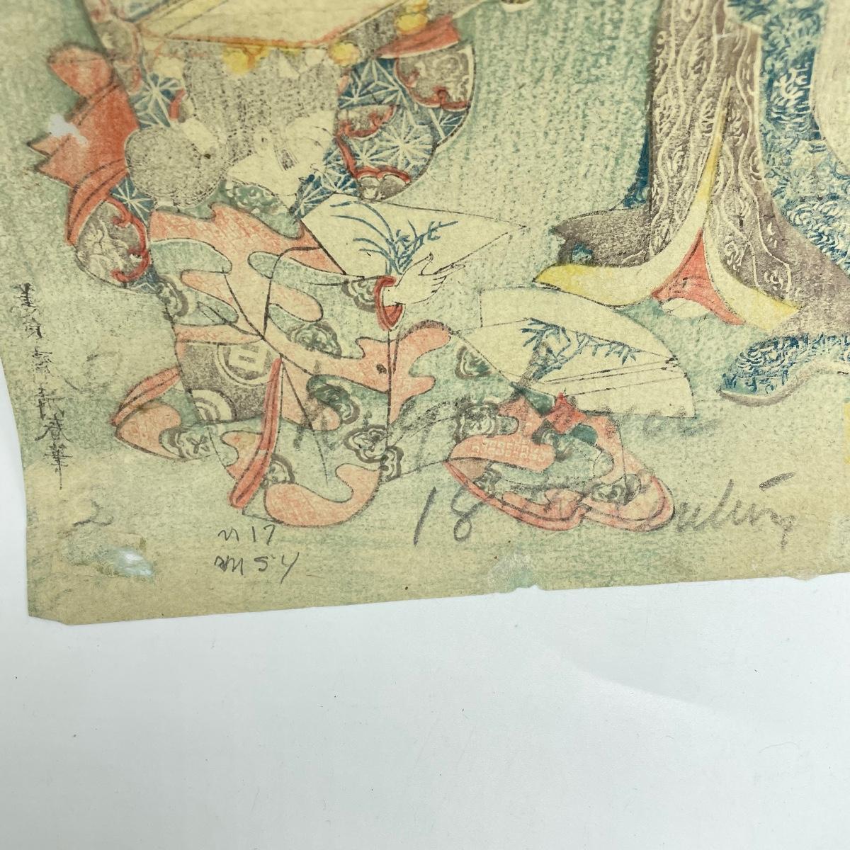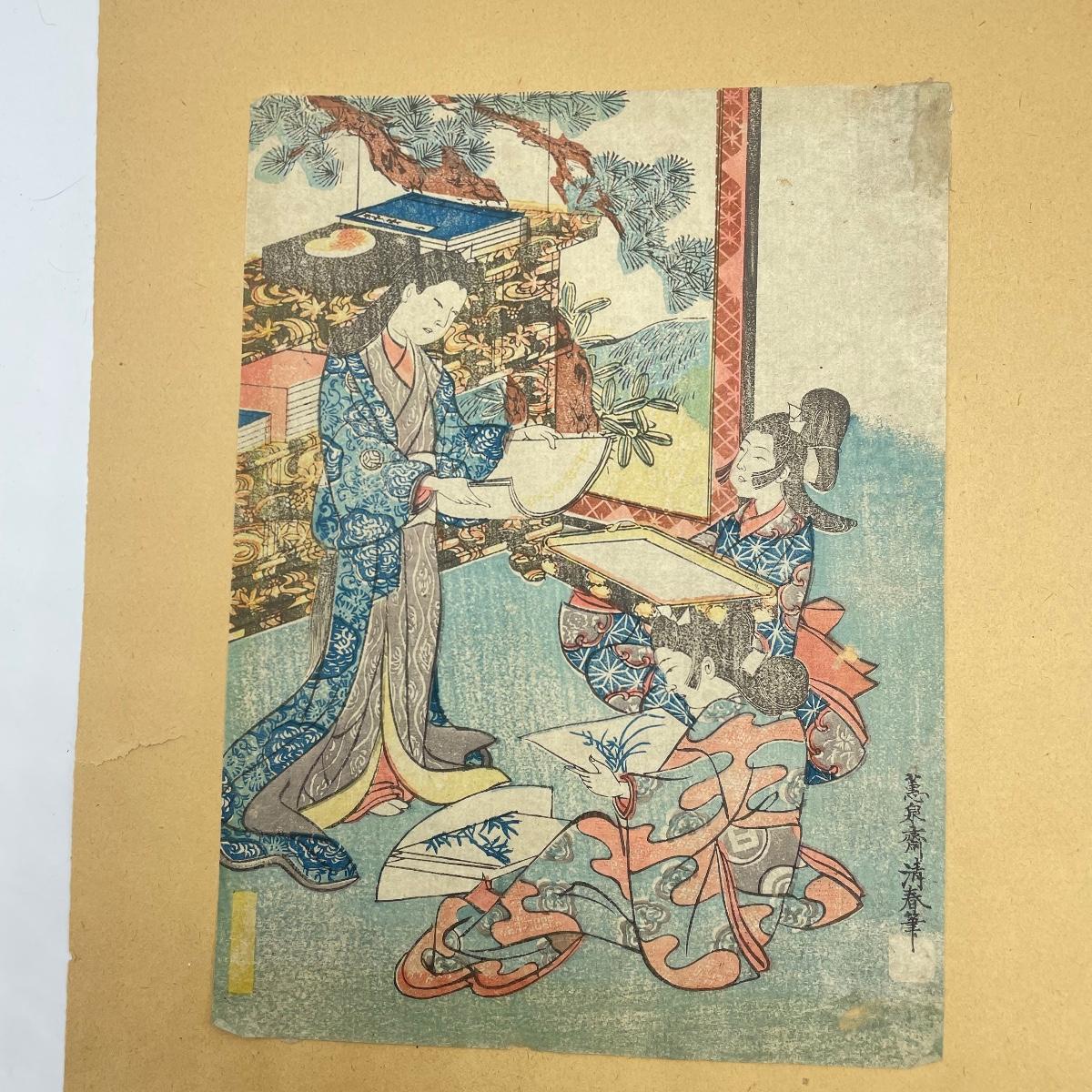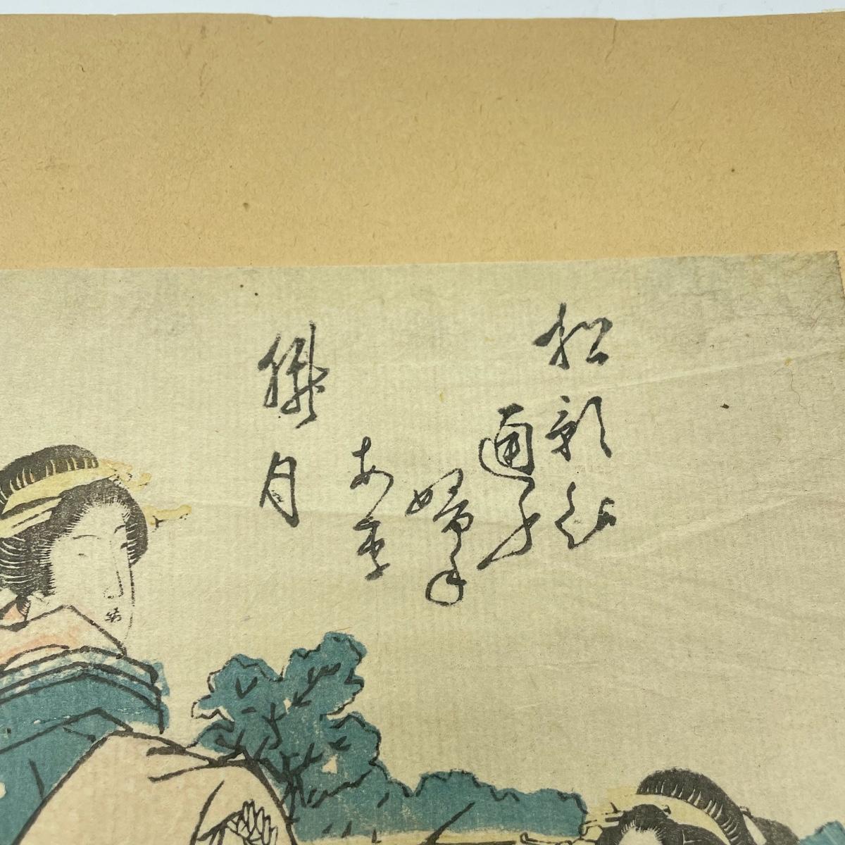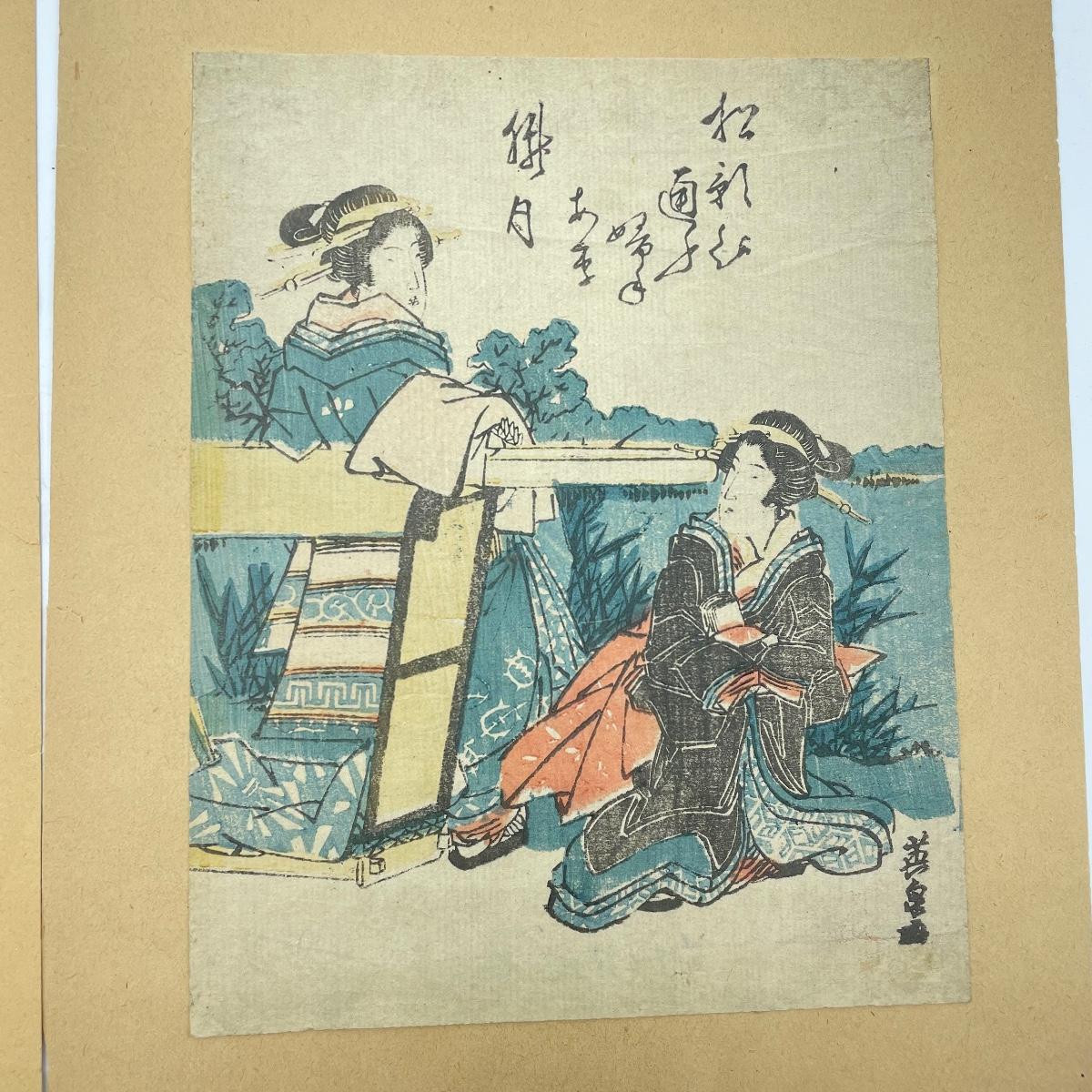Two Japanese woodblock art attached to paper backing measuring 9.5” x 12”. Art on the left with three figures measures 6” x 8.5” and the art on the right measures 6.75” x 8.5”. See images. Shipping available
