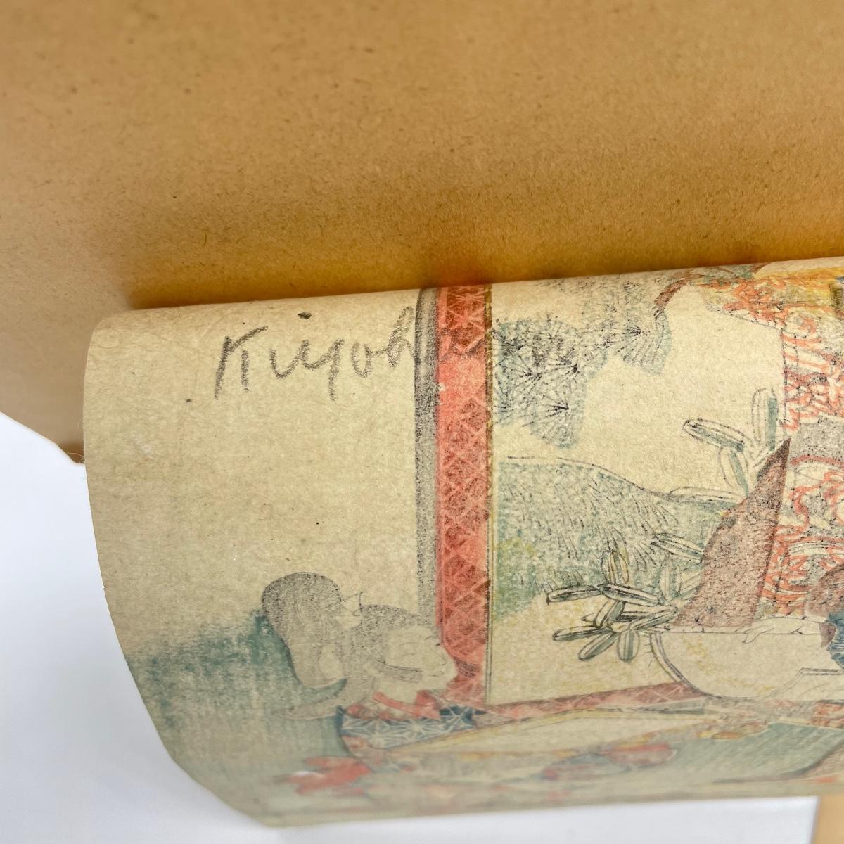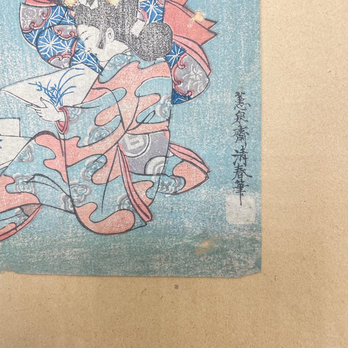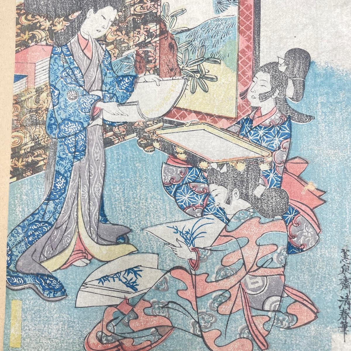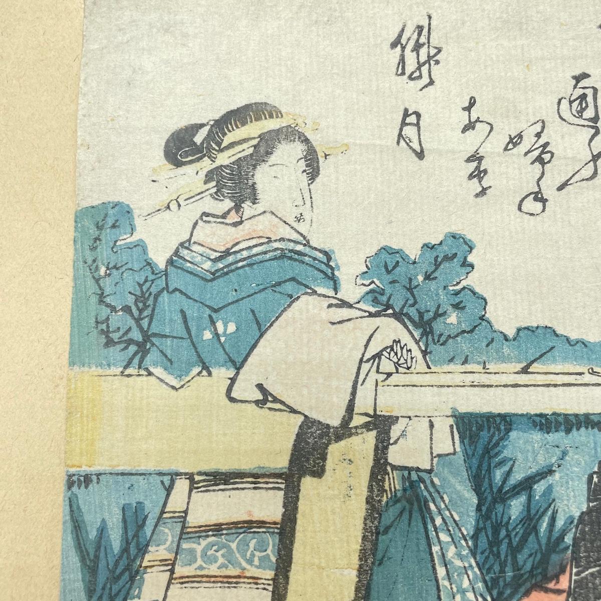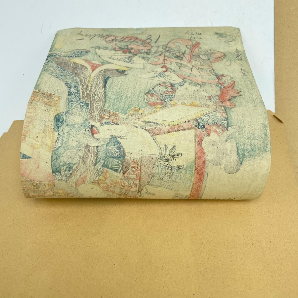 Two Japanese woodblock art attached to paper backing measuring 9.5” x 12”. Art on the left with three figures measures 6” x 8.5” and the art on the right measures 6.75” x 8.5”. See images. Shipping available