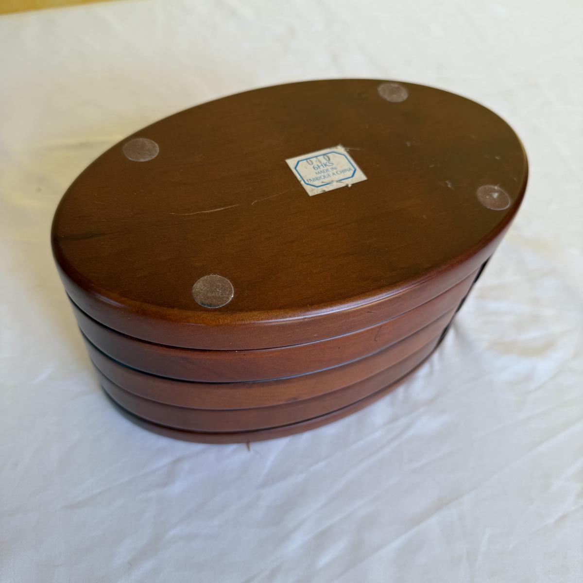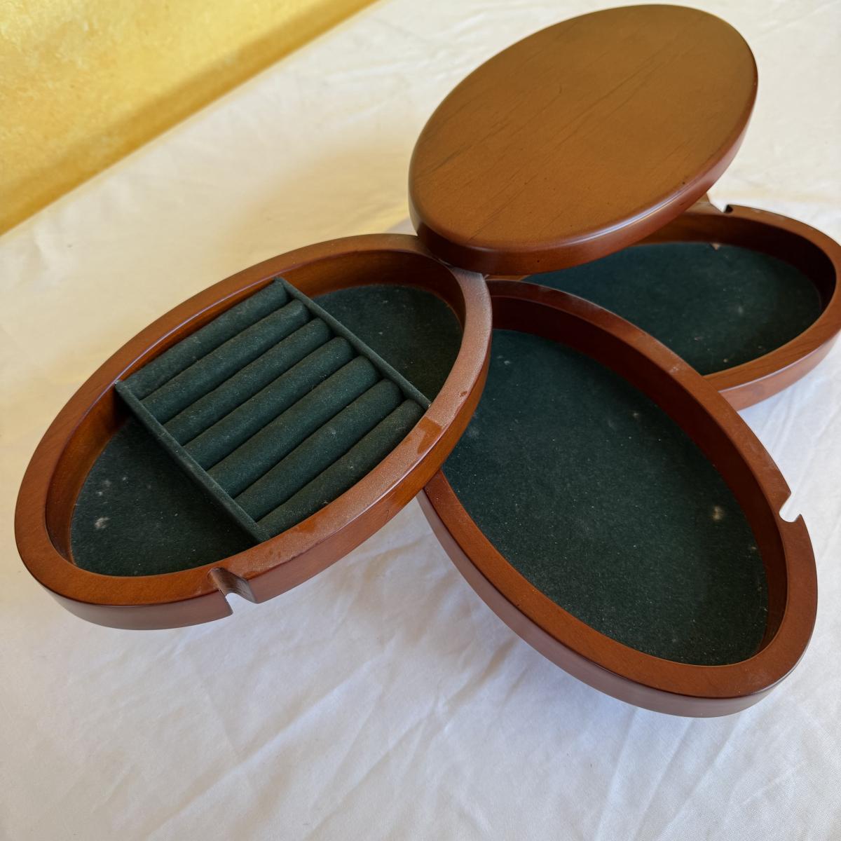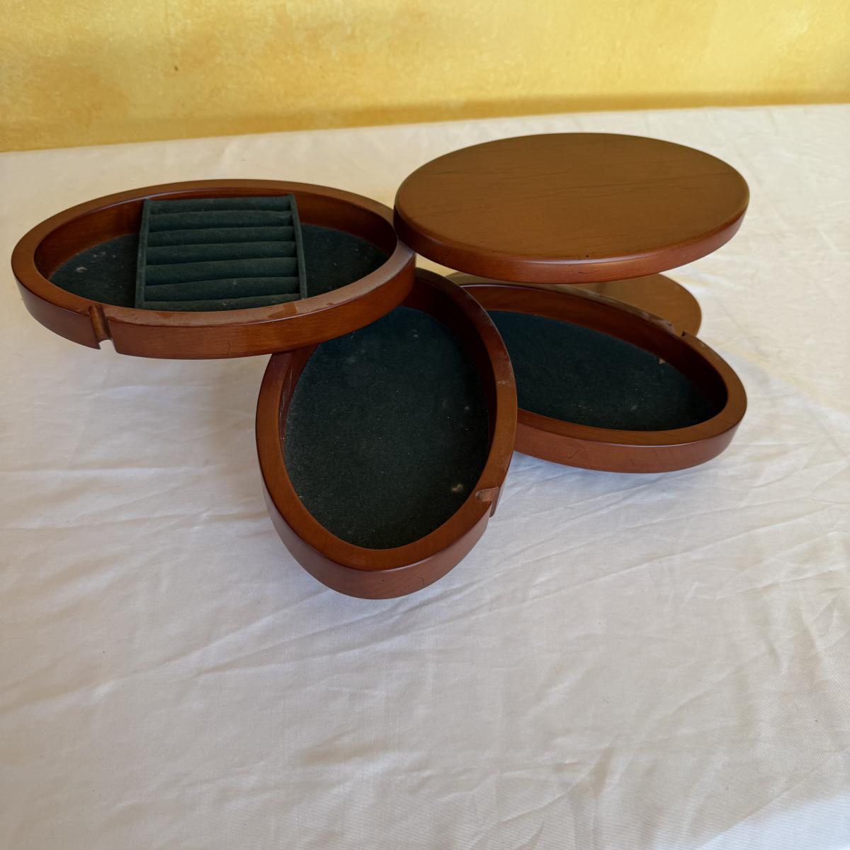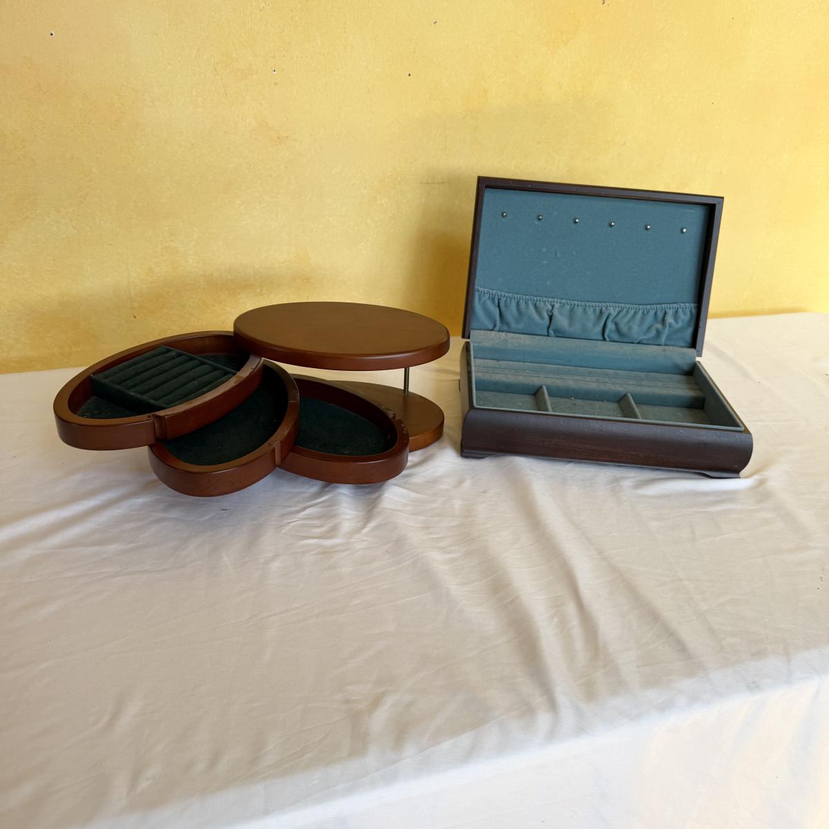 This lot contains two what appears to be wood jewelry boxes. The first is a traditional rectangle shaped jewelry box. It has a plaque on the top to be engraved. The inside is velvet lined and while it could use a good cleaning it does have little hooks on the inside of the lid with a little pocket. there are also little dividers for rings as well as little sections to organize your treasures. This one measures 12” x 8” x 3.25”H. The next is a very fun oval shape and has a unique design as all the shelves swivel out. The three different shelves are also lined with velvet. The top shelf has a section for your rings. This one measures 9” x 5.5” x 5”H. Shipping available.