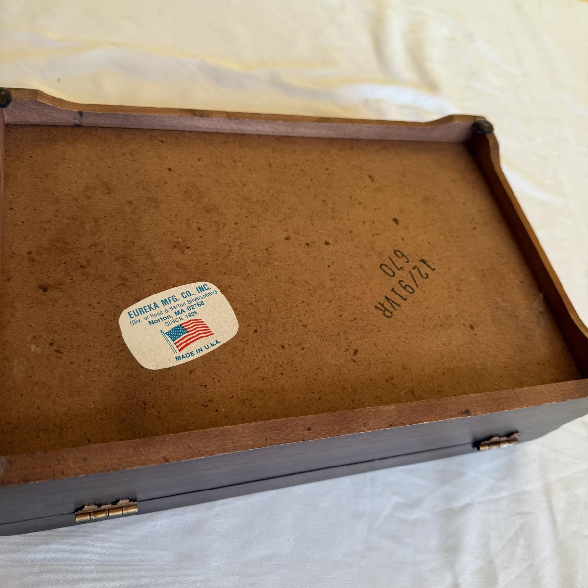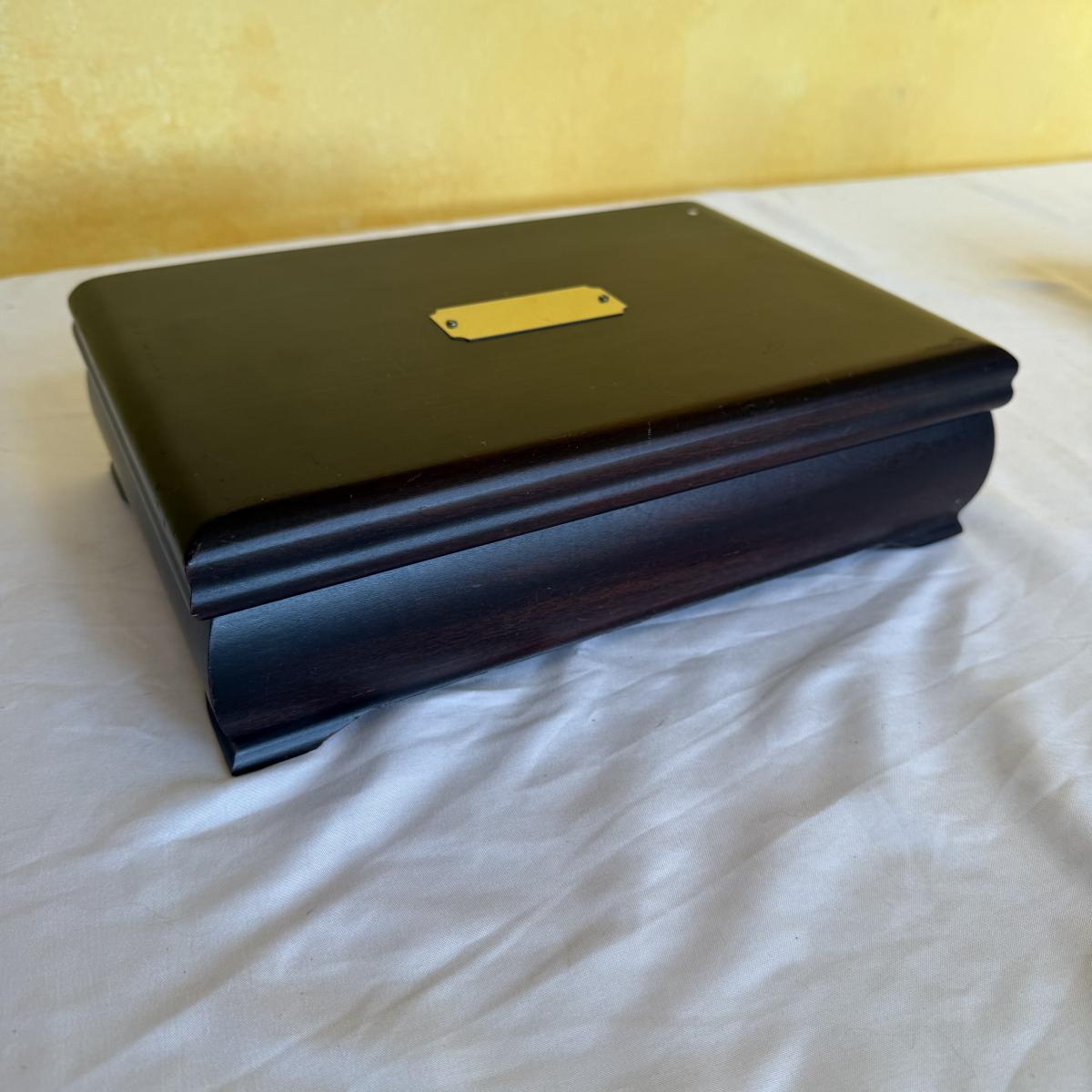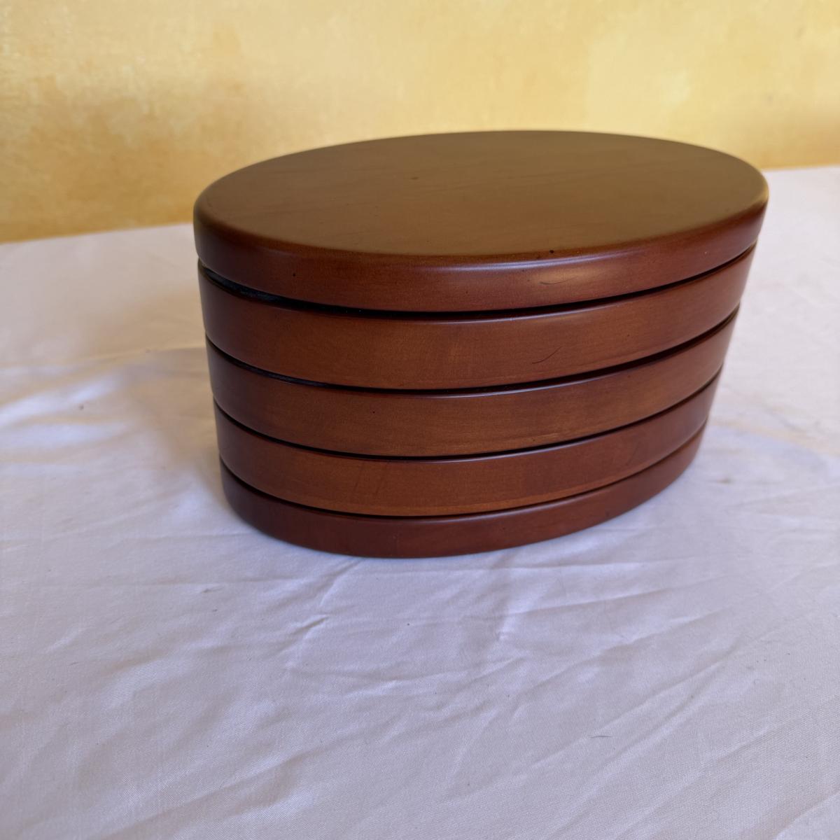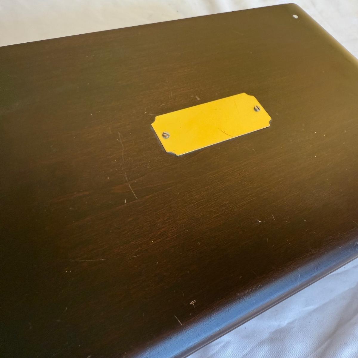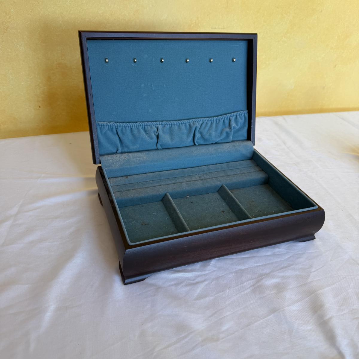 This lot contains two what appears to be wood jewelry boxes. The first is a traditional rectangle shaped jewelry box. It has a plaque on the top to be engraved. The inside is velvet lined and while it could use a good cleaning it does have little hooks on the inside of the lid with a little pocket. there are also little dividers for rings as well as little sections to organize your treasures. This one measures 12” x 8” x 3.25”H. The next is a very fun oval shape and has a unique design as all the shelves swivel out. The three different shelves are also lined with velvet. The top shelf has a section for your rings. This one measures 9” x 5.5” x 5”H. Shipping available.