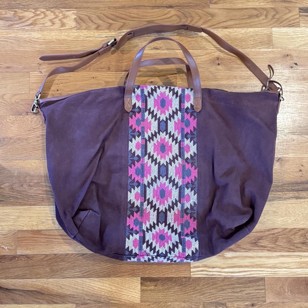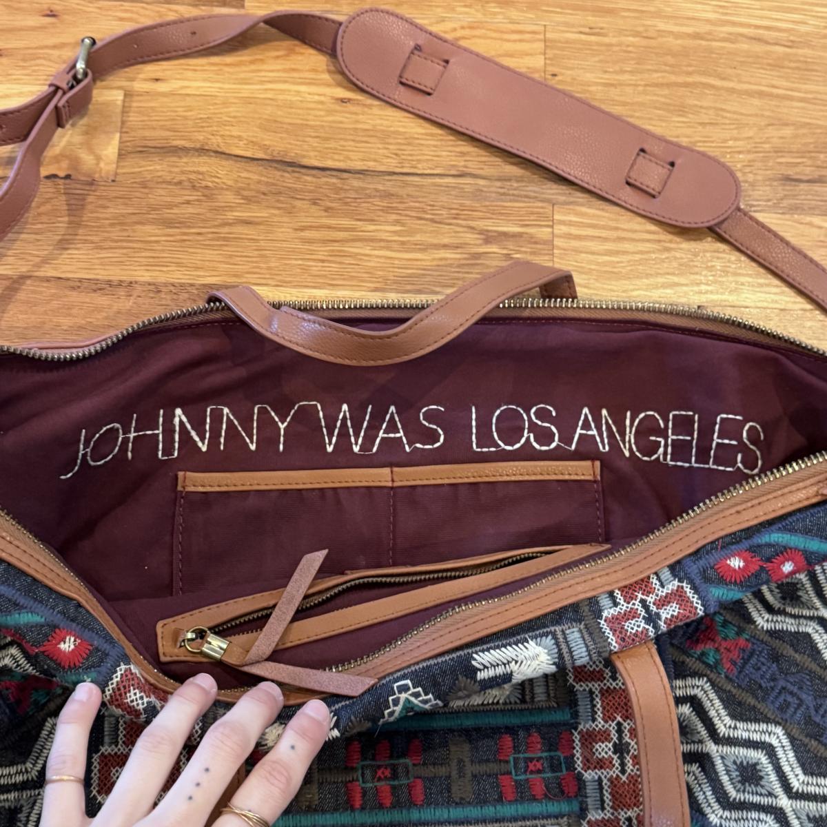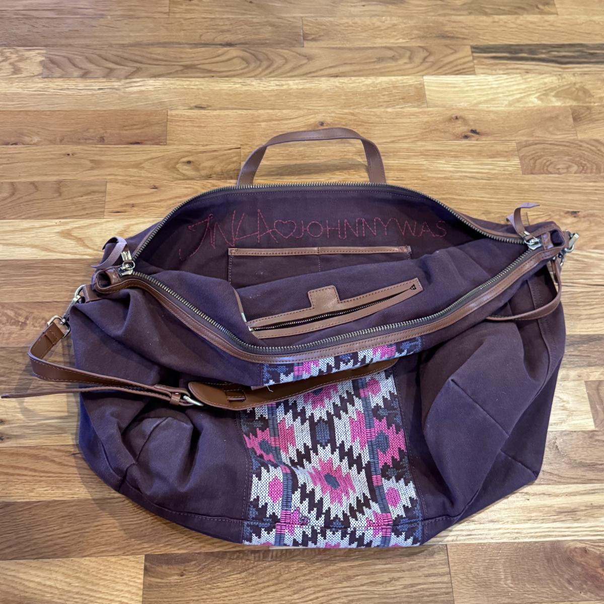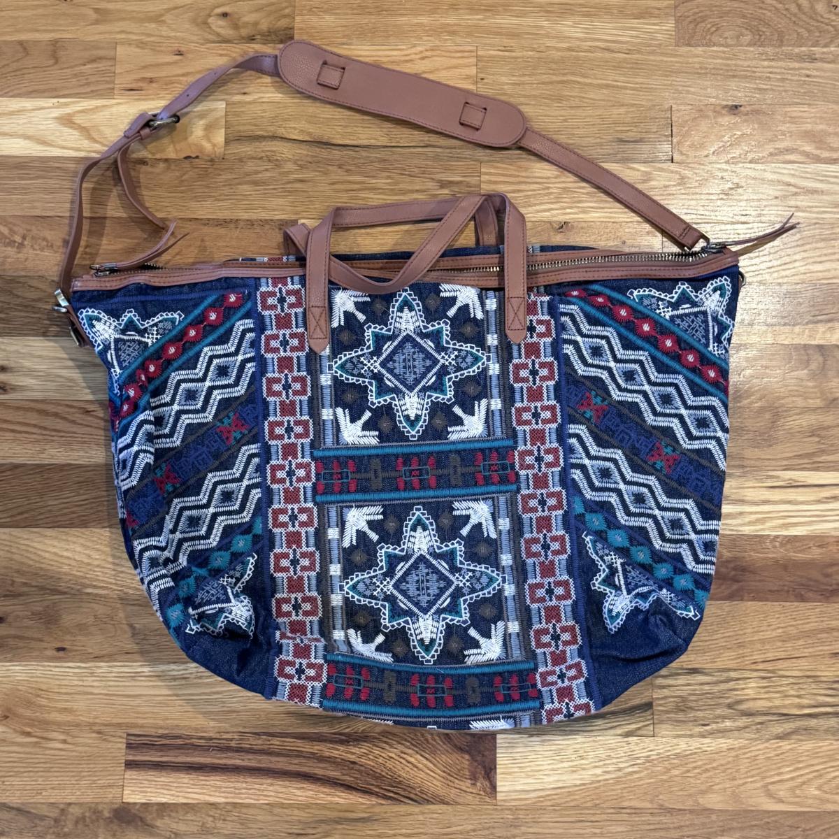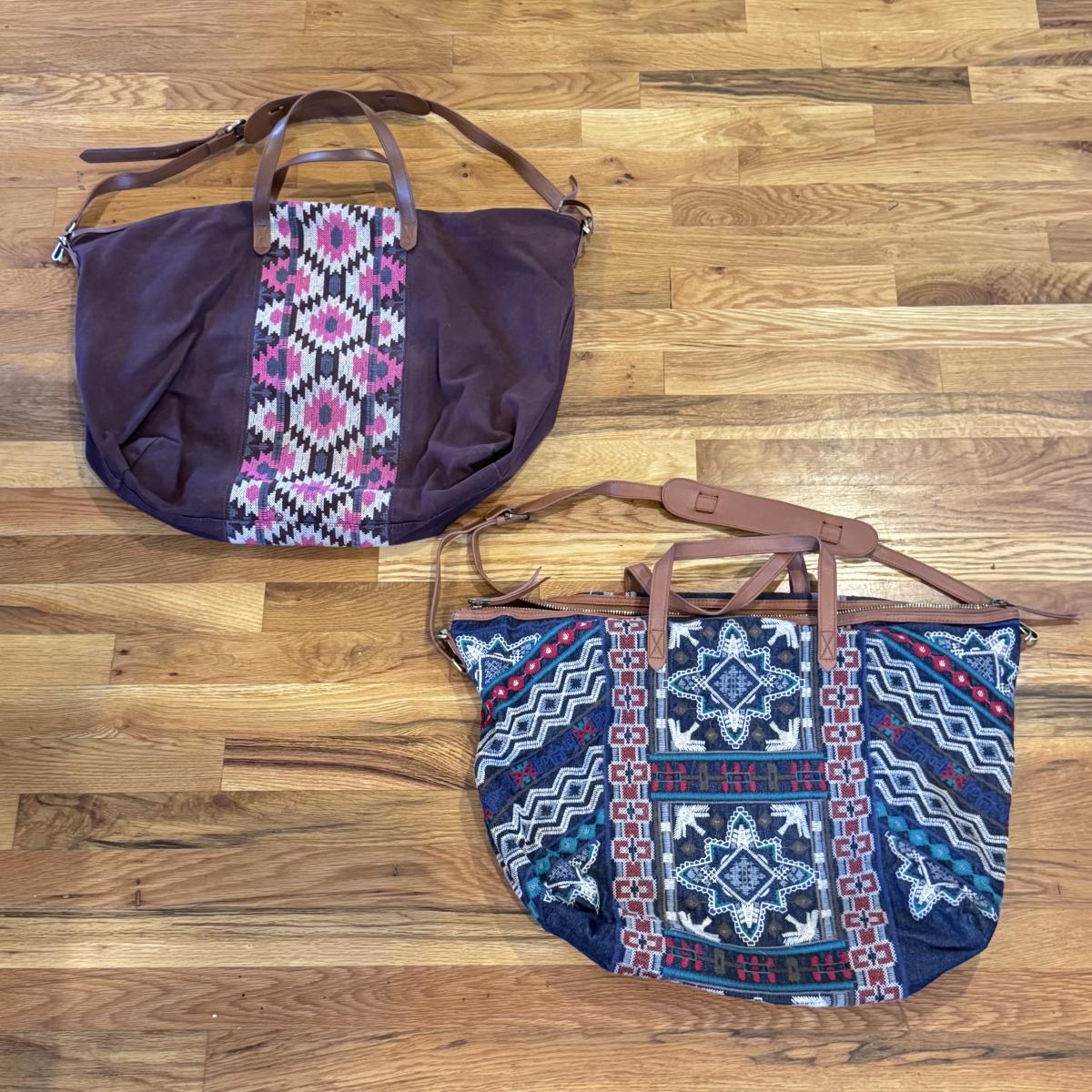 This lot includes two lovely Johnny Was weekend totes in a bohemian style. Both bags are made of cotton with embroidery and leather features. The burgundy/brown colored bag has a paint stain, smaller than a dime, on the back of it. Both bags individually measure 23” x 7” x 24”H with the strap included - 17” without the strap. Shipping available.