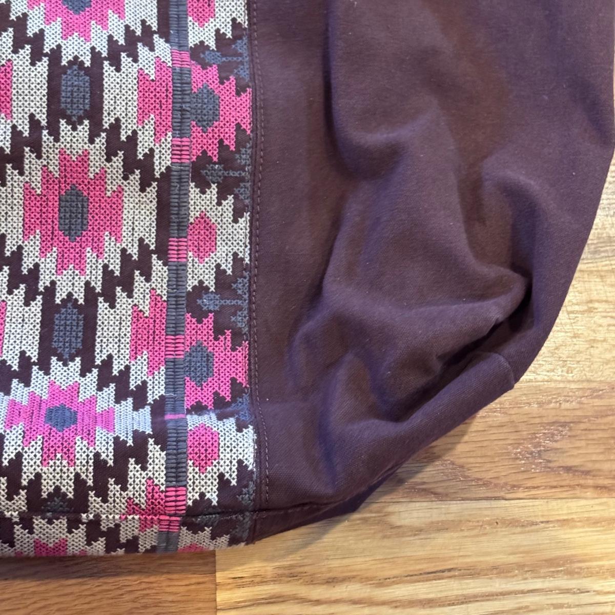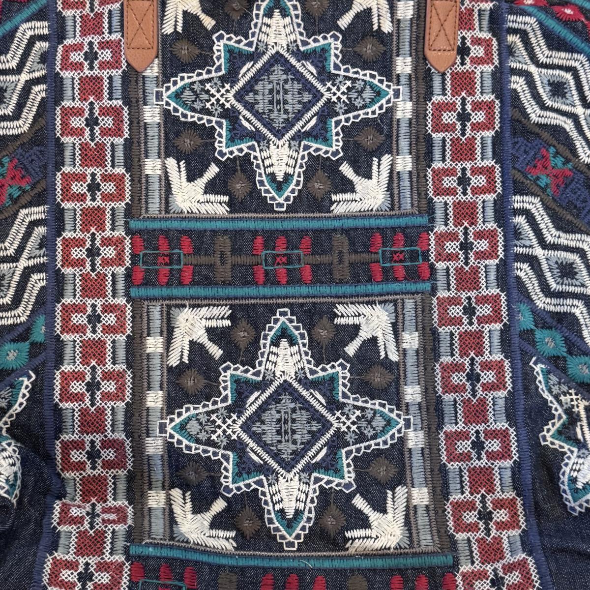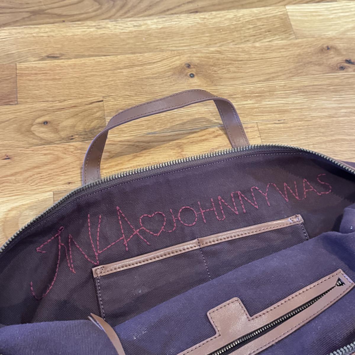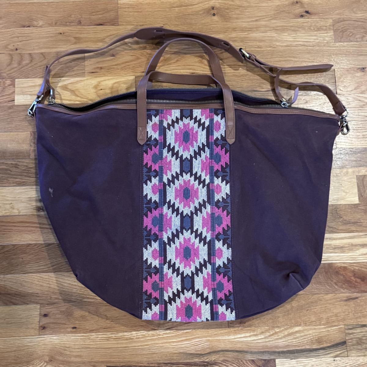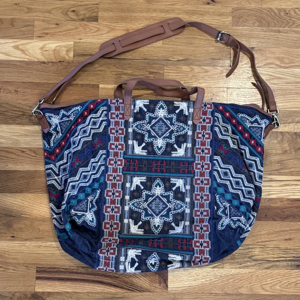This lot includes two lovely Johnny Was weekend totes in a bohemian style. Both bags are made of cotton with embroidery and leather features. The burgundy/brown colored bag has a paint stain, smaller than a dime, on the back of it. Both bags individually measure 23” x 7” x 24”H with the strap included - 17” without the strap. Shipping available.