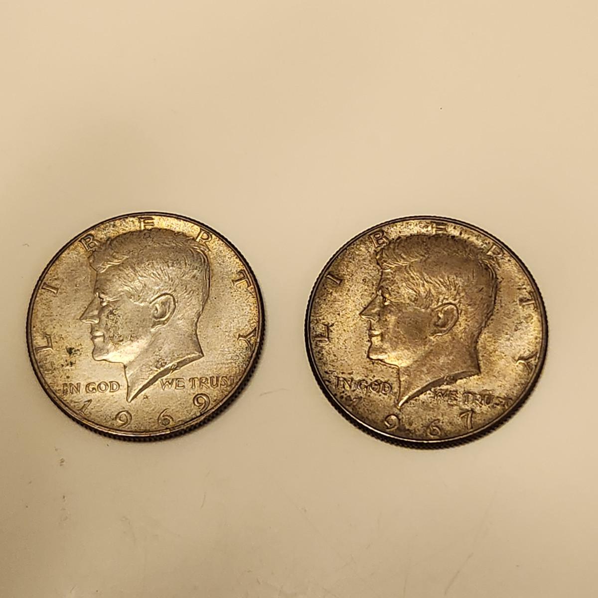 This lot is for Two Kennedy Half Dollars. One is a 1969-D and the other is a 1967 half dollar. This item is KY sales tax-exempt.