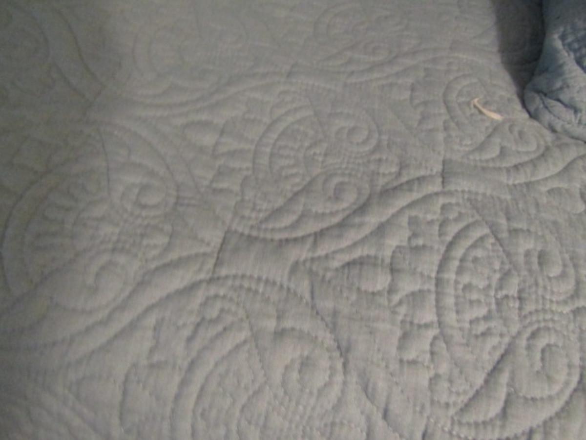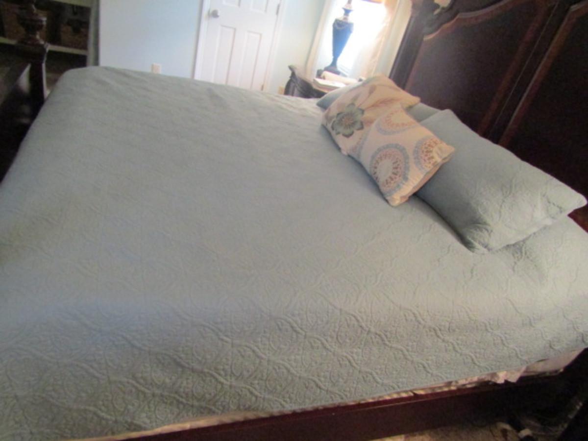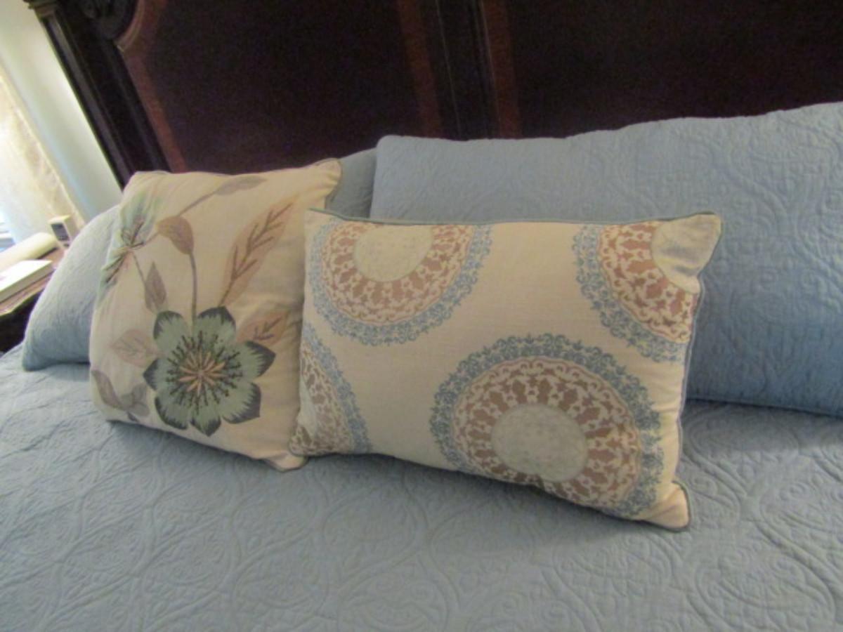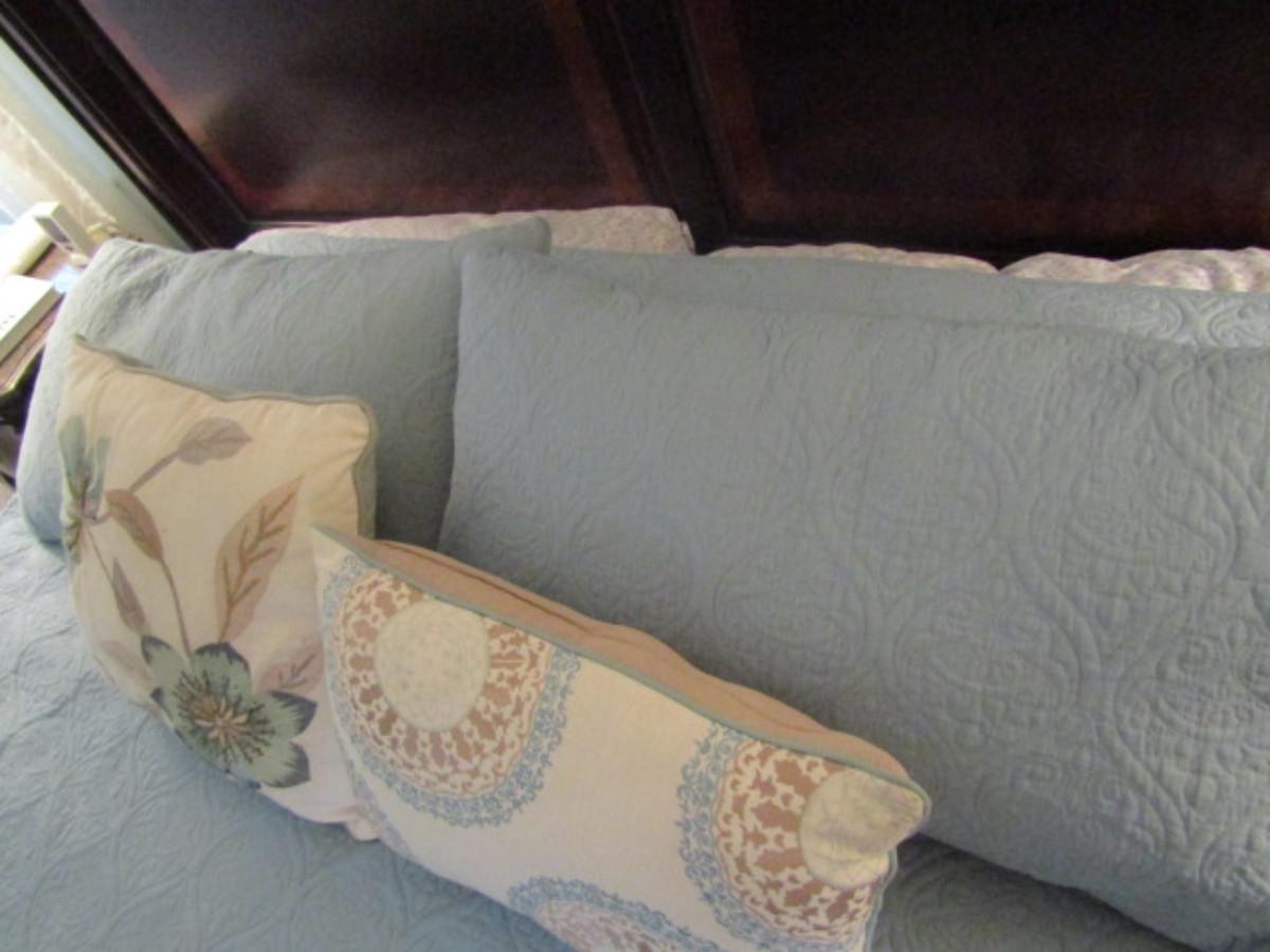 Two King Size Coverlets with Pillow Shams and Decorative Pillows. One is light blue (almost robin's egg colored) and does not have a tag to identify maker. The cream colored one is Martha Stewart.