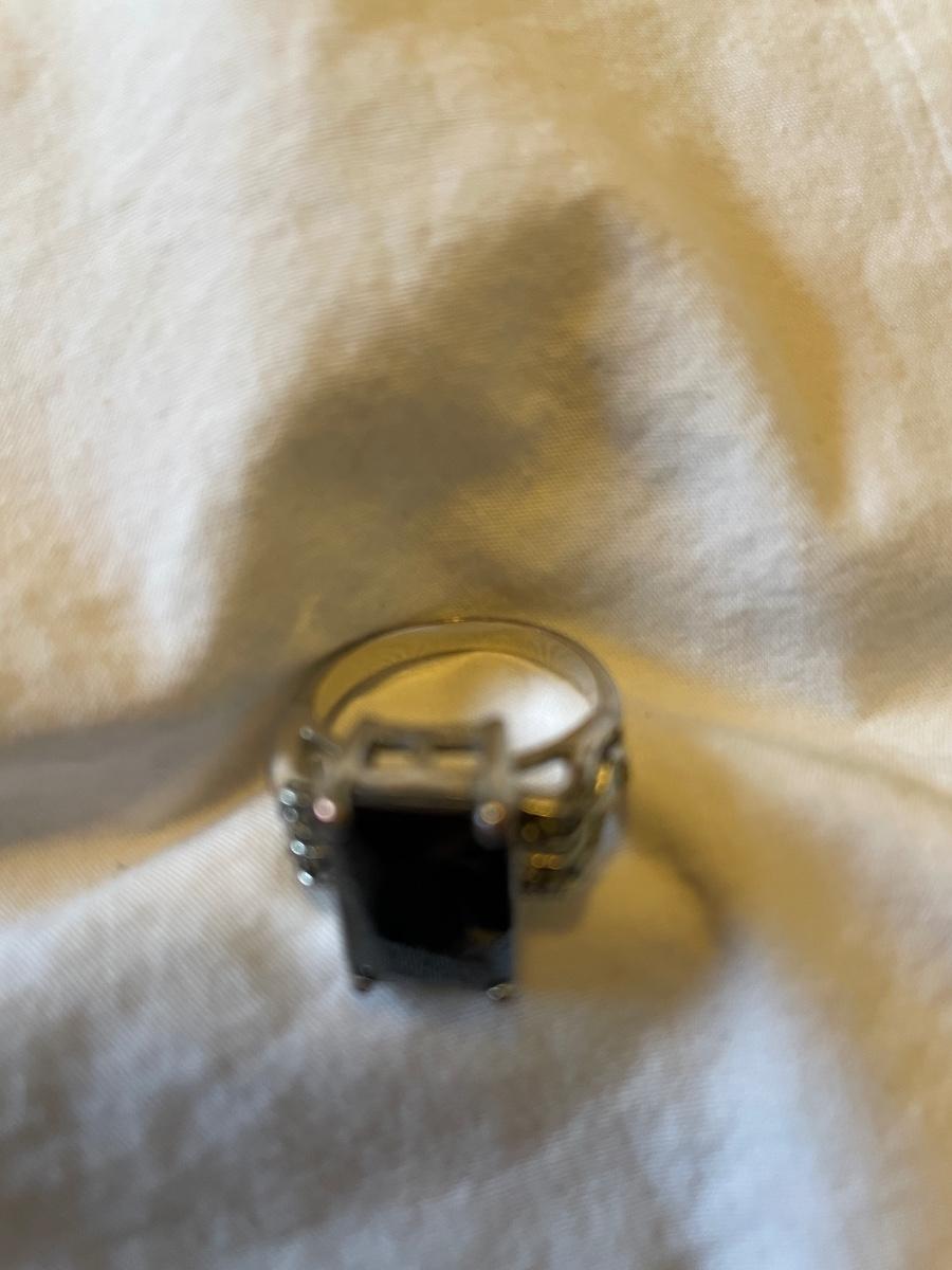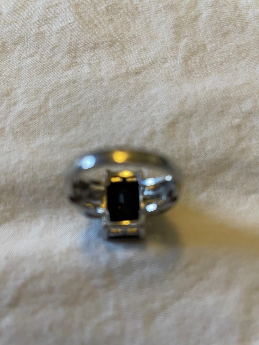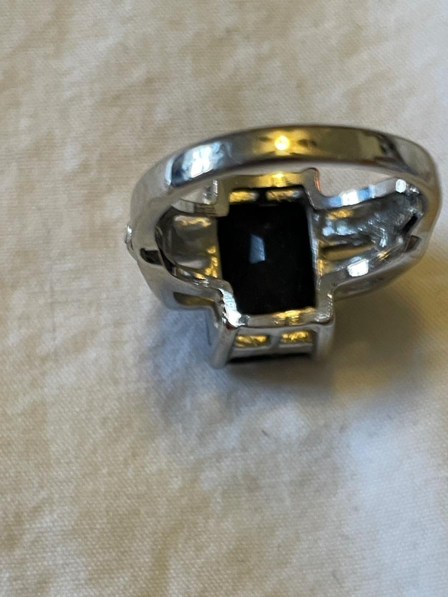 TWO LADIES RINGS. ONE LADIES STERLING SILVER RING ONE BLACK STONE SILVER TONE RING
