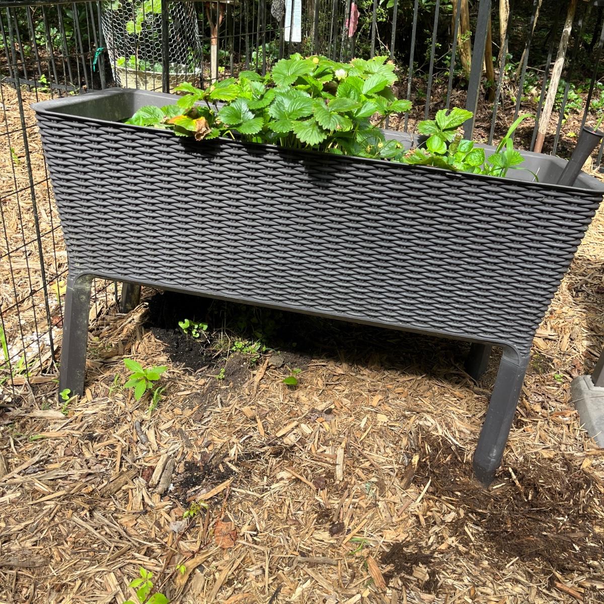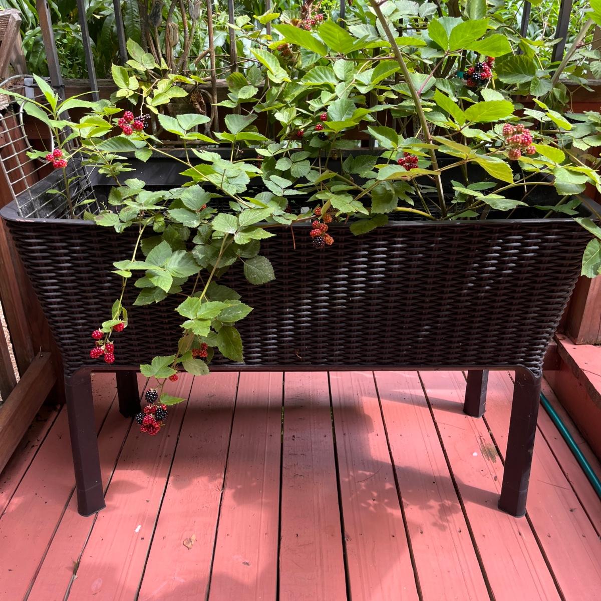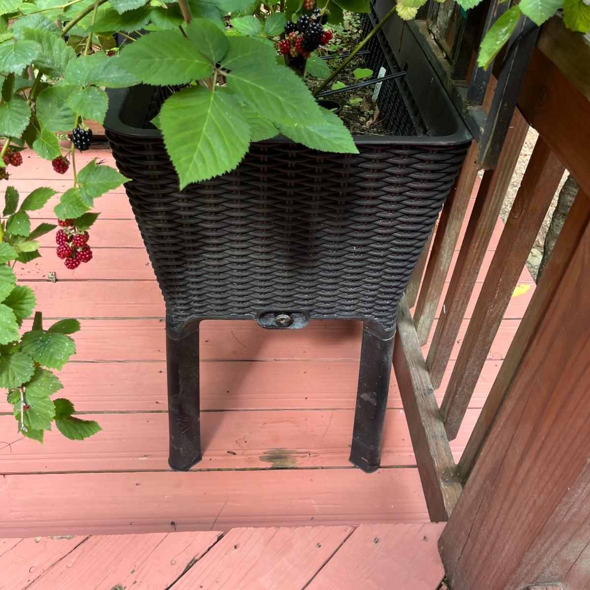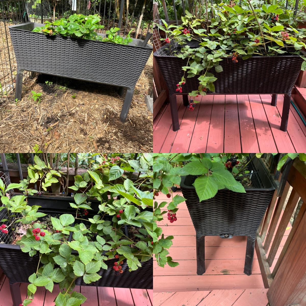 These two basket-like plastic planters with a woven look measure 44” x 19” x 30”H. One planter has blackberries growing in it. Plants and soil are included but can be dumped on sight if desired.