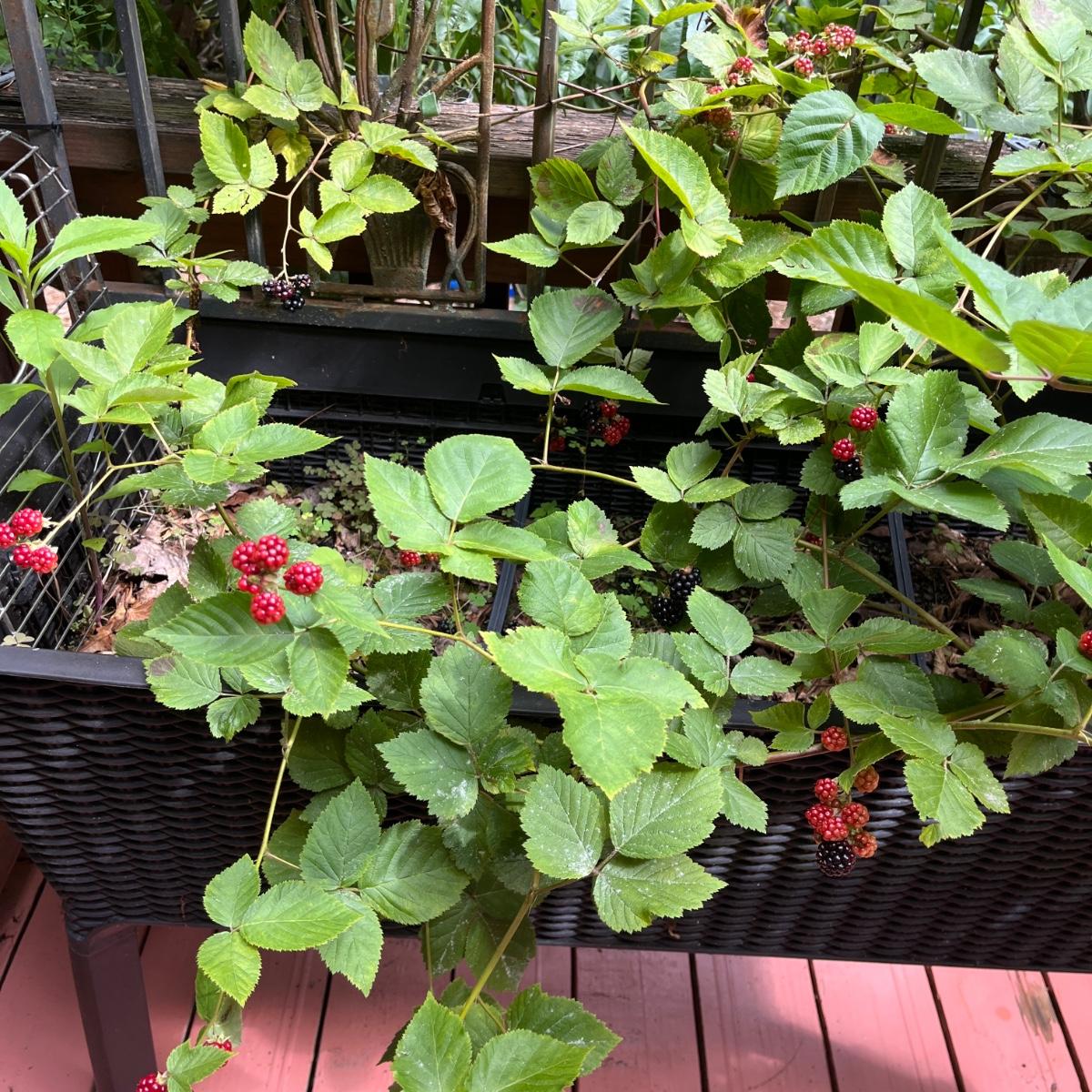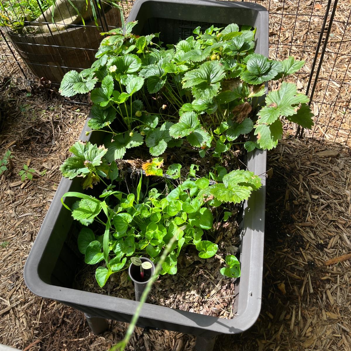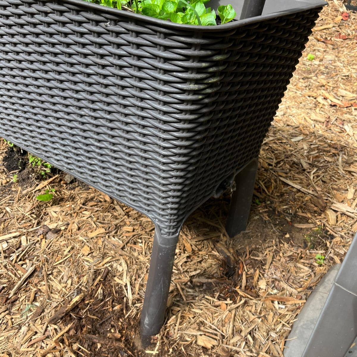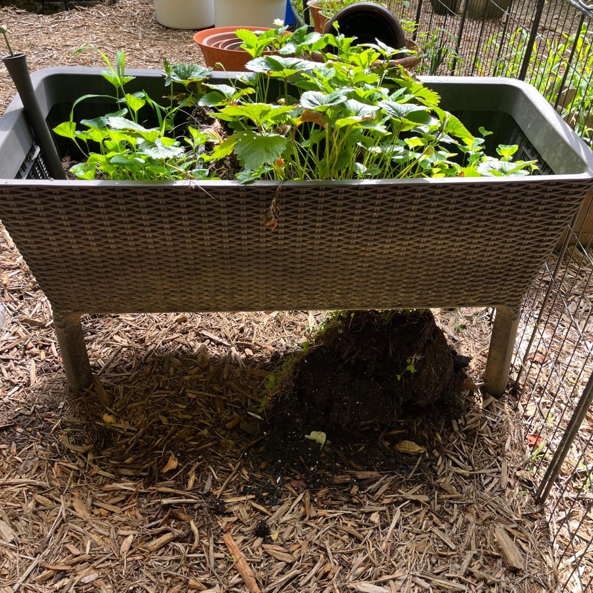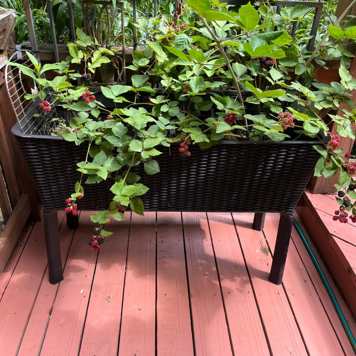 These two basket-like plastic planters with a woven look measure 44” x 19” x 30”H. One planter has blackberries growing in it. Plants and soil are included but can be dumped on sight if desired.