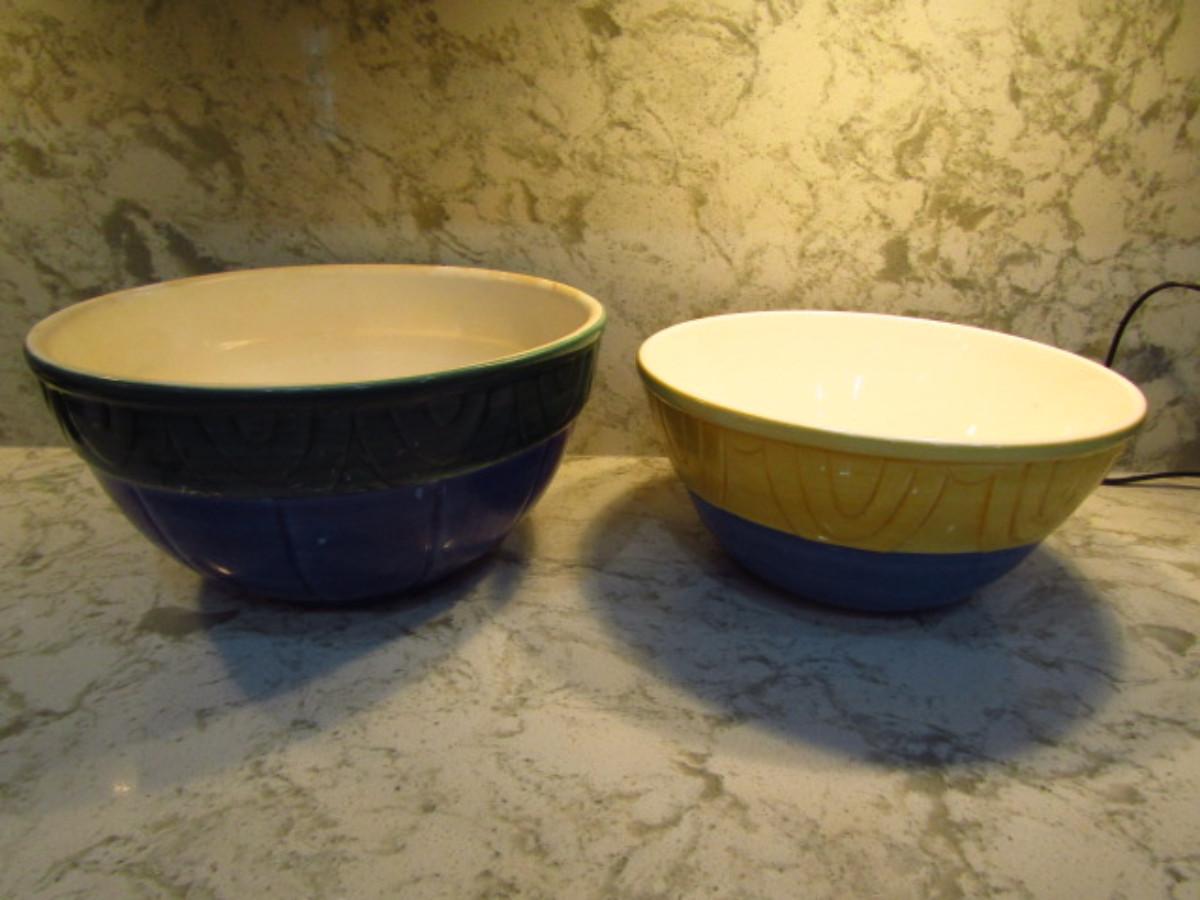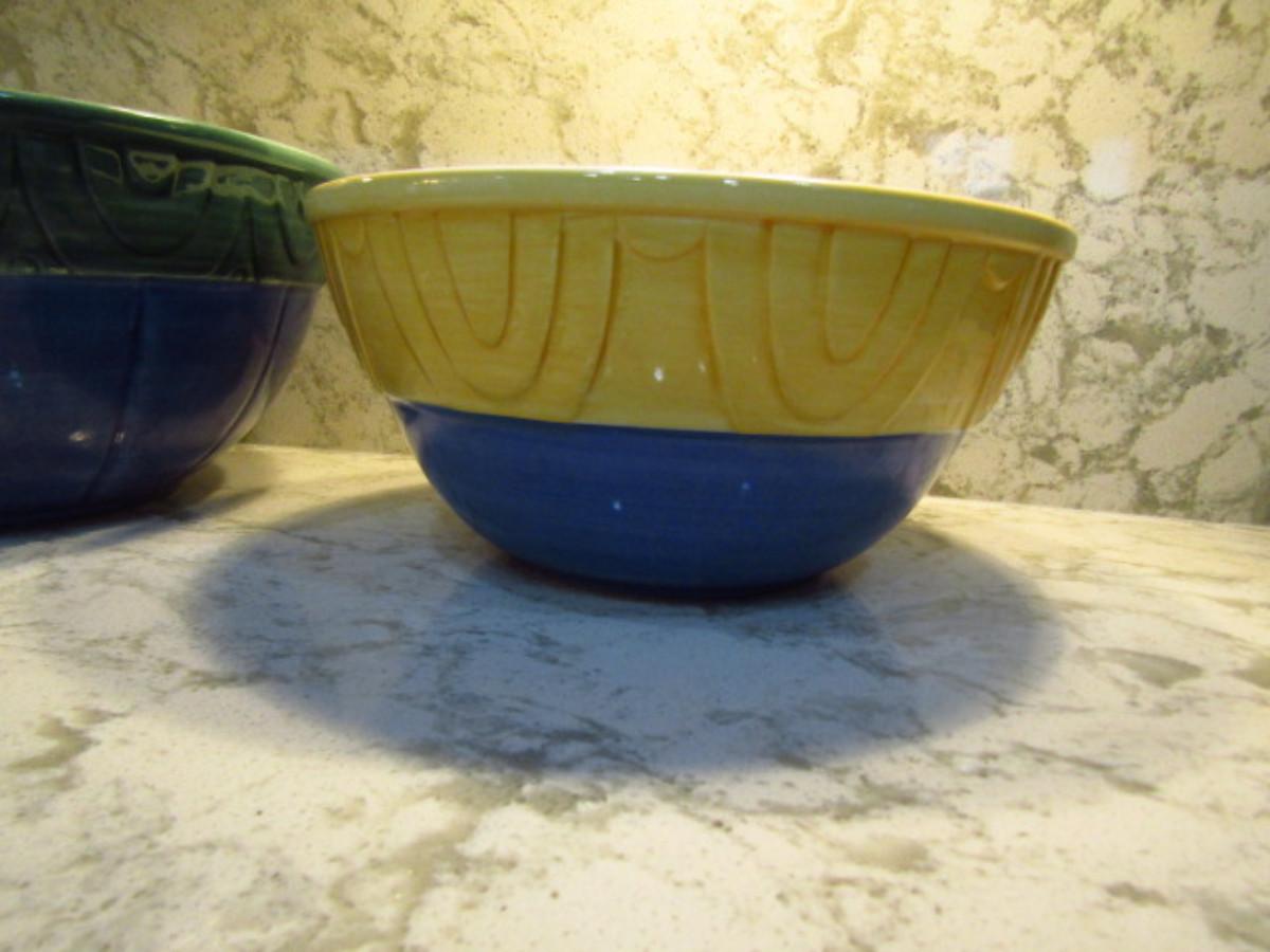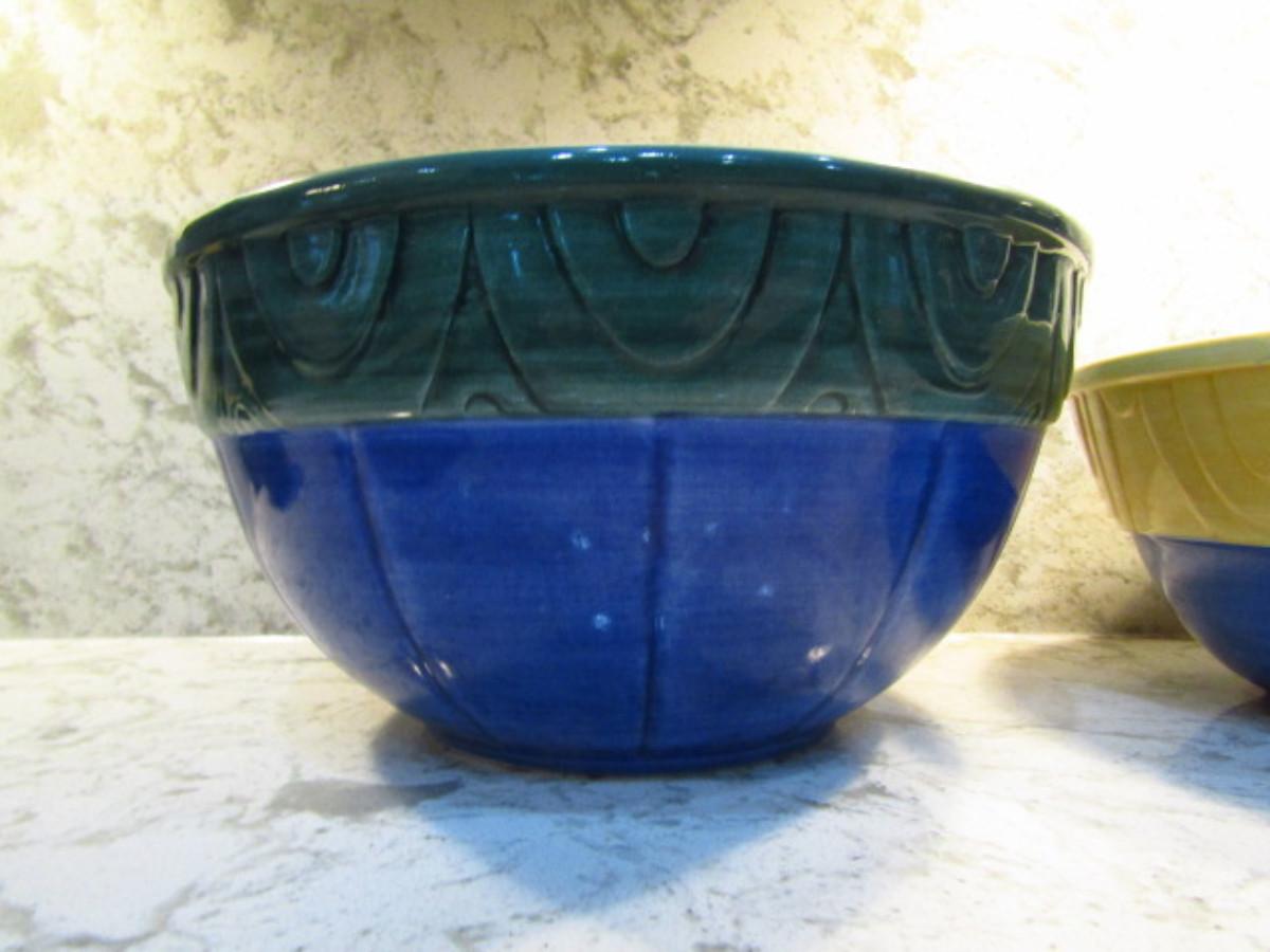 Two Large Ceramic Mixing Bowls (Kitchen). Blue and green one is approx 12" across. Yellow and blue one is approx 10 3/4" across.