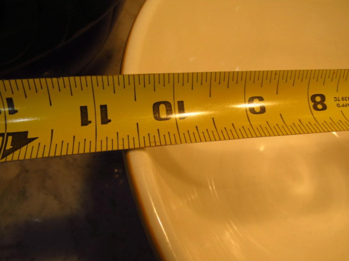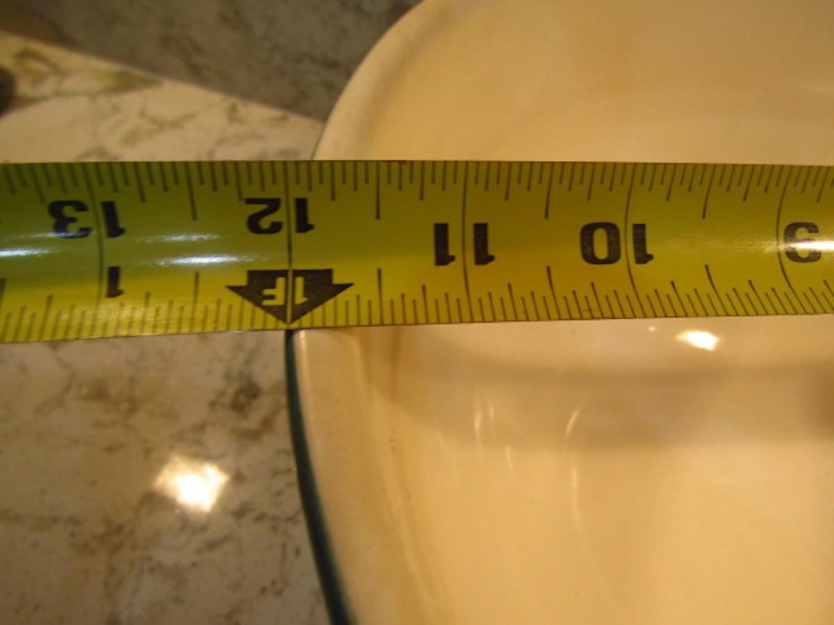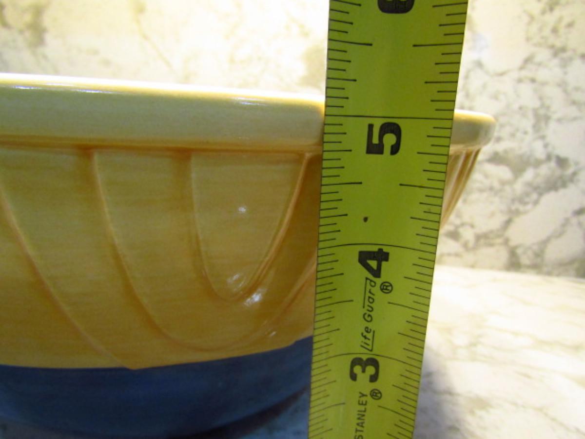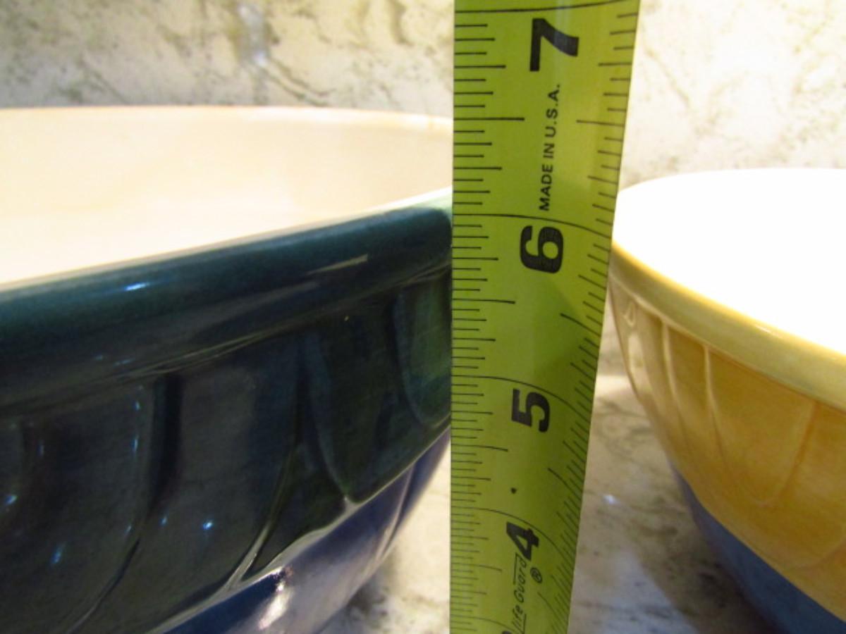 Two Large Ceramic Mixing Bowls (Kitchen). Blue and green one is approx 12" across. Yellow and blue one is approx 10 3/4" across.