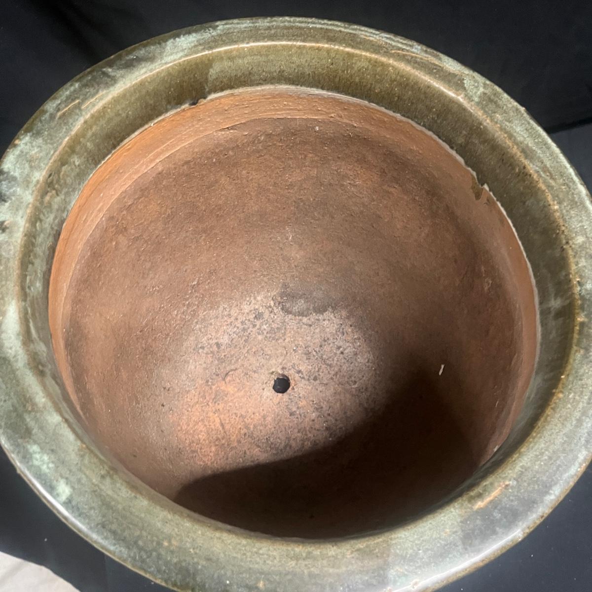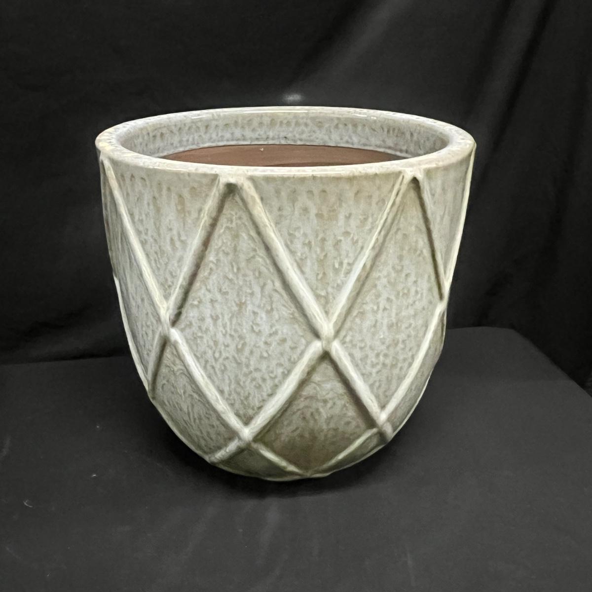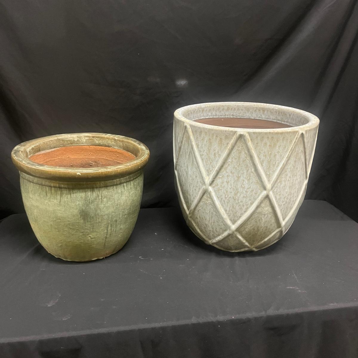 Lot includes two large plant pots that appear to be glazed terracotta with one having raised diamond design. Largest pot measures 16”D x 15.5”H.